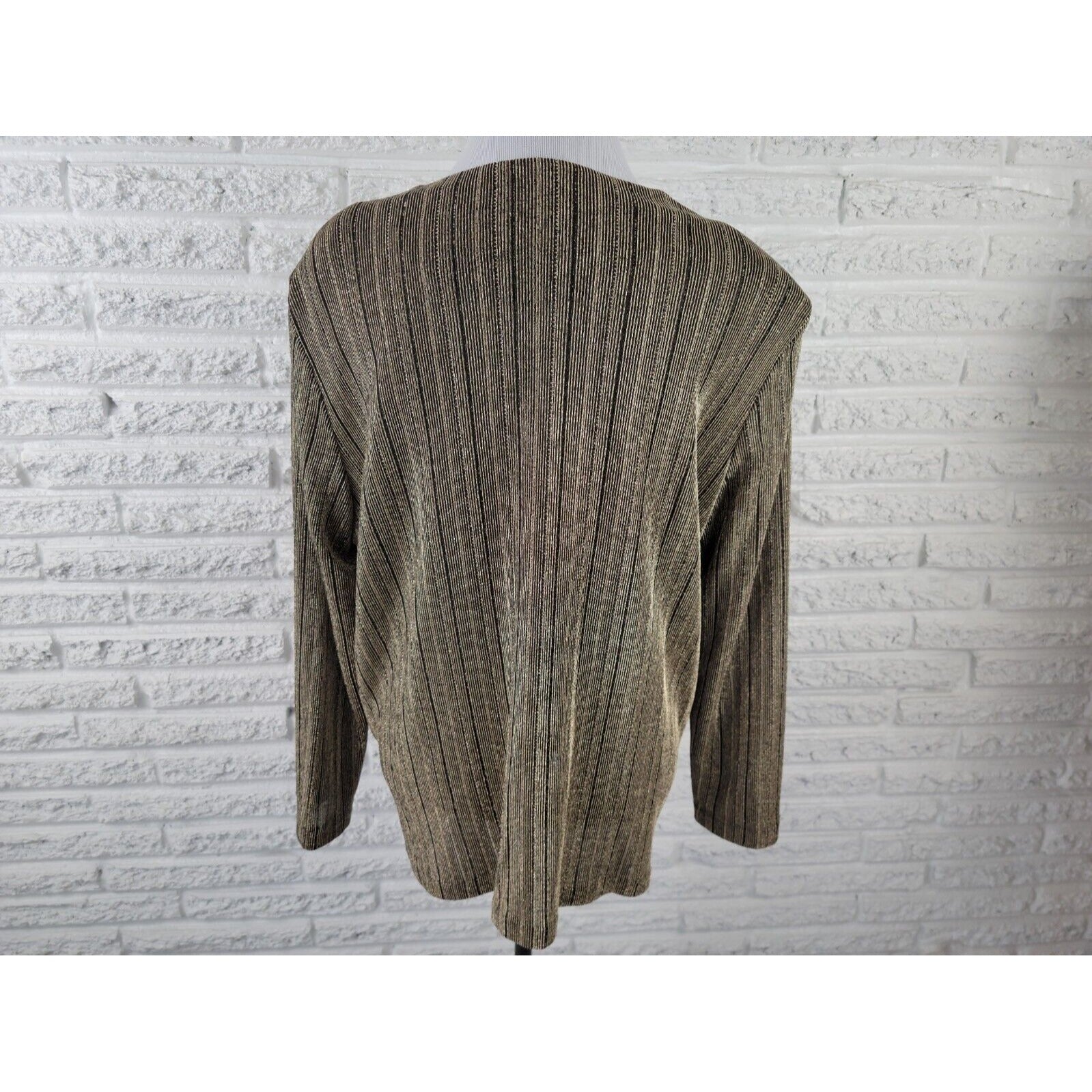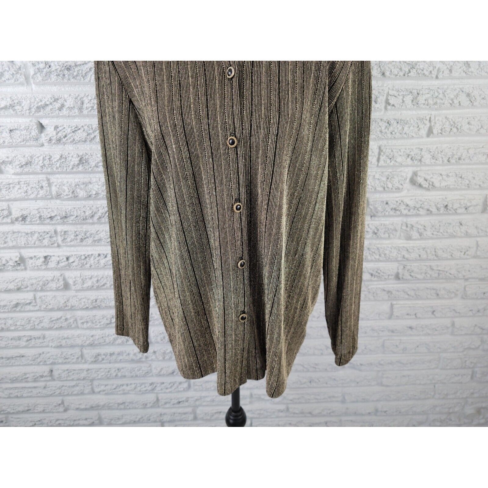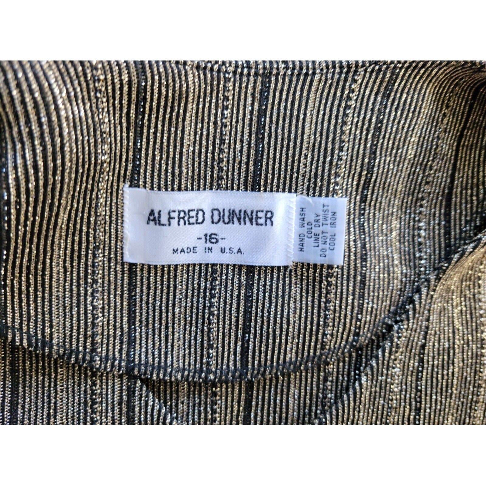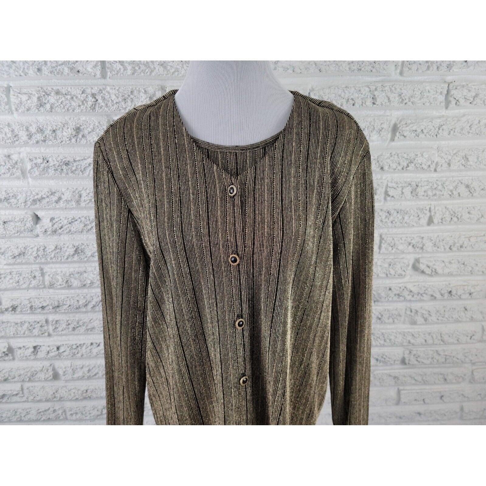 Add a touch of elegance to your wardrobe with this stunning black and gold metallic striped button-up top by Alfred Dunner. The top features a classic round neckline, long sleeves, and a fitted sleeve type for a comfortable and flattering fit. The polyester blend material is stretchy and suitable for all seasons, making it perfect for parties, formal occasions, business meetings, or any other event. This top is a size 16 and has been well cared for with hand wash only. Its stylish design and high-quality construction make it a must-have for any fashion-forward woman. Don't miss out on adding this versatile and chic piece to your closet!