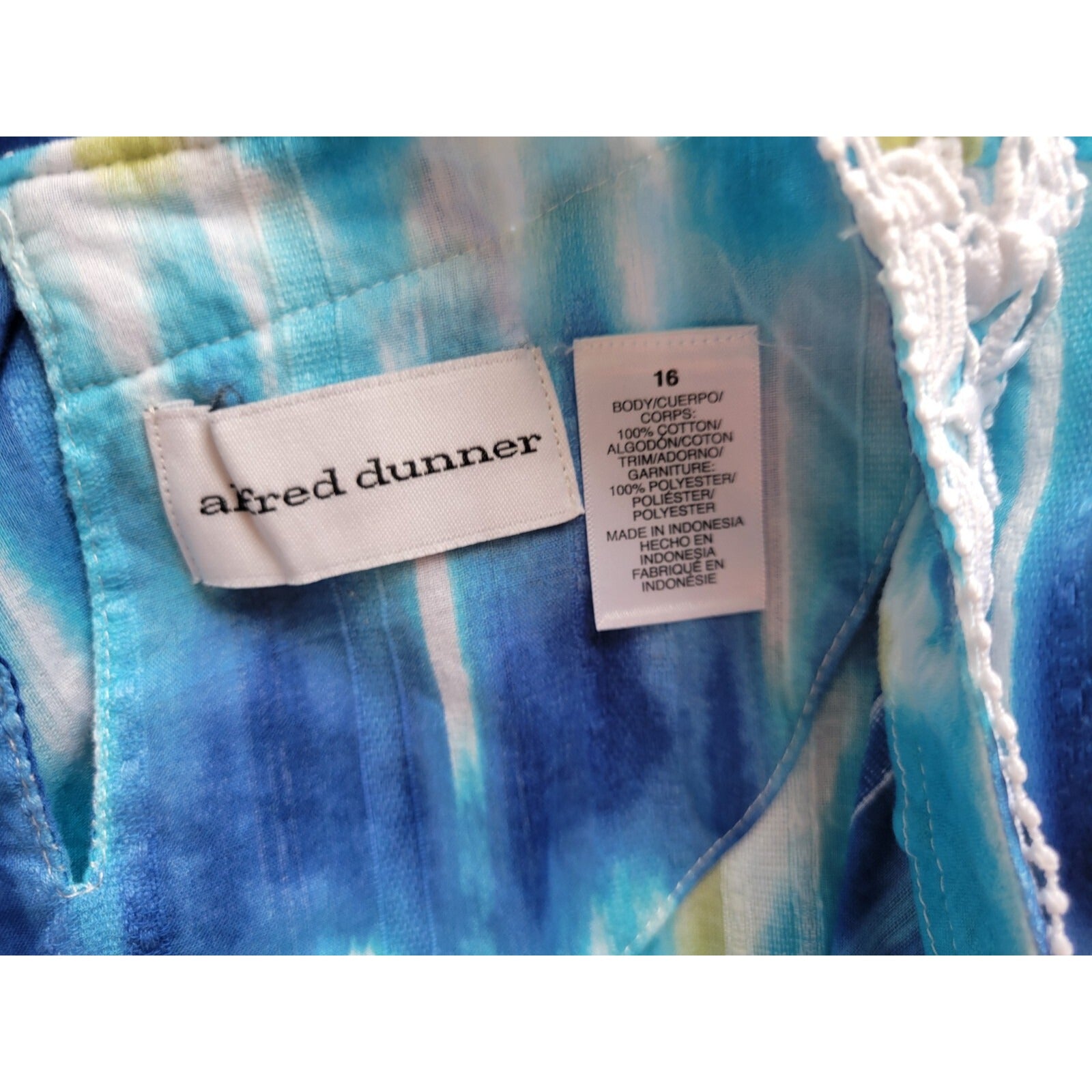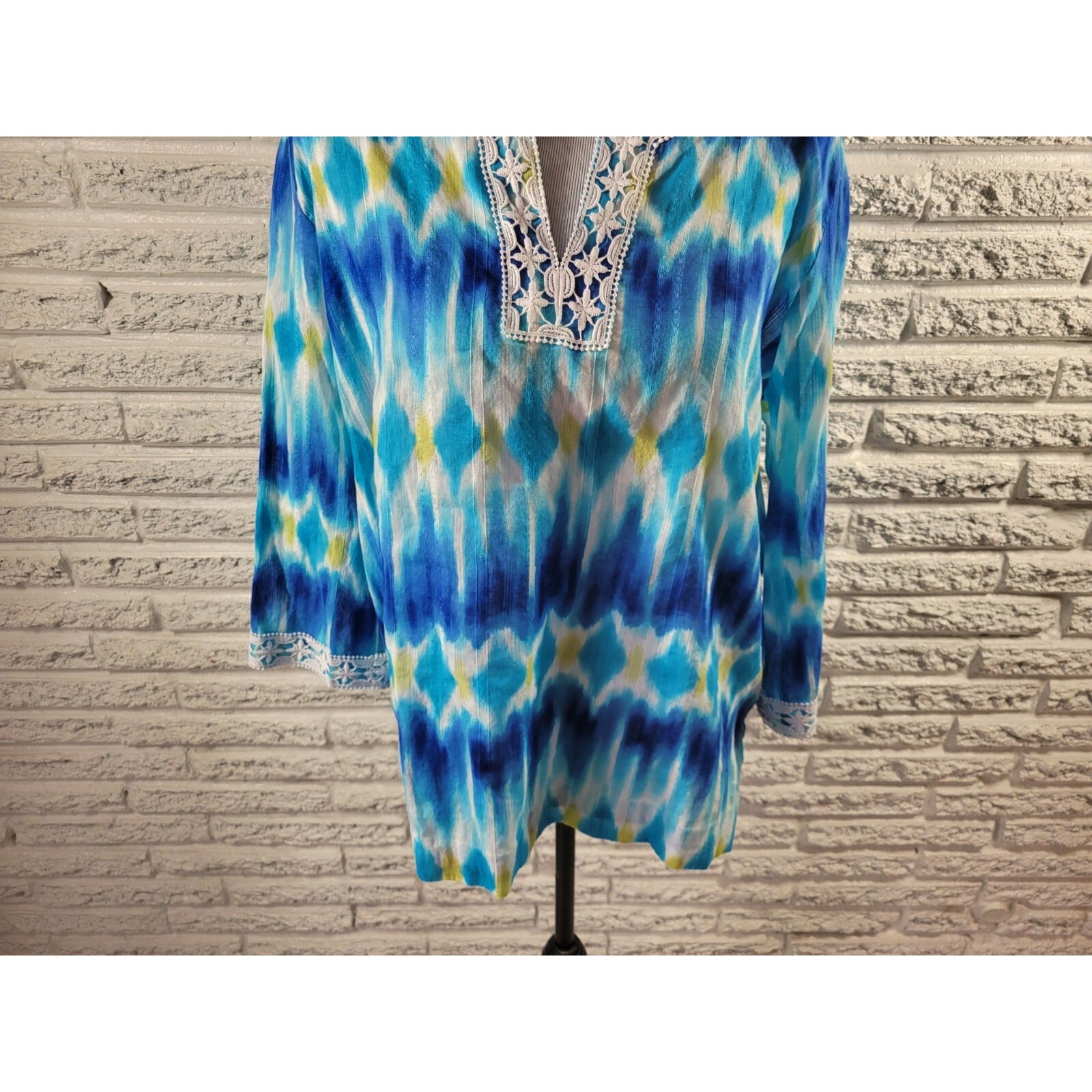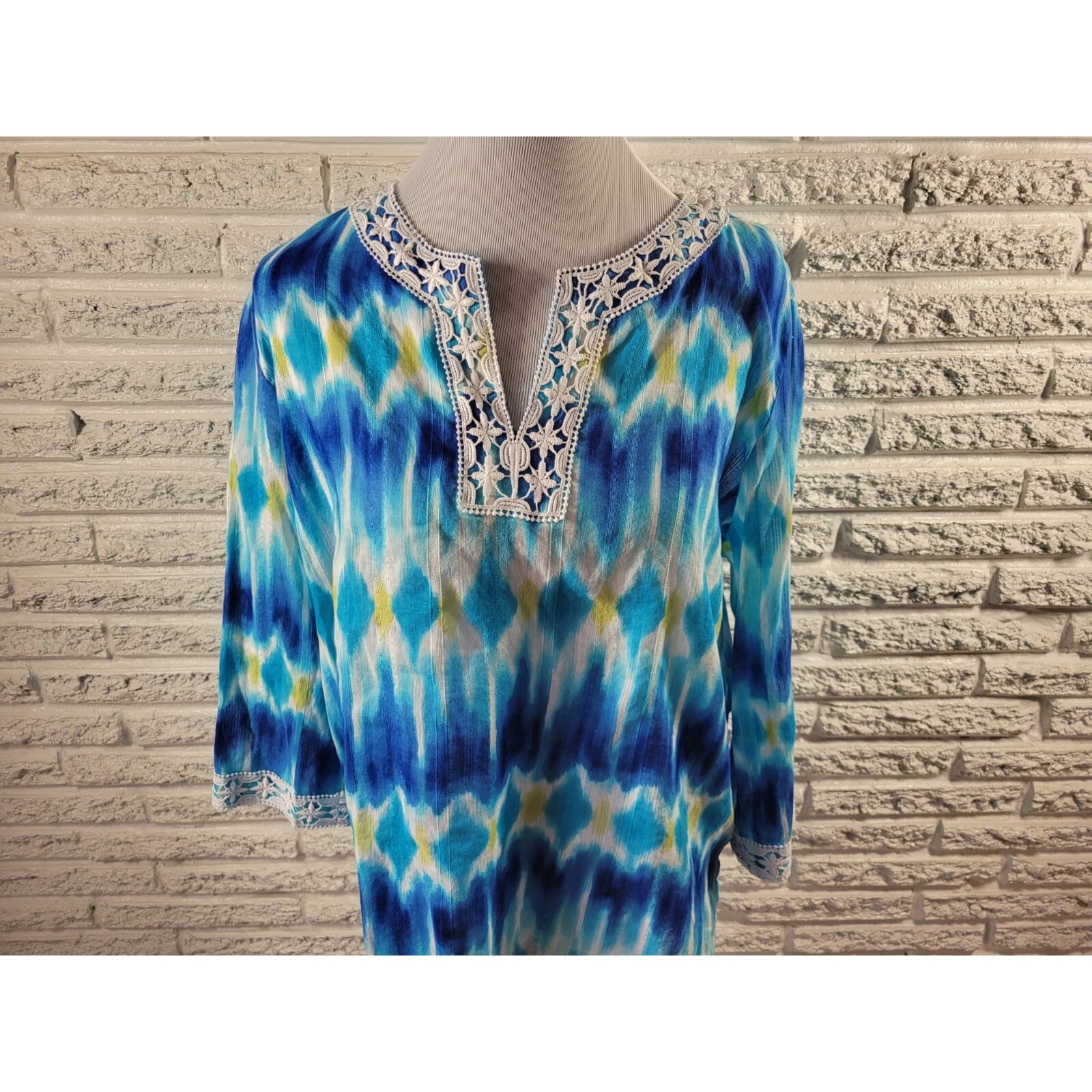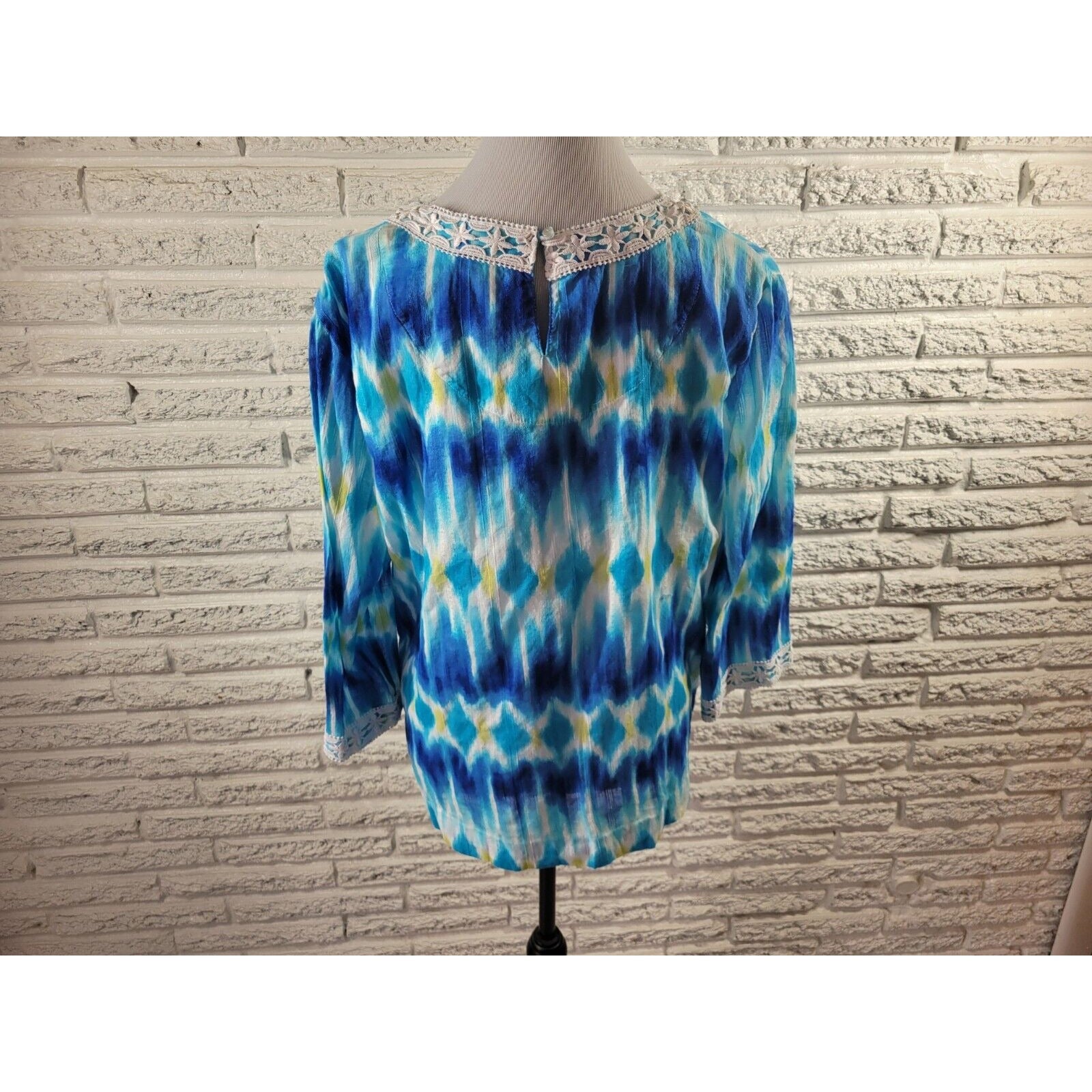 Alfred Dunner Womens Top 16 Tunic 3/4 Sleeve Blue Watercolor Crochet Cotton