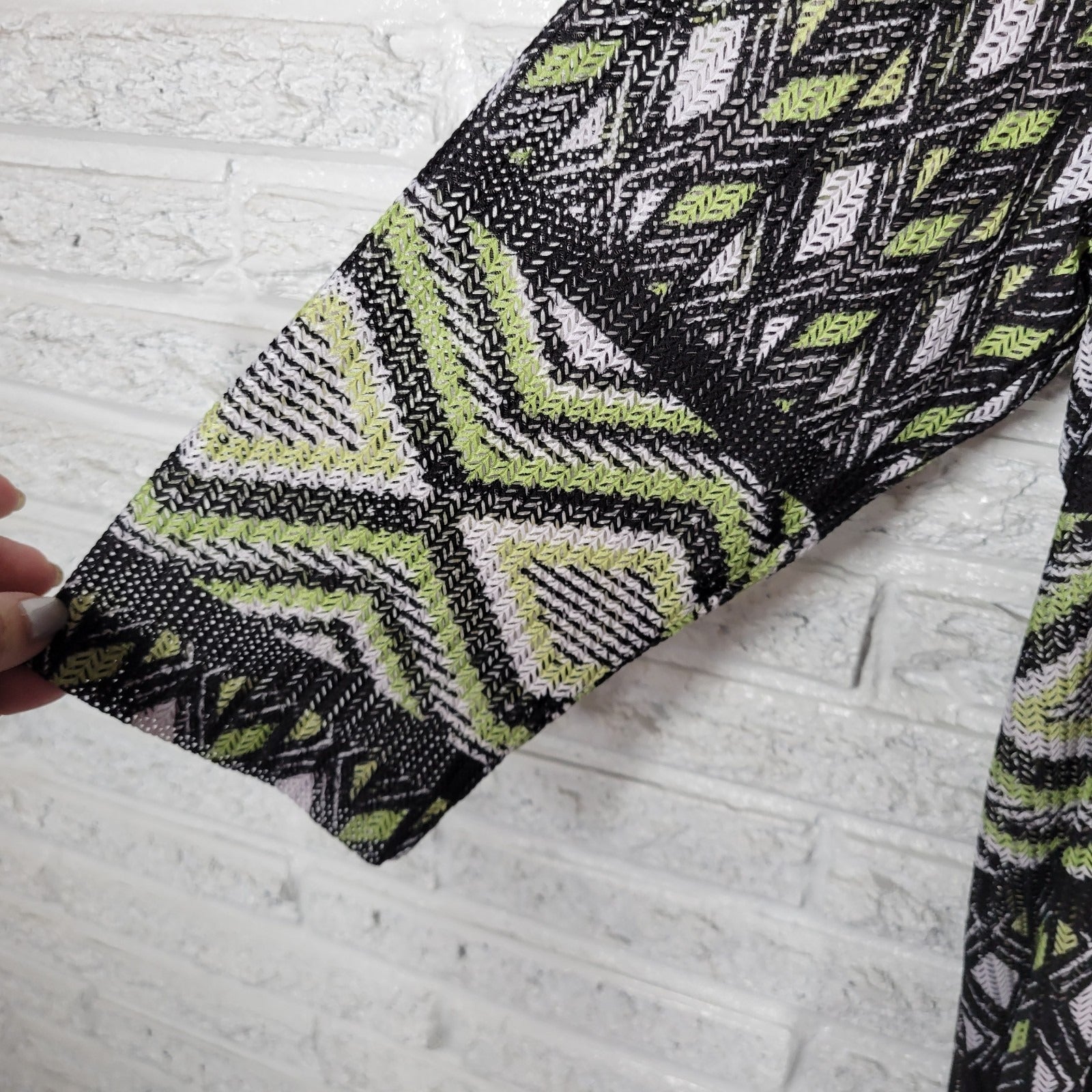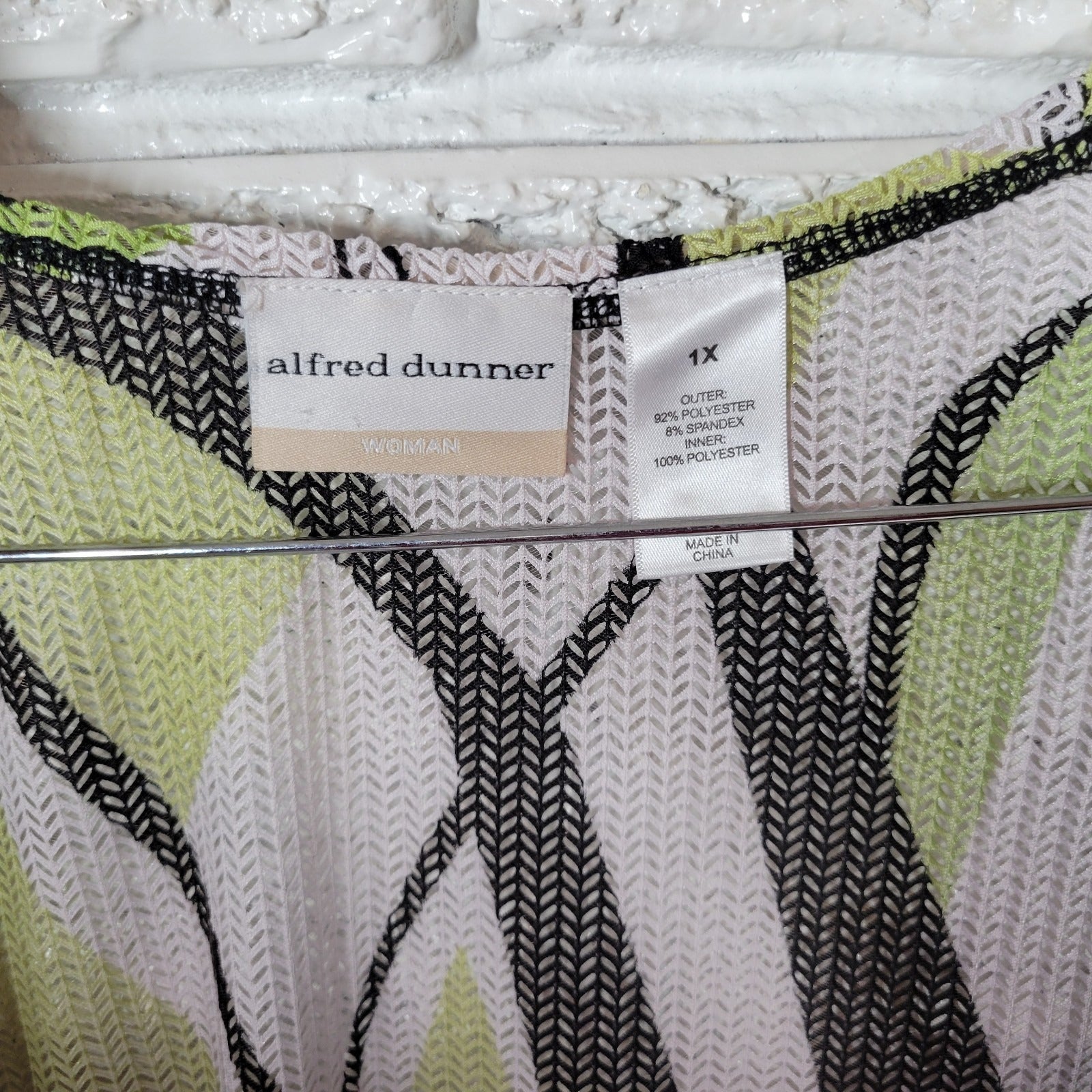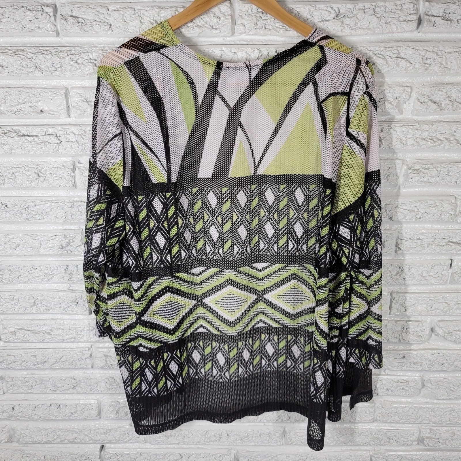The Alfred Dunner Women's Top in size 1X Plus is a stylish and versatile piece perfect for various occasions such as travel, casual outings, or business meetings. This green/black geometric mesh top features a sheer design that adds a touch of elegance, while the 3/4 sleeve and polyester blend material provide comfort and ease of movement. Hand wash only to maintain the quality of this basic top, which is a must-have in any woman's wardrobe for all seasons.