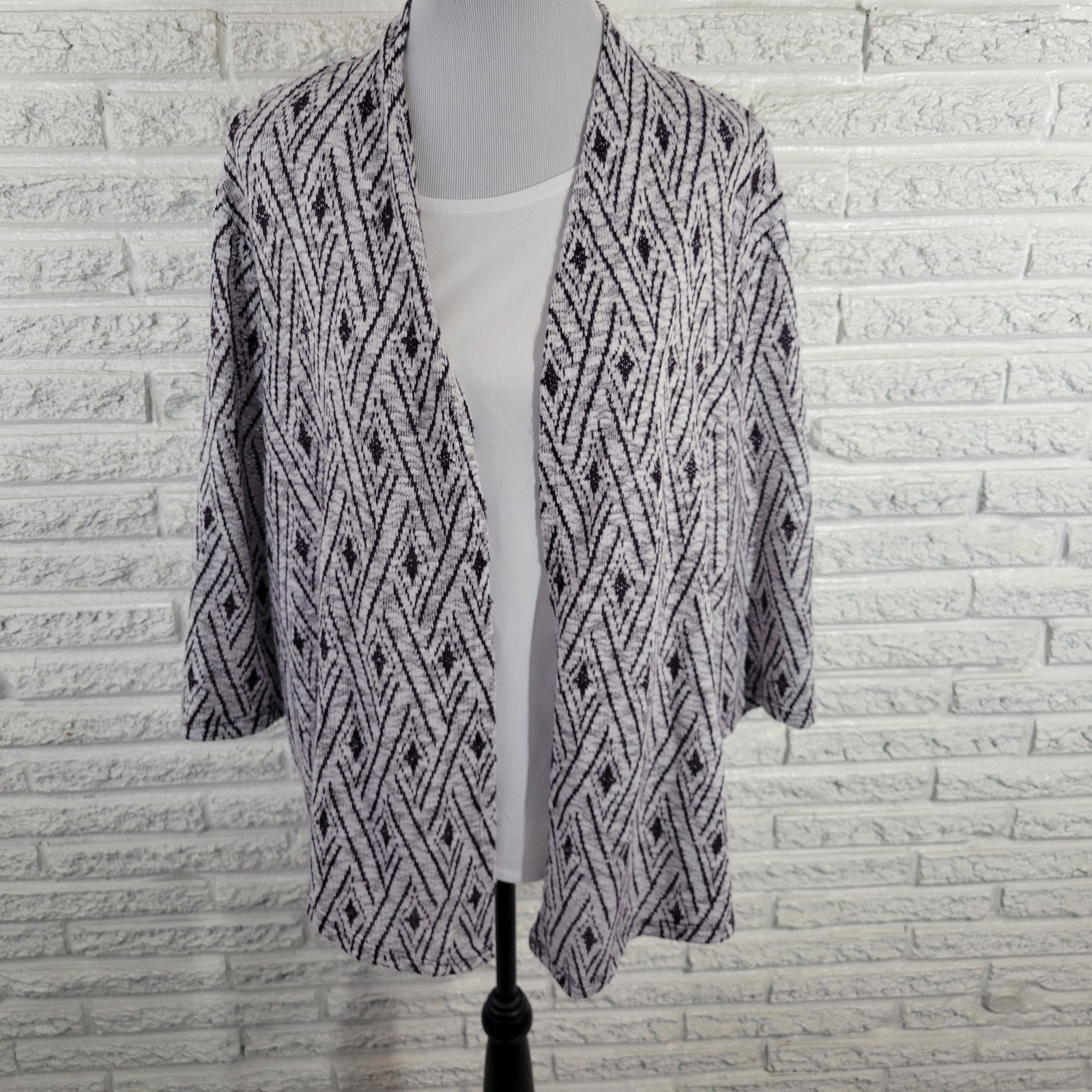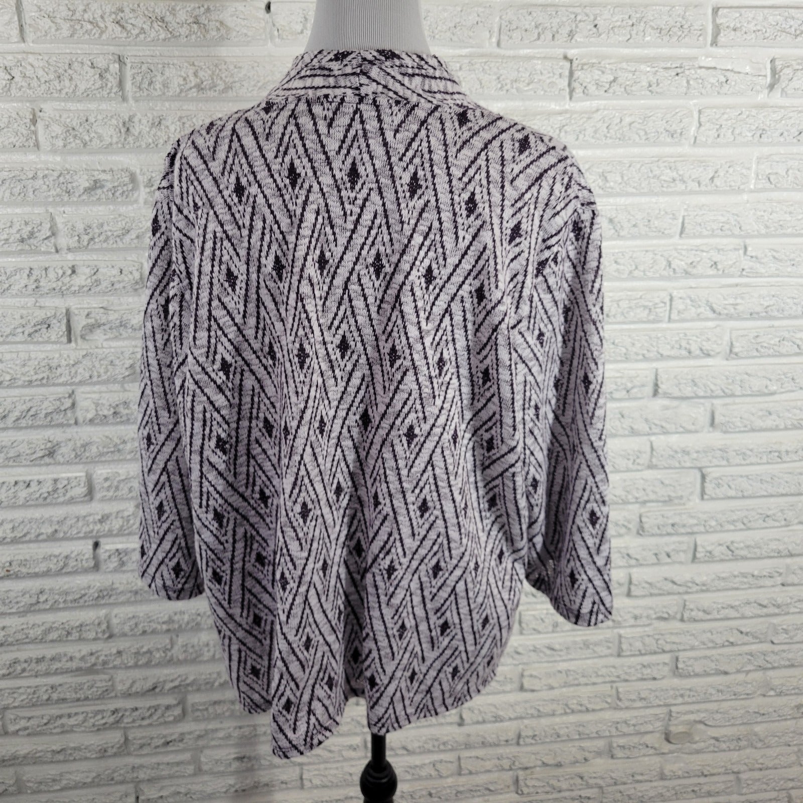 The Alfred Dunner Women's Top in 2X Plus size features a stylish geometric purple/white diamond pattern, perfect for travel and casual occasions. Made of comfortable polyester material, this pullover blouse has a round neckline and 3/4 casual sleeves, offering a regular fit for all seasons. With stretch fabric and a versatile style, this top from Alfred Dunner is a great addition to any woman's wardrobe, suitable for winter, summer, fall, and spring. This top combines style and comfort for everyday wear.