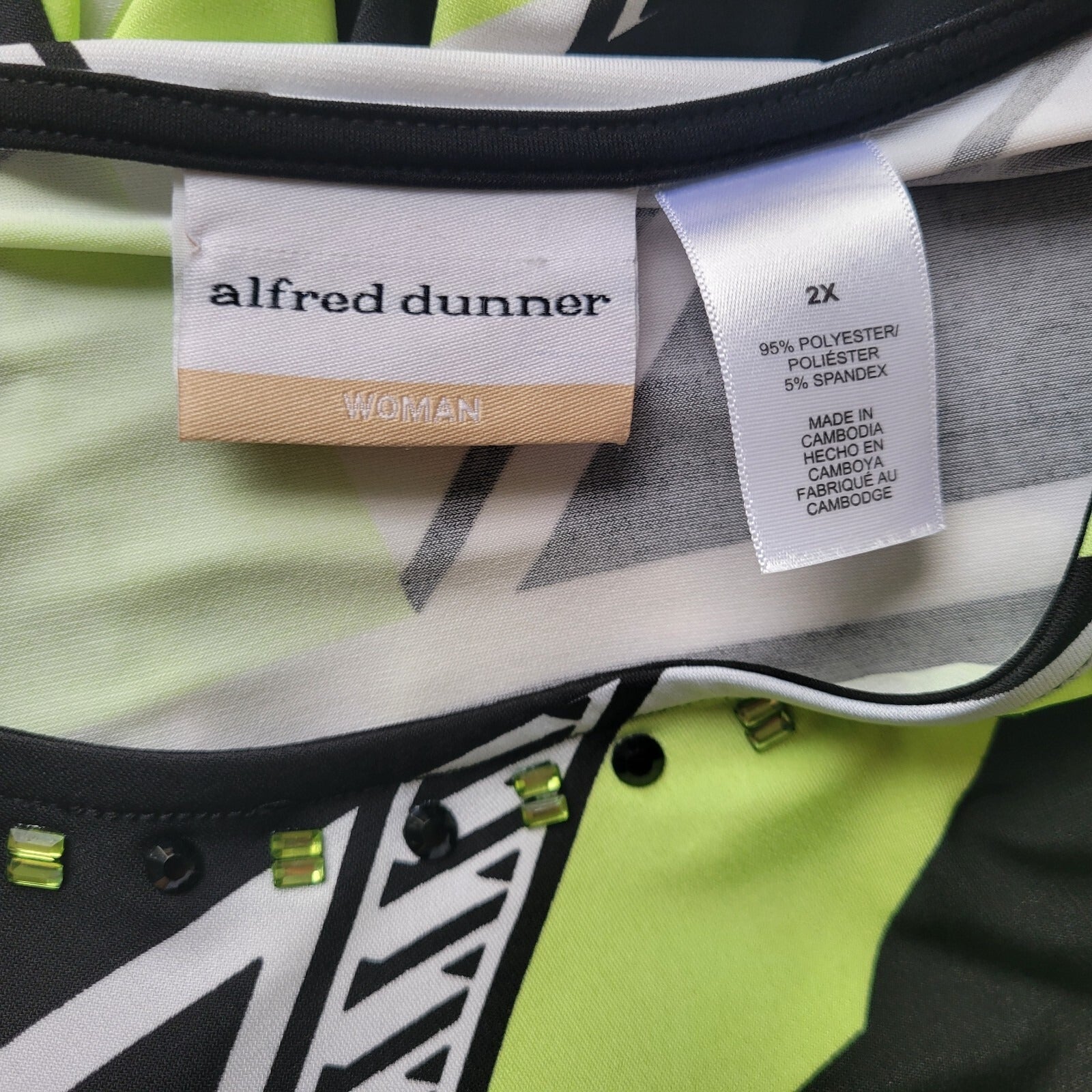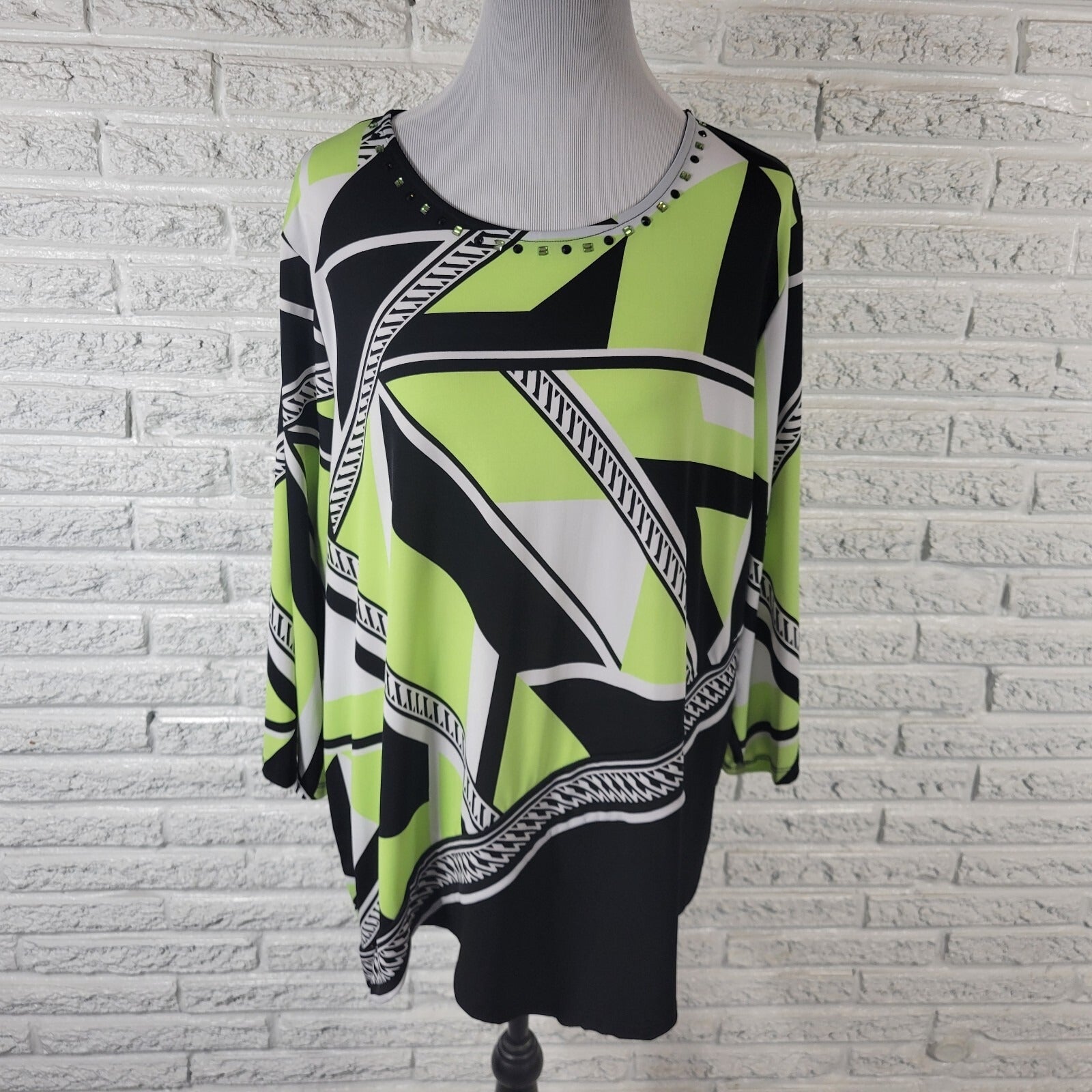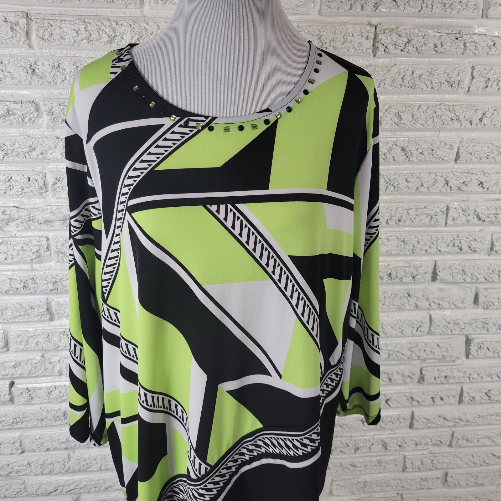 Alfred Dunner Womens Top 2X Plus Long Sleeve Green Geometric Beaded Poly Blend
