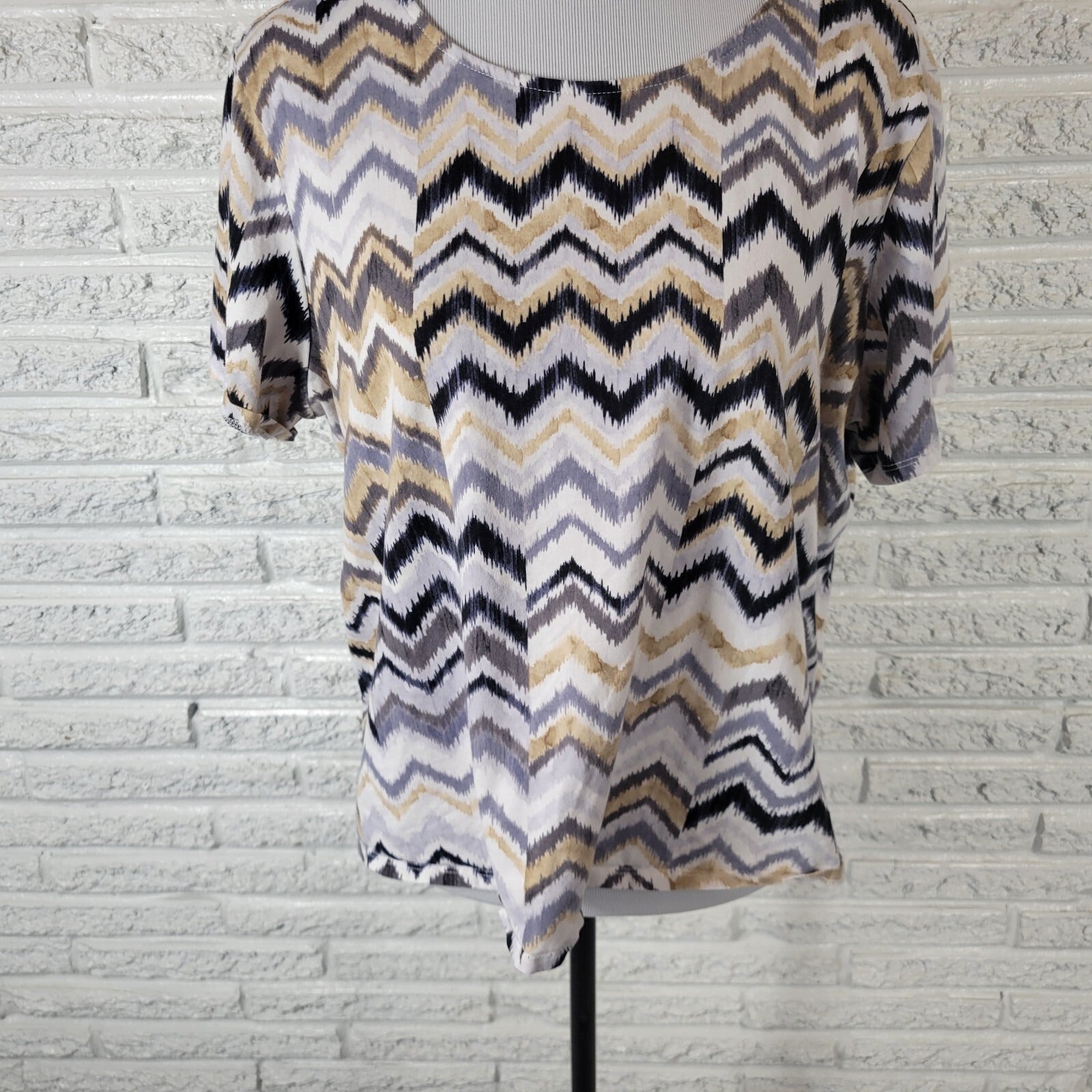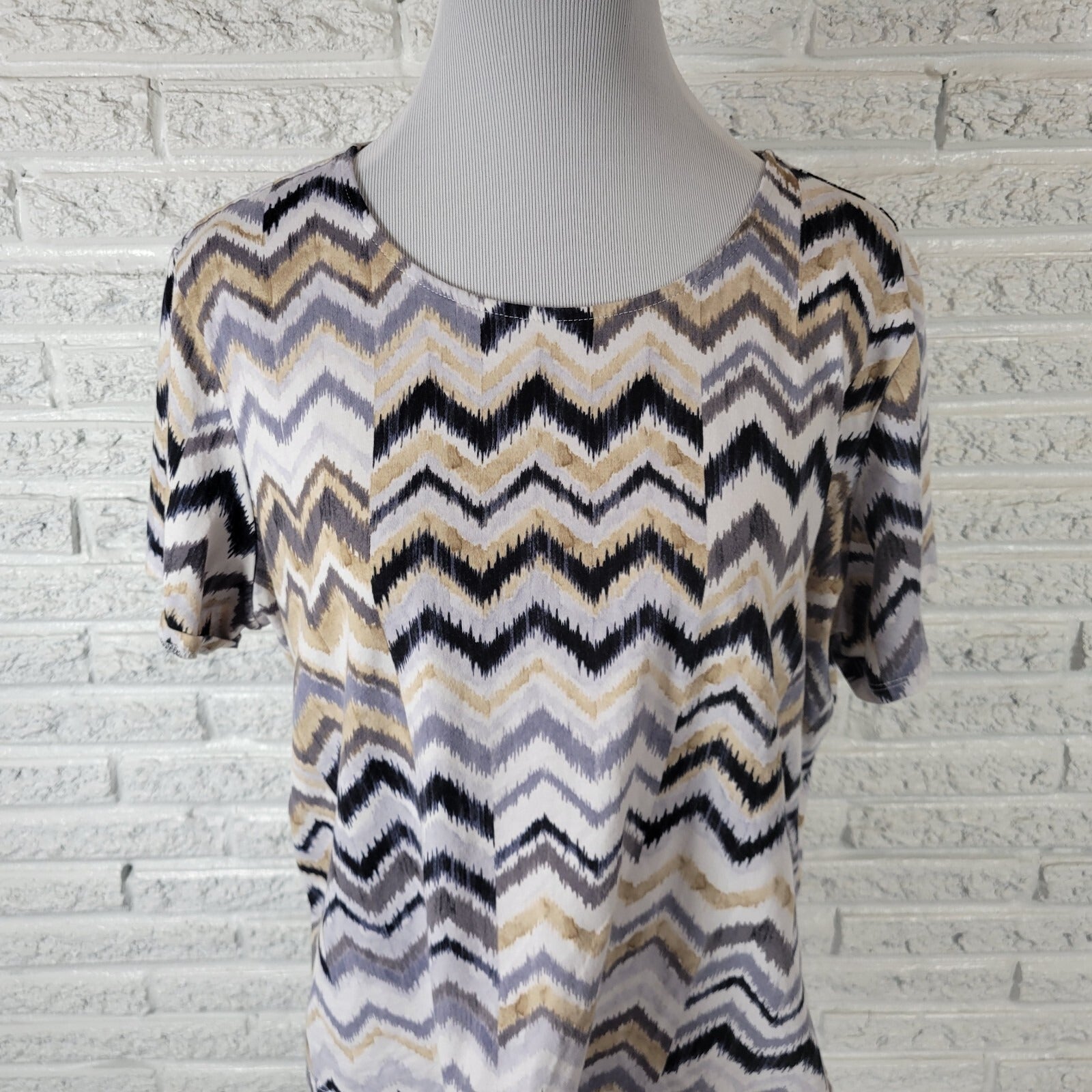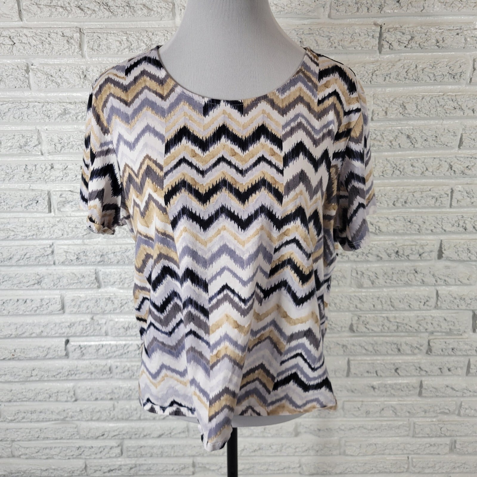 Alfred Dunner Womens Top PXL Petite Tee Short Sleeve Tan Black Zig Zag Casual