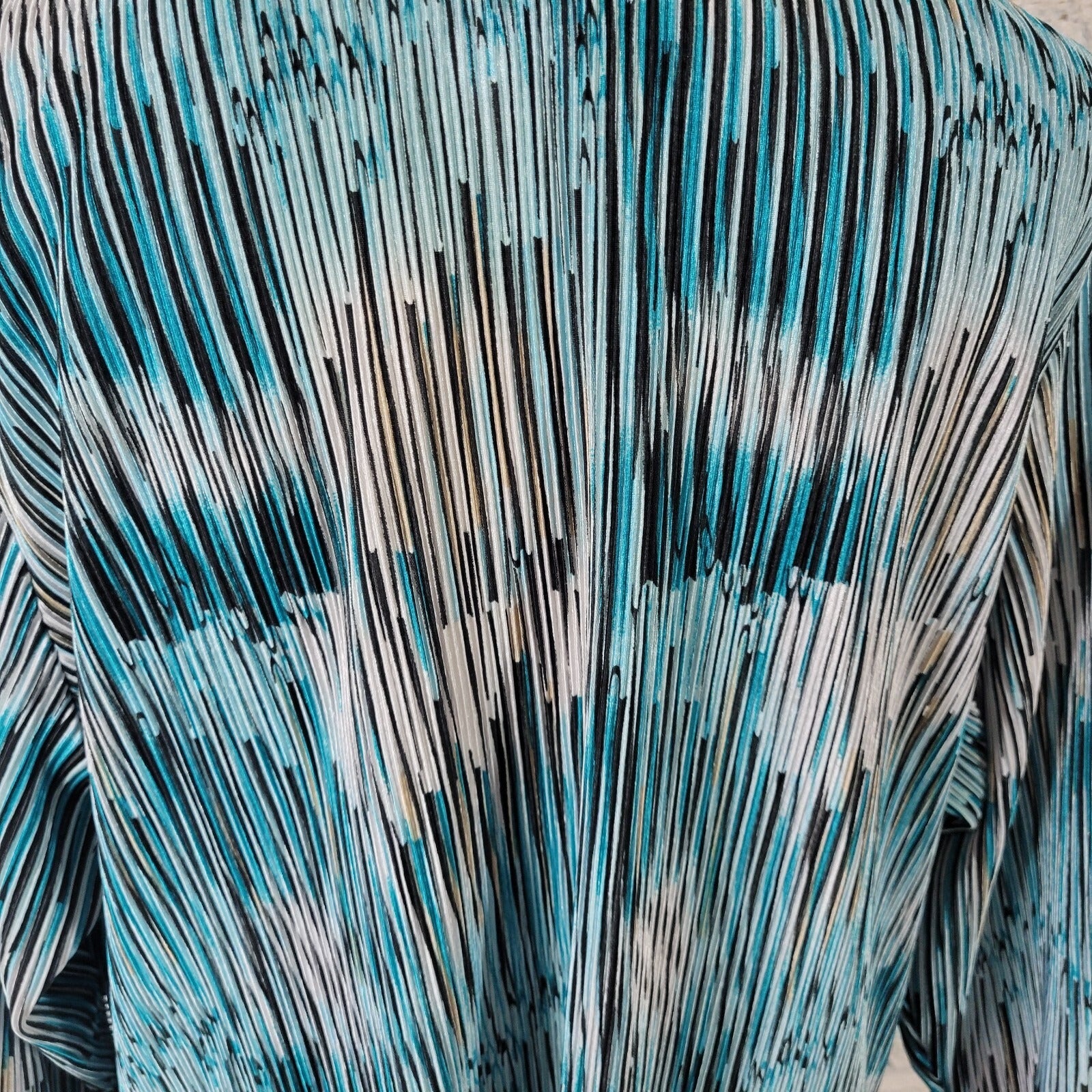 The Allison Daley II Women's Top in size 2X features a blue and black striped pattern, 3/4 sleeves, and a round neckline with a pullover closure. Made of lightweight polyester material, this blouse is designed for regular fit and is suitable for travel, casual, and business occasions. With its versatile style and stretchy fabric, this top is perfect for all seasons and is machine washable for easy care. Perfect for women looking for a comfortable and stylish addition to their wardrobe.