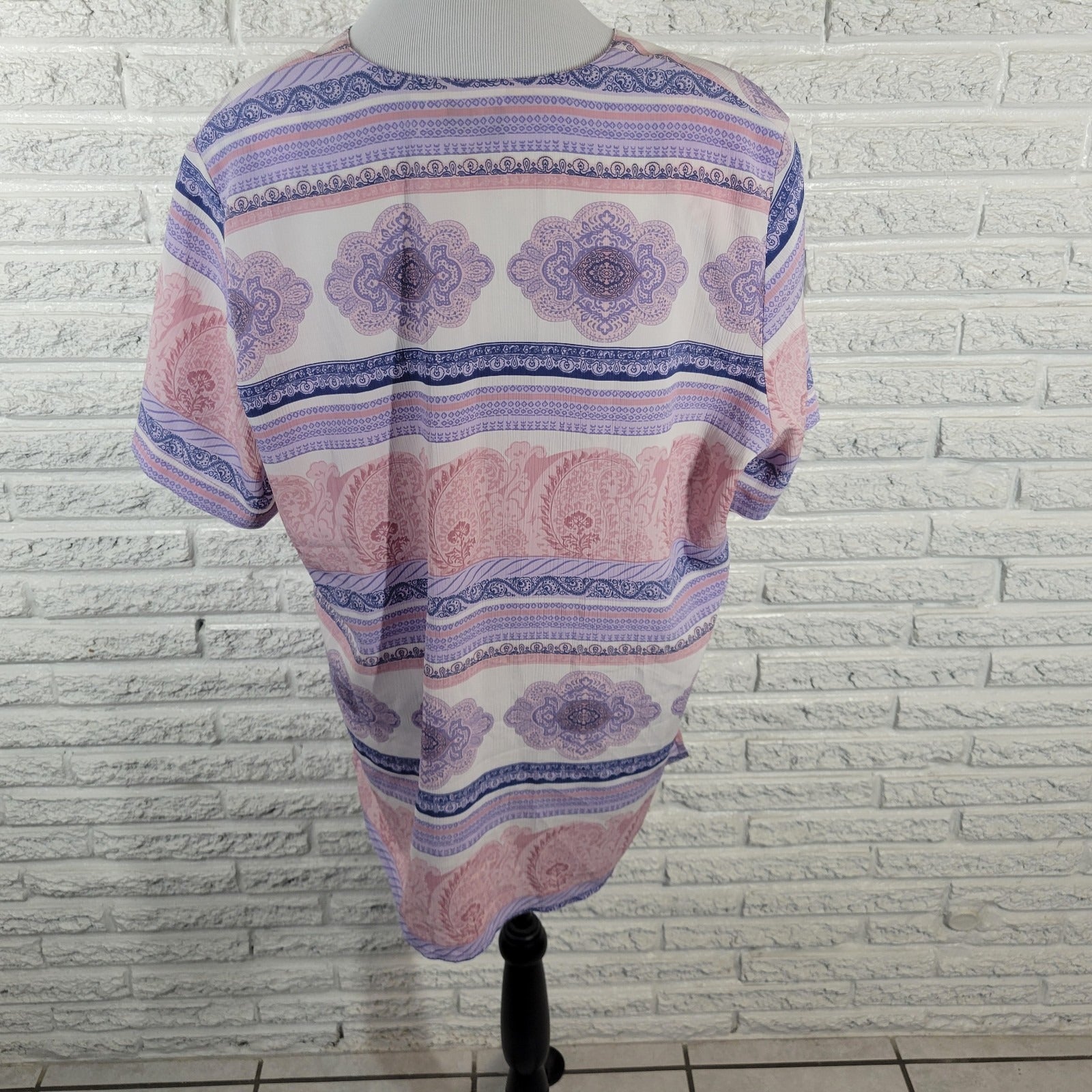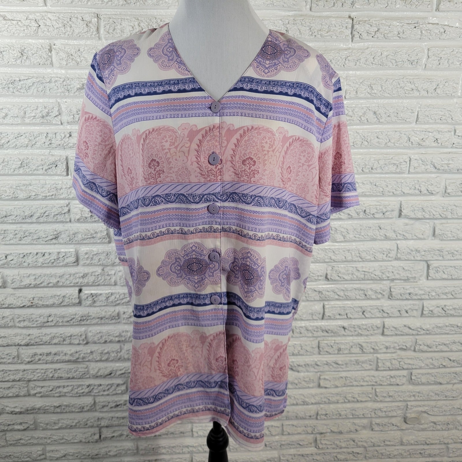 The Allison Daley Women's Top in size 18 Plus features pastel lavender/ pink colors with geometric pattern, short sleeves, V-neckline, and button closure. Made of polyester, this regular fit button-up top is suitable for various occasions such as travel, casual outings, and business meetings. The addition of shoulder pads adds a touch of sophistication and style to this basic yet versatile top, making it a practical choice for all seasons. Perfect for a stylish and comfortable office look.
