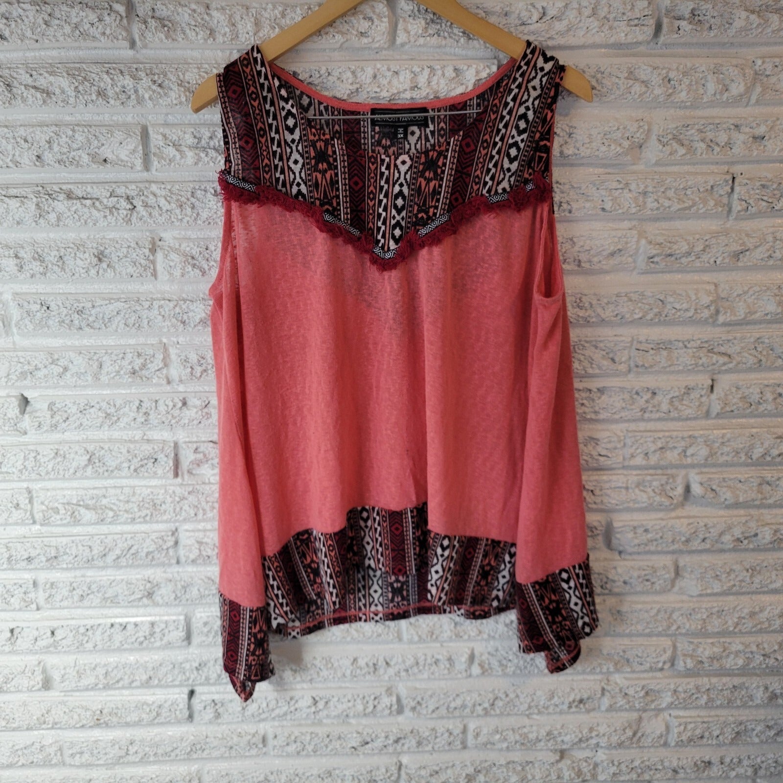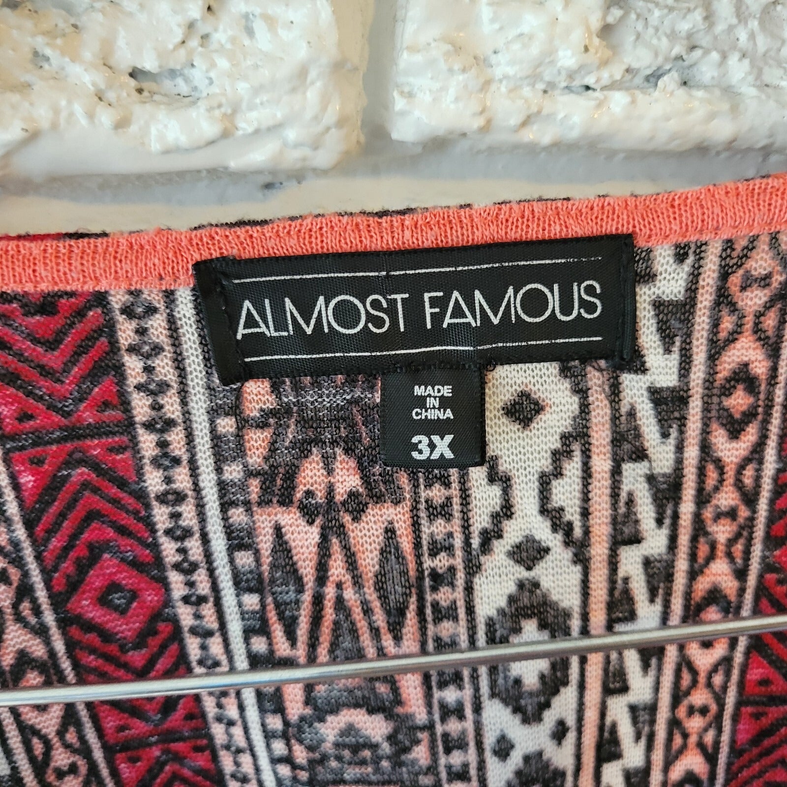 The product is a women's tank top by Almost Famous in size 3X. It features a boho pink burgundy geometric pattern with fringe accents, round neckline, and sleeveless design. Made from polyester, it is lightweight, stretchy, and sheer, making it suitable for all seasons. The pullover closure and regular fit make it ideal for casual or travel occasions, while the basic style ensures versatility in wearing it.