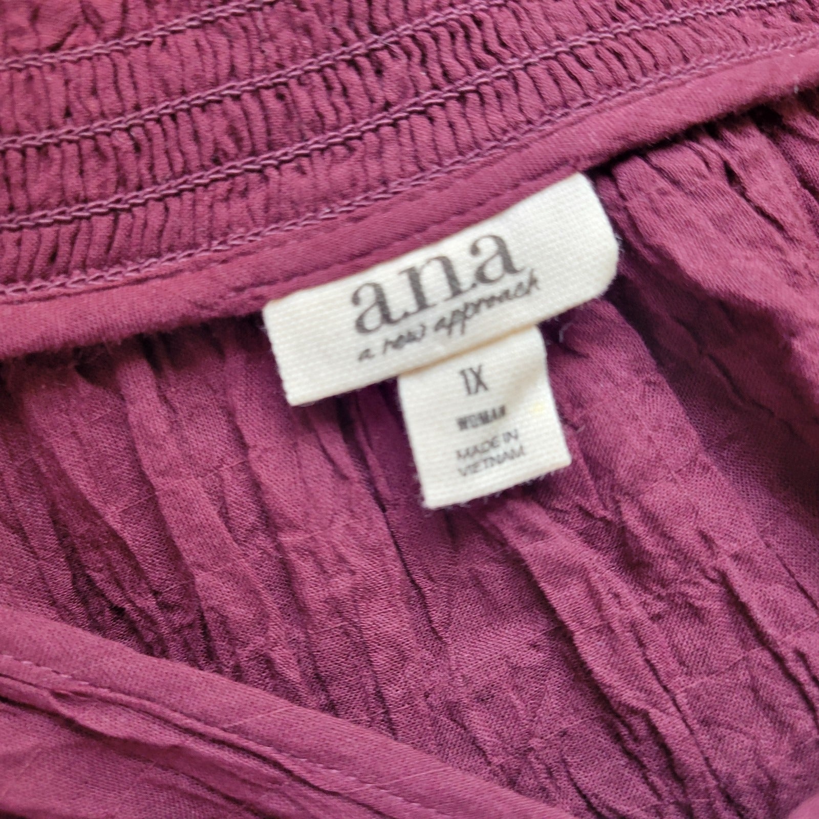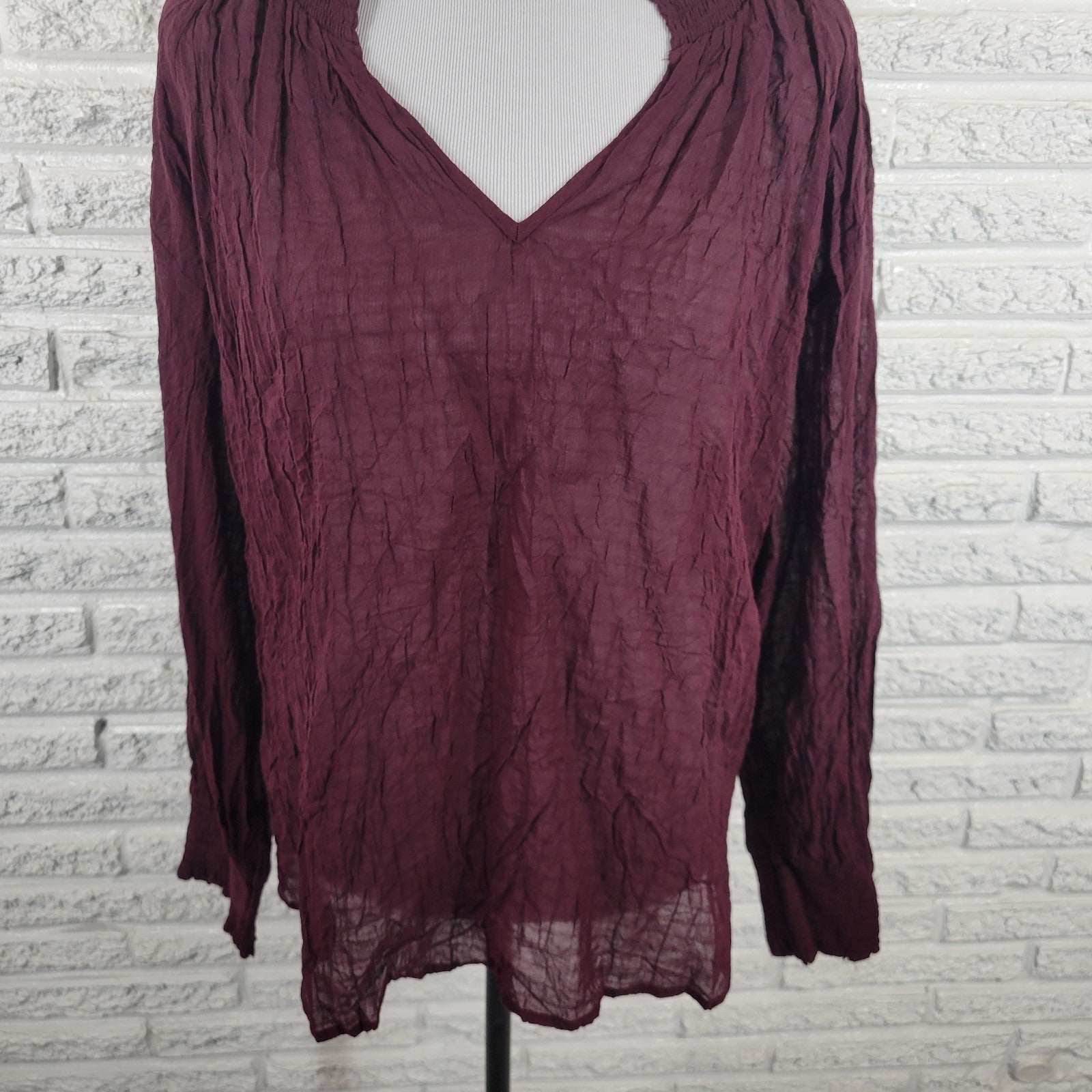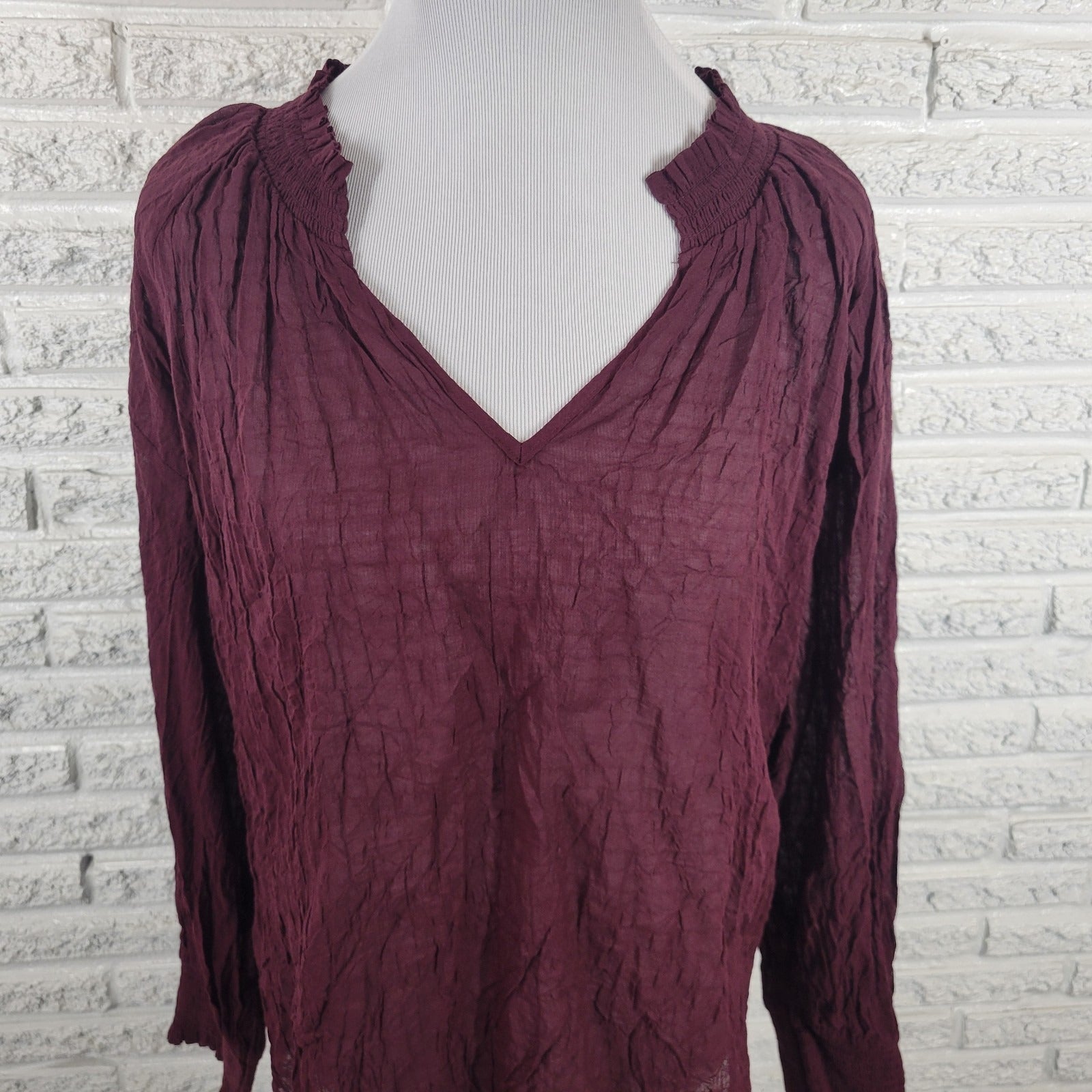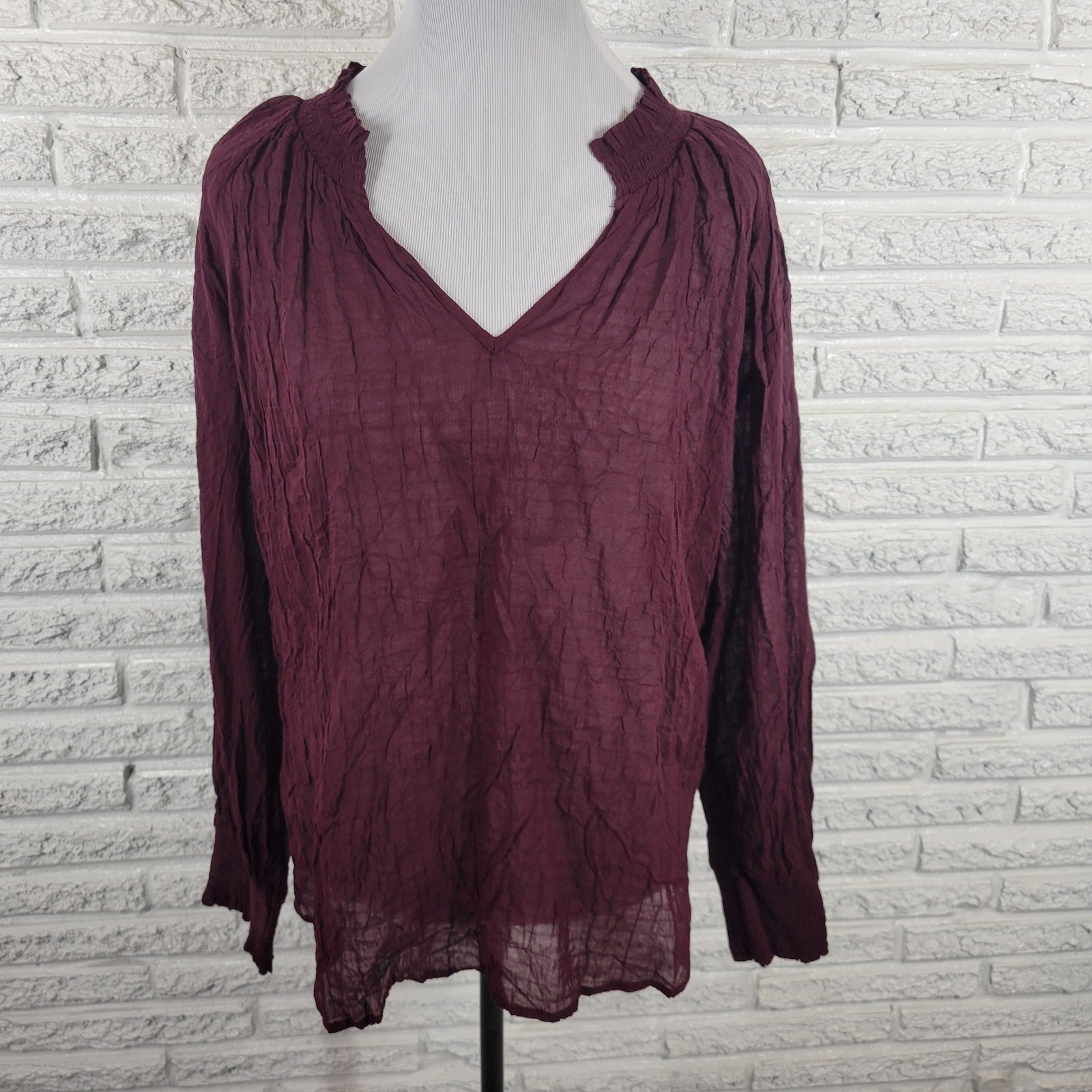 Ana Womens Top 1X Plus Long Sleeve Burgundy Frilly Neckline Sheer Lightweight