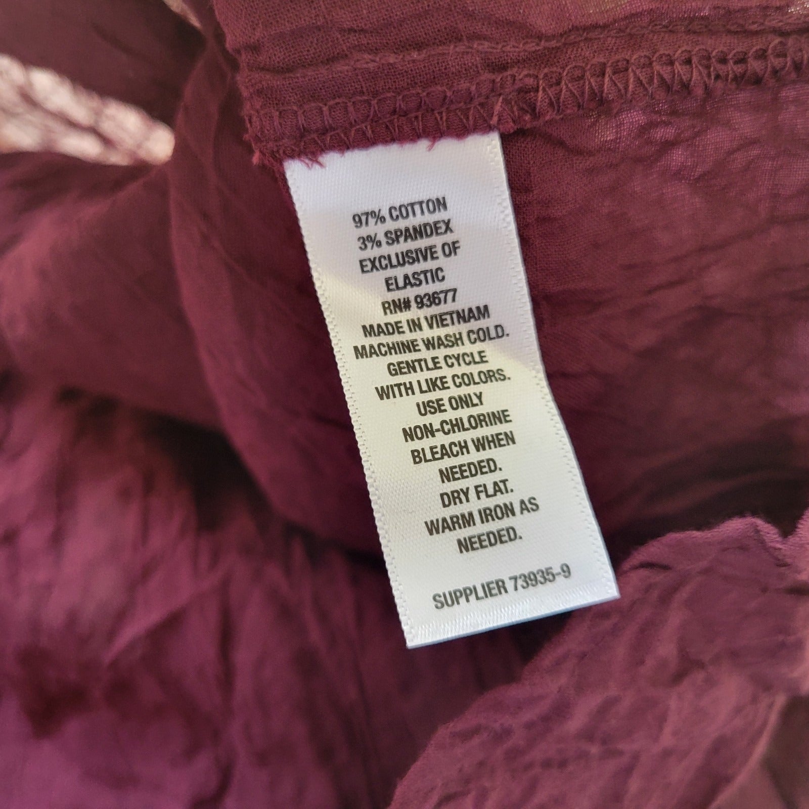 The Ana Women's Top in size 1X Plus features a burgundy color with a frilly neckline and long sleeves, making it lightweight and sheer for comfort. This blouse is perfect for casual or travel occasions, with a pullover closure and made of a cotton blend material. It is designed with a V-neckline and regular fit, suitable for all seasons and can be machine washed for easy care. The top is from the brand ANA and is a basic style with a solid pattern, offering stretch and a casual sleeve type for a versatile and stylish addition to your wardrobe.