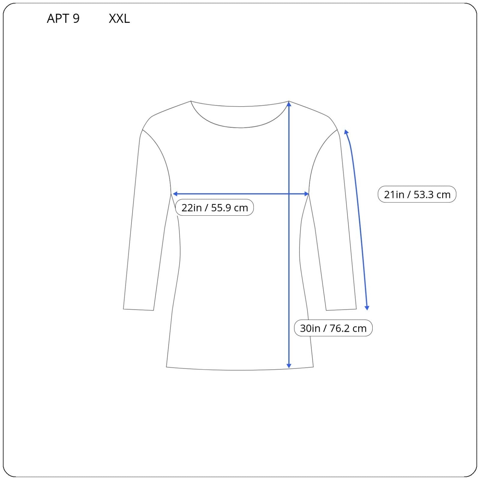 The Apt 9 Women's Top is a blue/black floral tunic made of a polyester blend knit fabric. It features a V-neckline with a keyhole detail, 3/4 fitted sleeves, and ruched detailing. The top has a pullover closure and is machine washable. It is a regular fit and comes in plus size 2XL. The top is suitable for casual and business occasions and can be worn in all seasons.