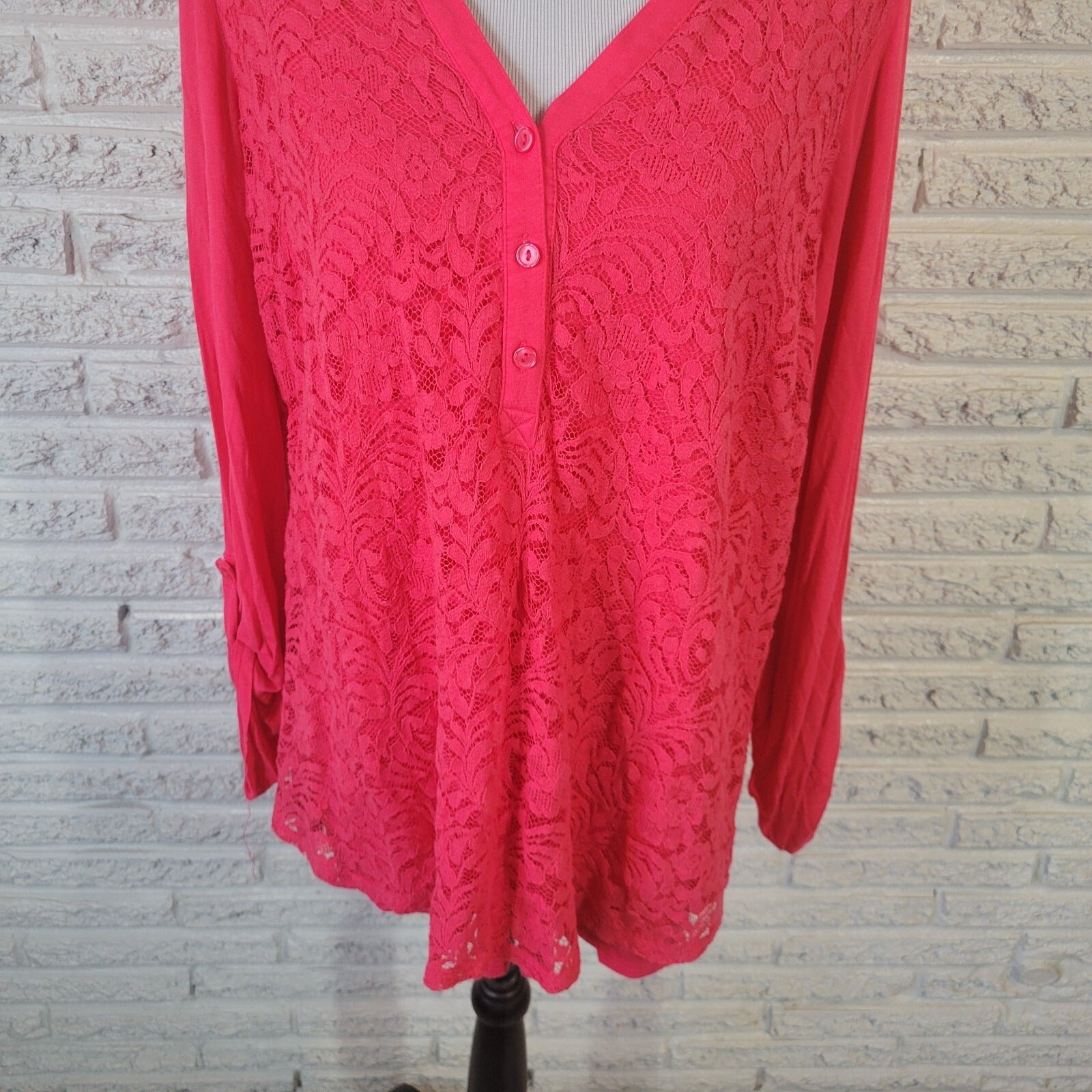 Apt 9 Womens Top 1X Plus Long Roll Tab Sleeve Pink Lace Comfy Quarter Button