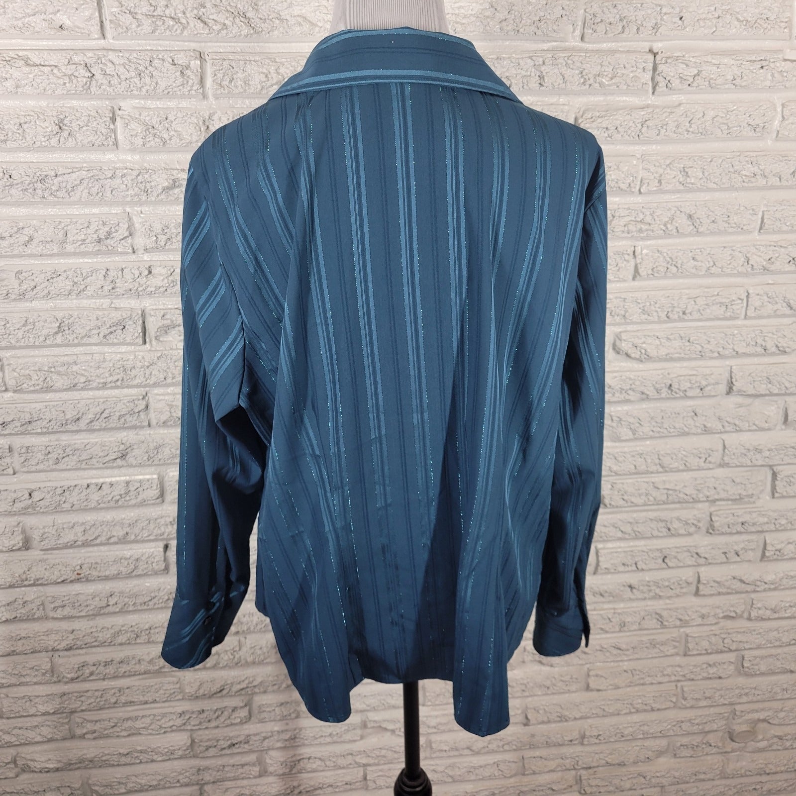 The Apt 9 Women's Top in size 1X Plus is a stylish and versatile addition to any wardrobe. This long sleeve button-up top features a classic striped pattern in blue with a touch of silver metallic accents, perfect for casual or travel occasions. Made from a comfortable polyester blend material, this top is machine washable and suitable for all seasons. The collared neckline and regular fit make it a flattering and easy-to-wear piece for everyday wear.
