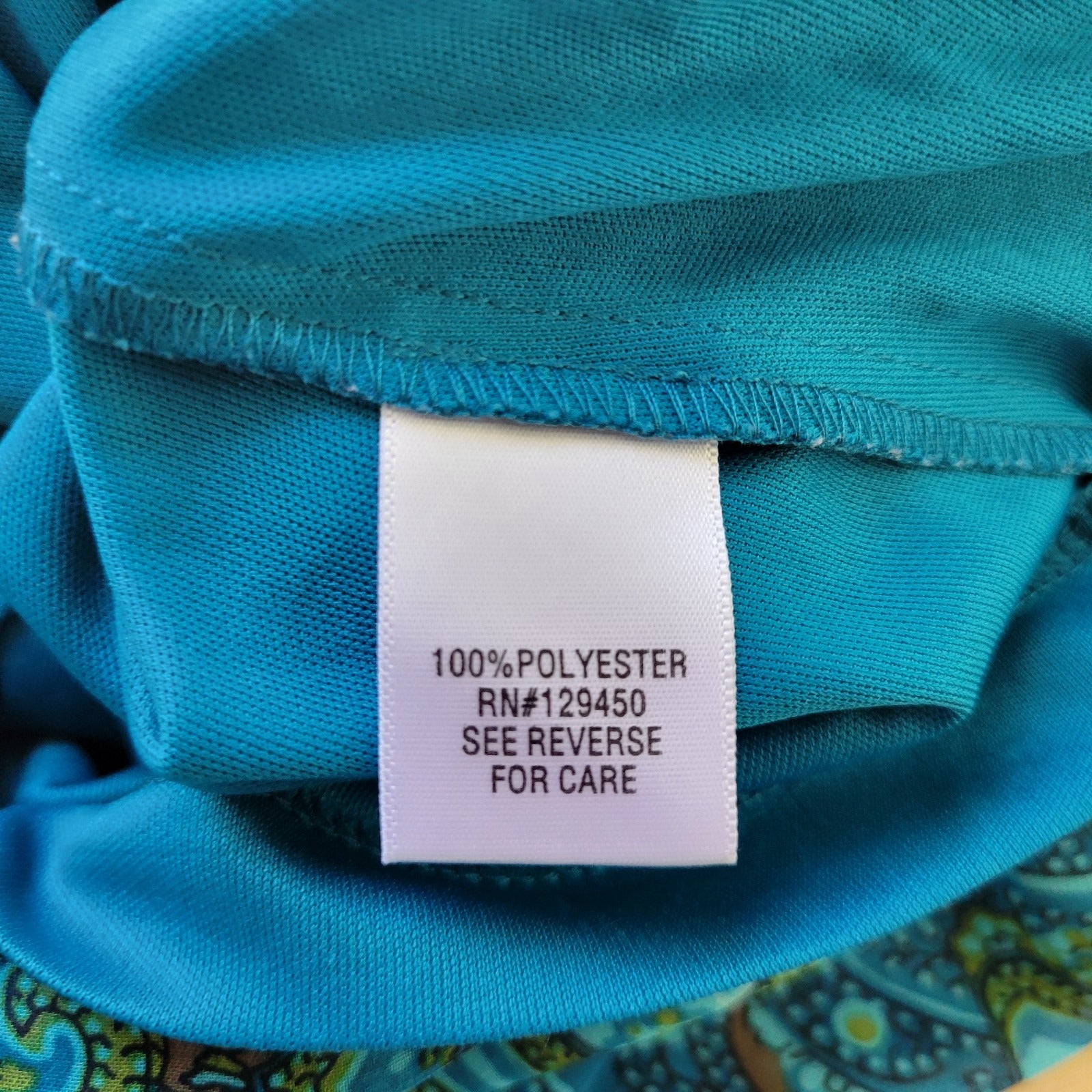 This Apt 9 Women's Top in size 2X Plus features a blue geometric sheer design with 3/4 sleeves and a button closure. Made of lightweight polyester material, this button-up top is suitable for various occasions such as travel, casual outings, and business meetings. It has a round neckline and a regular fit, making it a versatile choice for all seasons. Perfect for adding a touch of style and comfort to your wardrobe, this top is machine washable for easy care.