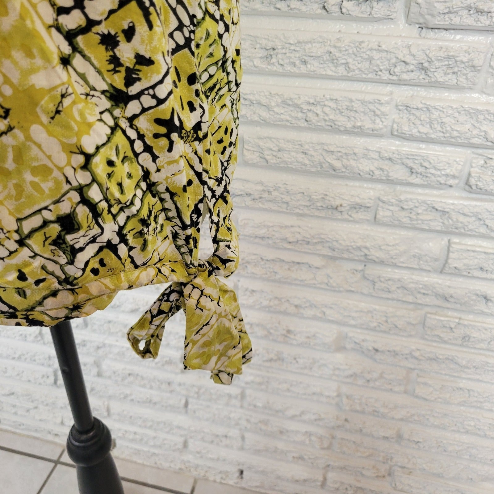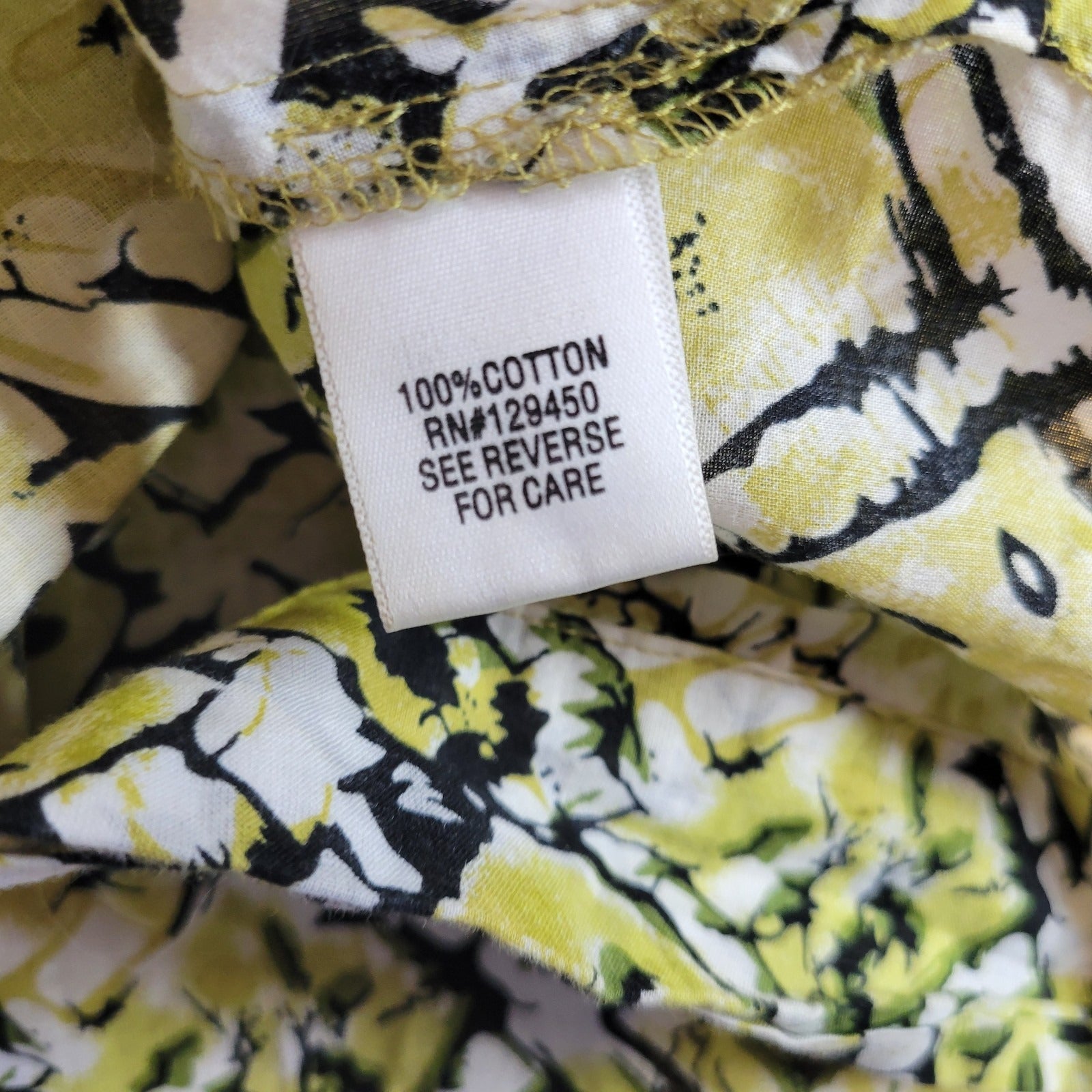 The Apt 9 Women's Top in Extra Large features a stylish green/black geometric pattern with short cap sleeves and a pullover closure. Made of lightweight 100% cotton, this casual top is perfect for travel and everyday wear. The smocked tied hem adds a unique touch to this versatile button-up blouse, making it a fashionable choice for all seasons. Machine washable for easy care, this top is a must-have for any woman's wardrobe.