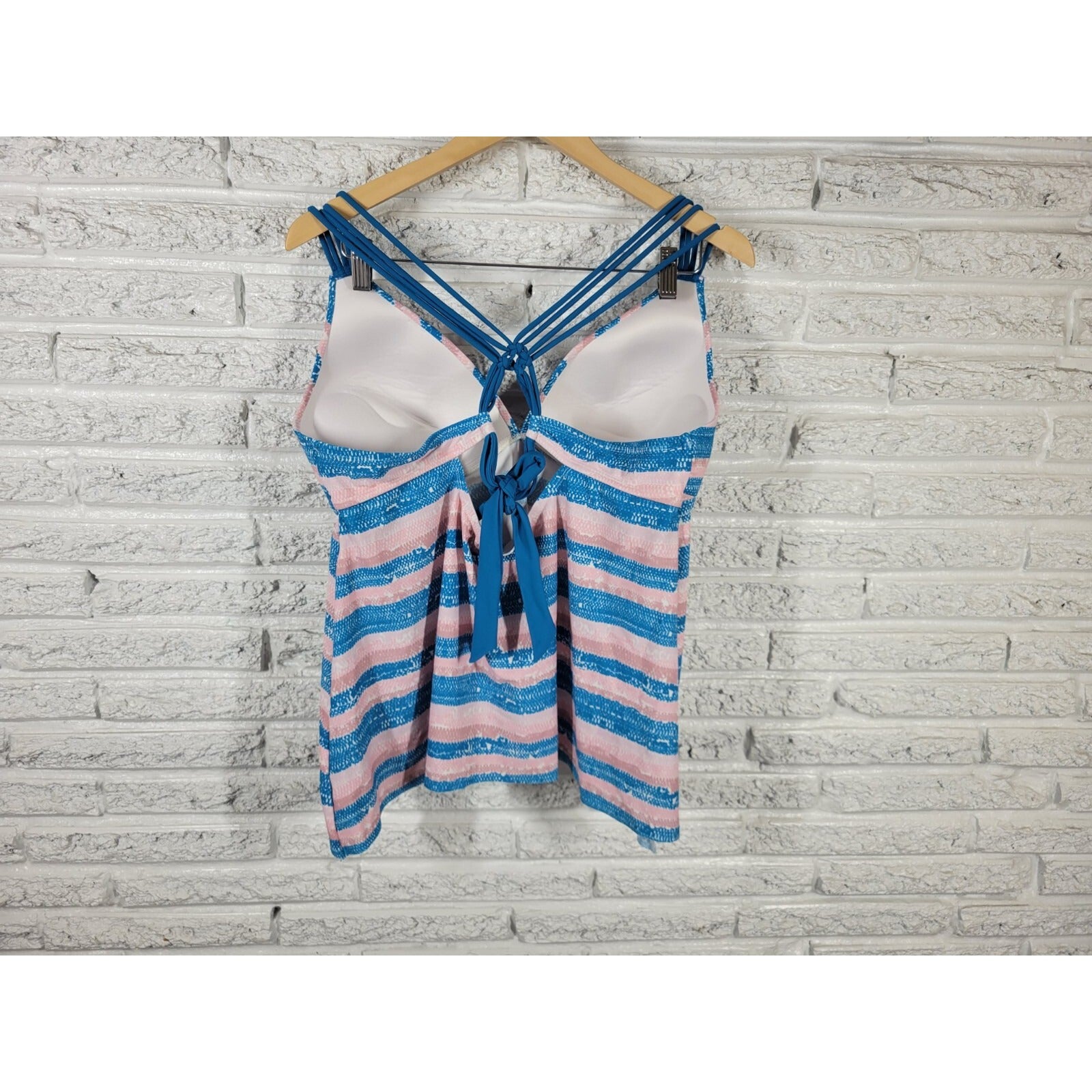 Aqua Couture Swim Top is a women's top made of nylon and spandex material. It has blue/pink stripes and a racerback strap type. The top is extra-large in size and has built-in bra, stretch, and is lined. It is recommended to hand wash only.