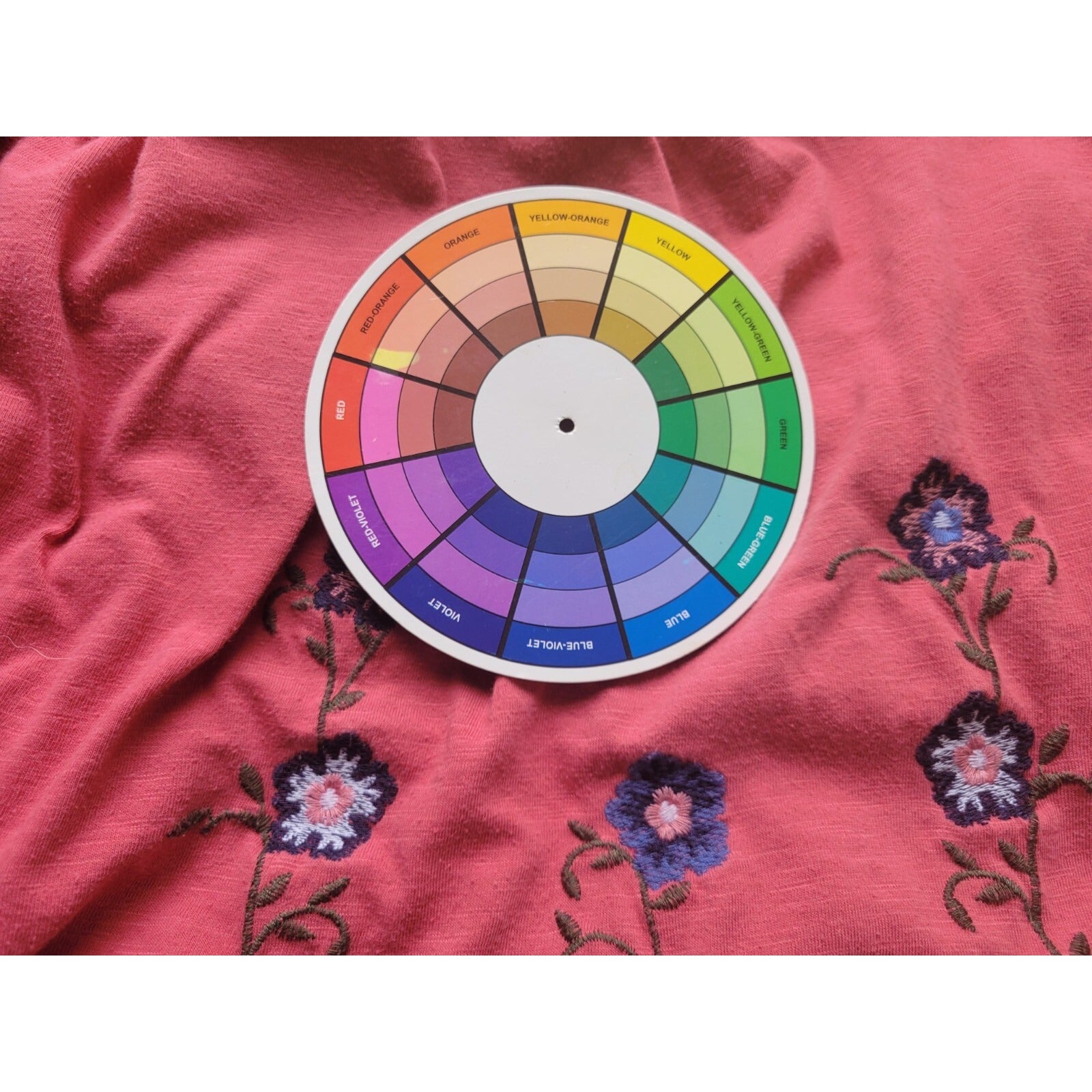 This is a regular fit blouse made of a cotton blend material. It features a muted red floral embroidery with pleats and a boat neckline that can be worn on or off the shoulder. The blouse has 3/4 classic/fitted sleeves and a pullover closure. It is machine washable and has stretch, making it suitable for all seasons. The blouse is designed for plus size women and is from the brand Architect.