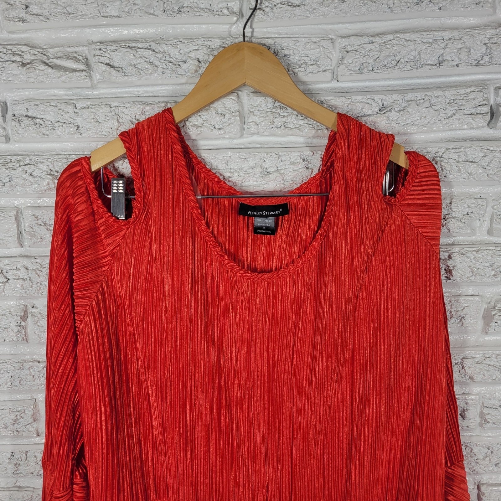 The Ashley Stewart Women's Top in size 26 Plus is a stylish and versatile addition to any wardrobe. This red sheer crinkle blouse features a cold shoulder bell sleeve design, perfect for a trendy yet comfortable look. The pullover closure, round neck, and long sleeves make it easy to wear for casual or travel occasions. Made of polyester, this tunic-style top offers stretch and is machine washable for easy care. Perfect for all seasons, this top is a must-have for any fashion-forward woman.