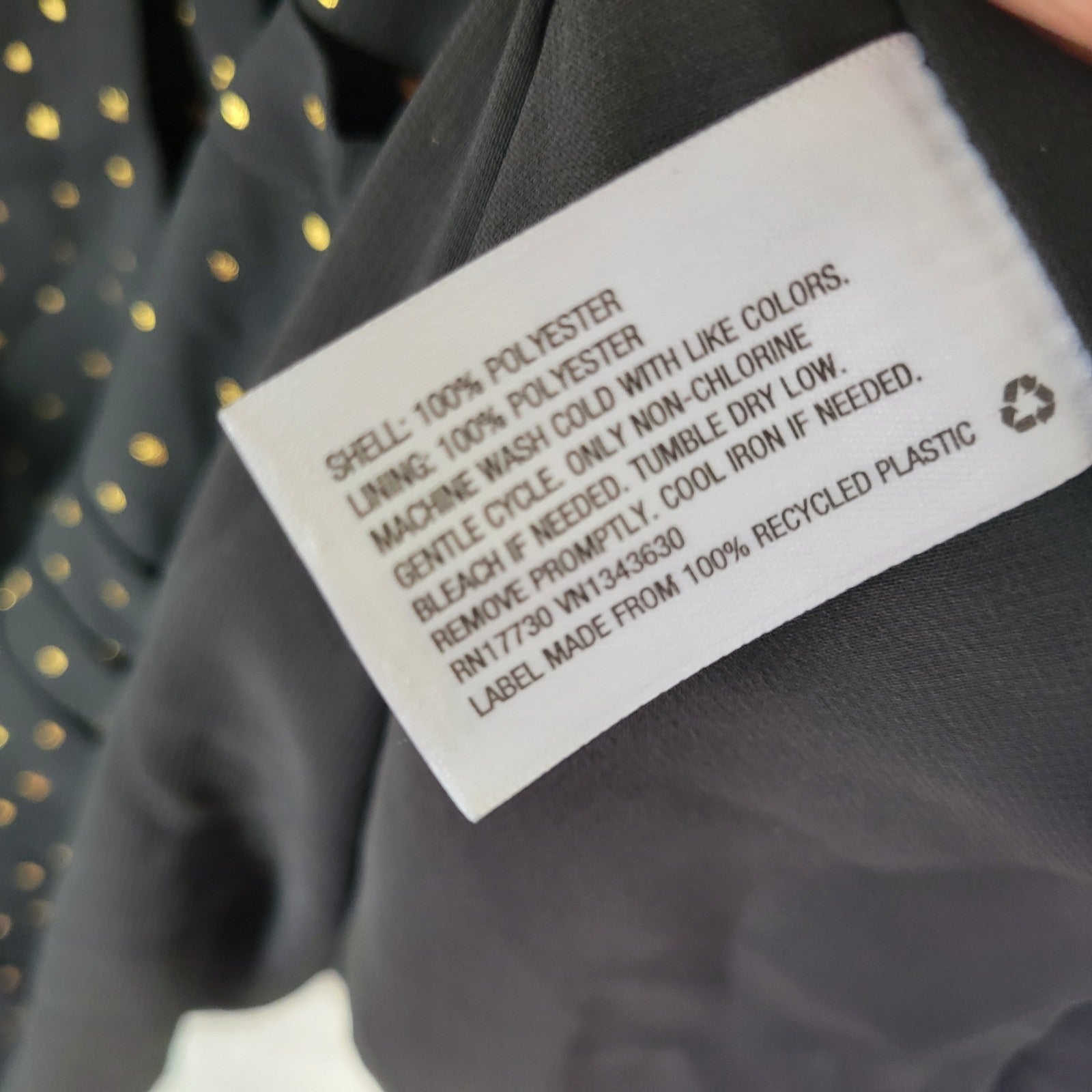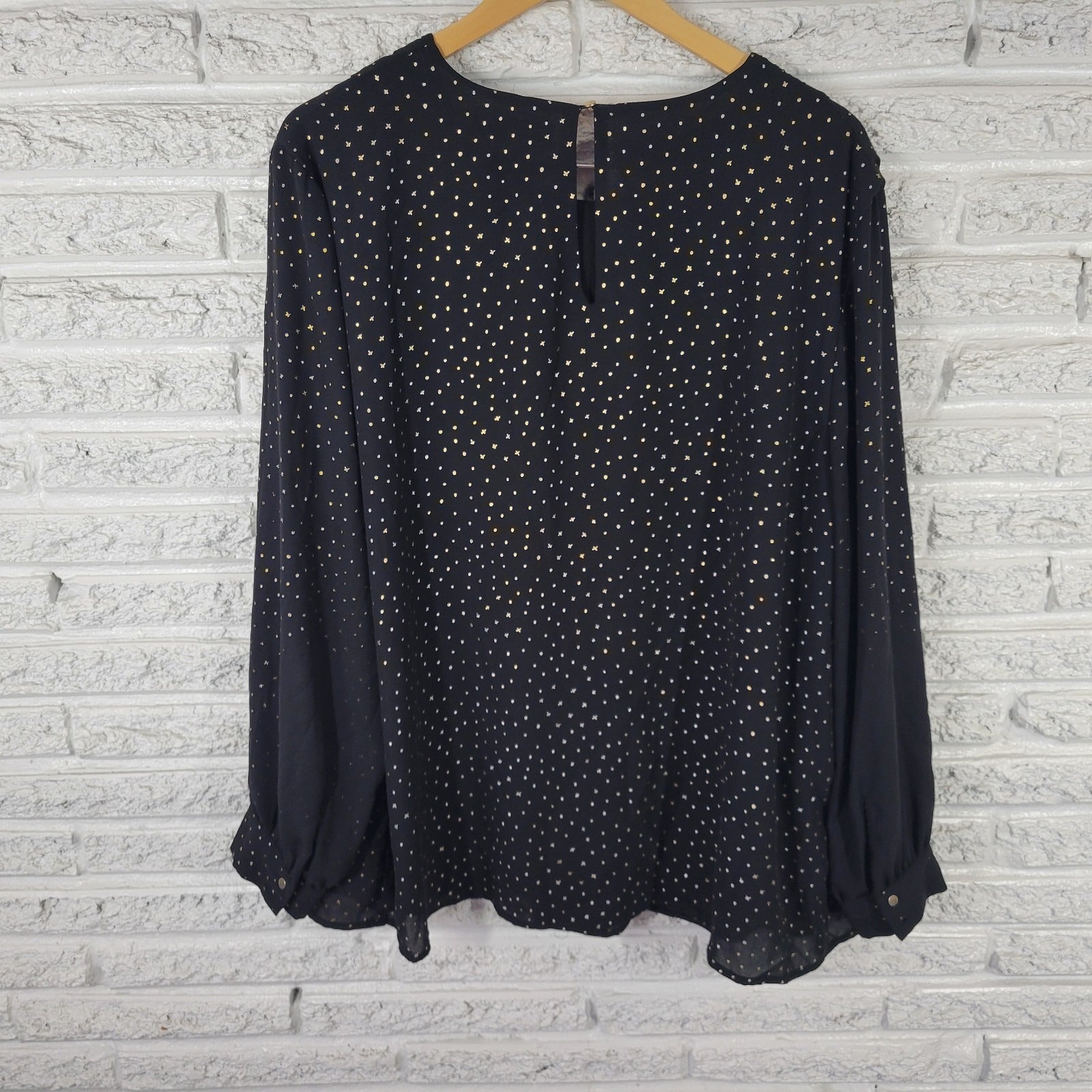 The Ava & Viv Women's Top in size 2X Plus is a stylish tunic featuring a black color with gold X's design. This long sleeve blouse has a round neckline, pullover closure, and a pintuck back keyhole detail. It is made of polyester material and is machine washable. The tunic is lined and suitable for all seasons, making it a versatile and comfortable piece for various occasions including travel, casual wear, and business meetings. This plus-size top is perfect for women looking for a chic and classic addition to their wardrobe.