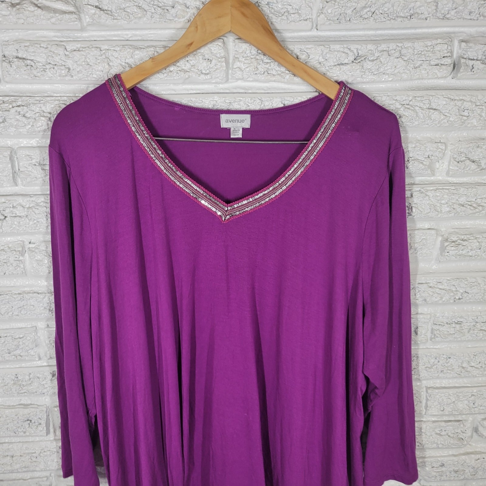The Avenue Women's Top is a stylish and versatile addition to any wardrobe. This semi-sheer blouse features a V-neckline, 3/4 sleeves, and studded accents for added flair. With a lightweight and stretchy design, it is perfect for all seasons and can be machine washed for easy care. The purple color adds a pop of color to your outfit, making it suitable for casual or travel occasions. Available in size 22/24 and designed for plus size women, this top is a basic piece that can be styled in various ways for different looks.