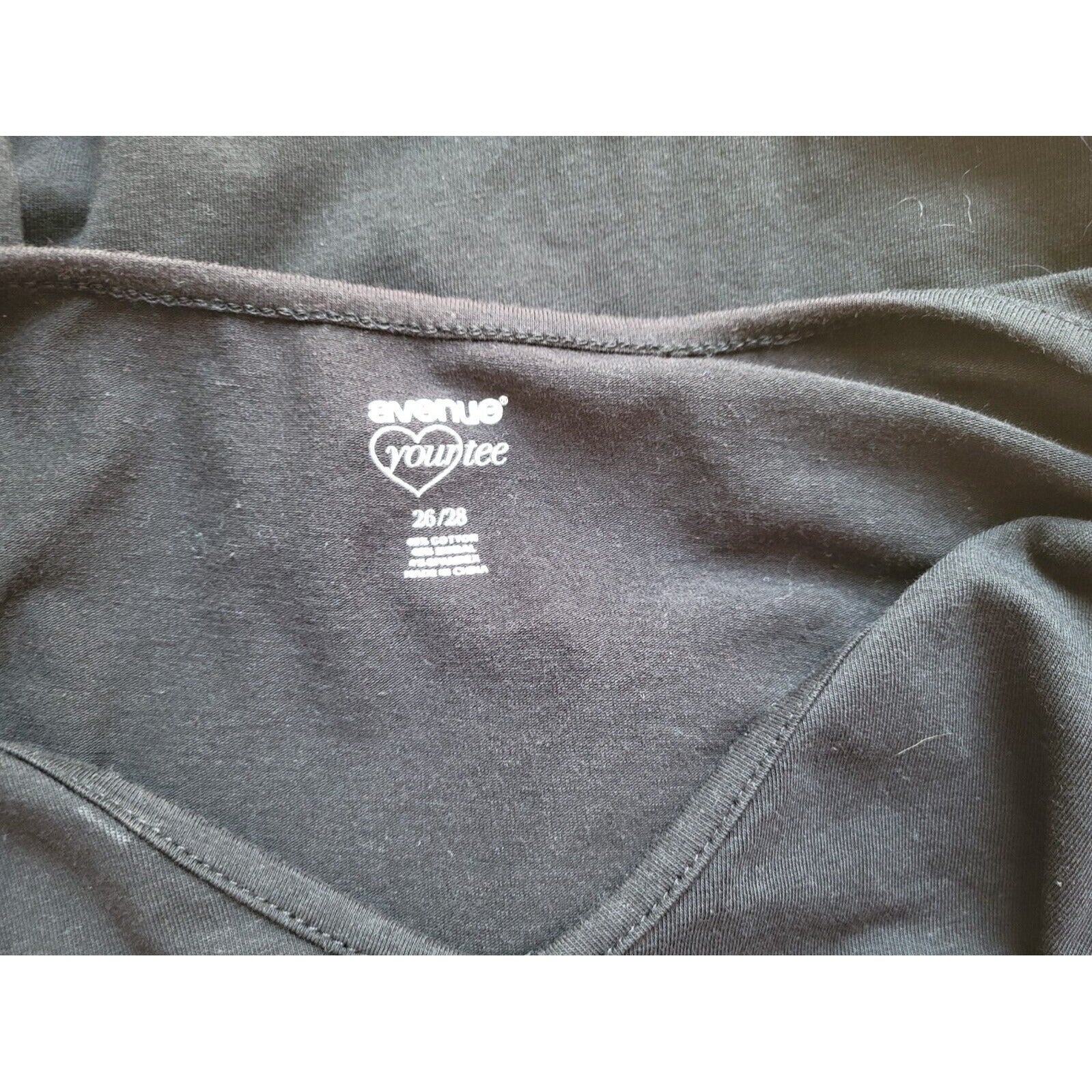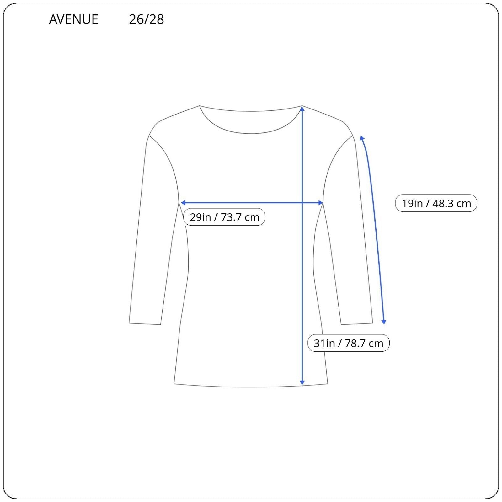 This Avenue women's top is a must-have for any casual occasion. The black cotton blend jersey fabric with a metallic cityscape design is perfect for all seasons. The tunic style with a crew neck and 3/4 sleeves adds a touch of elegance to this regular fit top. It is machine washable and has a pullover closure for easy wear. The size is 26 and it is a plus size type. This t-shirt is perfect for anyone who loves to show off their style and is great for winter, summer, fall, and spring.