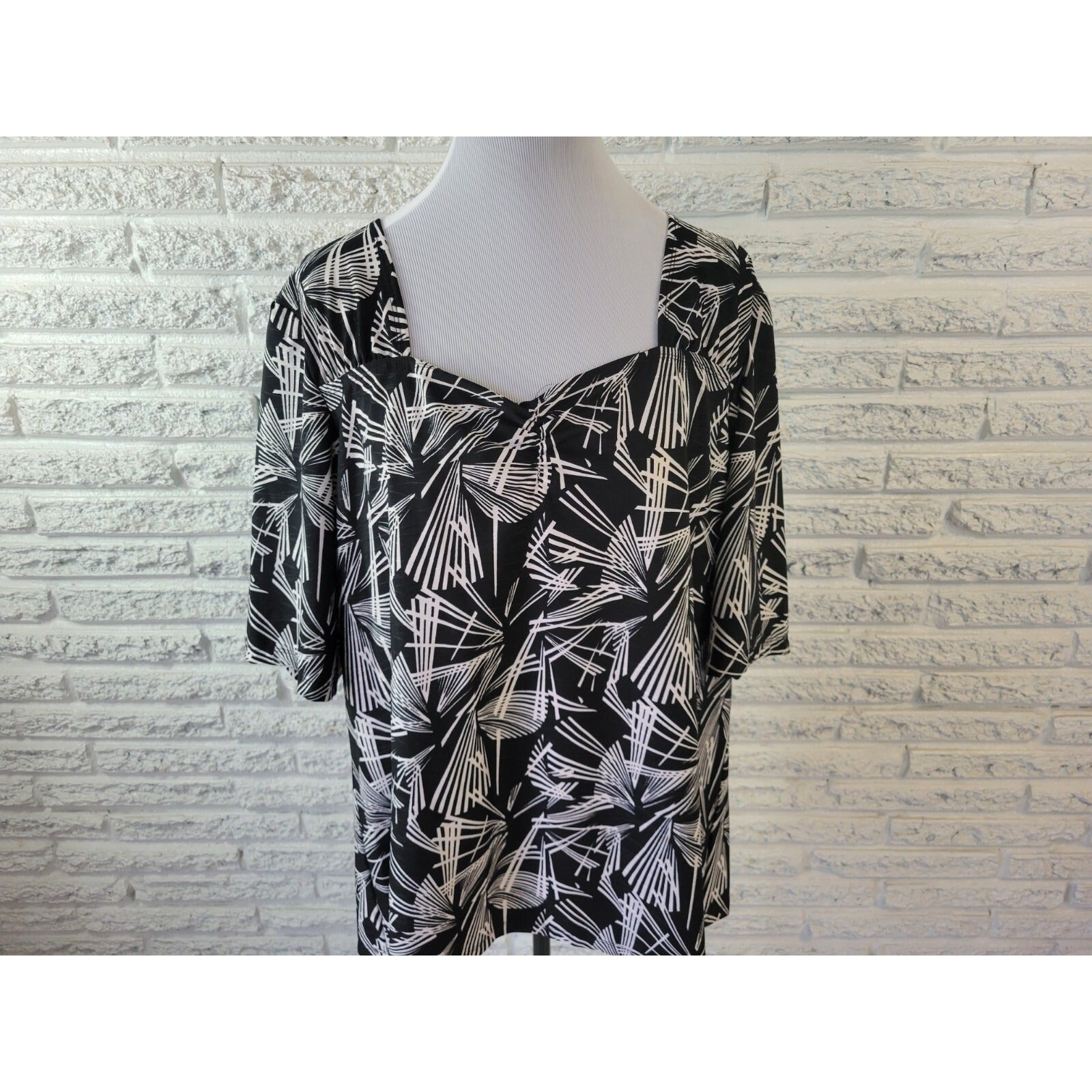 Add a touch of sophistication to your wardrobe with this stunning black tunic blouse by Avenue. The abstract geometric pattern with silver metallic adds a subtle shine, while the square neckline and short sleeves keep it casual yet business-appropriate. The pullover closure and regular fit make it easy to wear for any occasion, from a day at the office to a casual outing. This blouse is made of a comfortable and stretchy polyester blend material that is semi-sheer but not too revealing. It is perfect for all seasons, whether you want to layer it with a jacket in the winter or wear it on its own in the summer. This plus size top is available in size 26/28 and is a must-have for any fashion-forward woman.