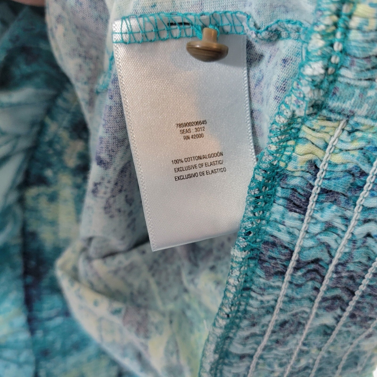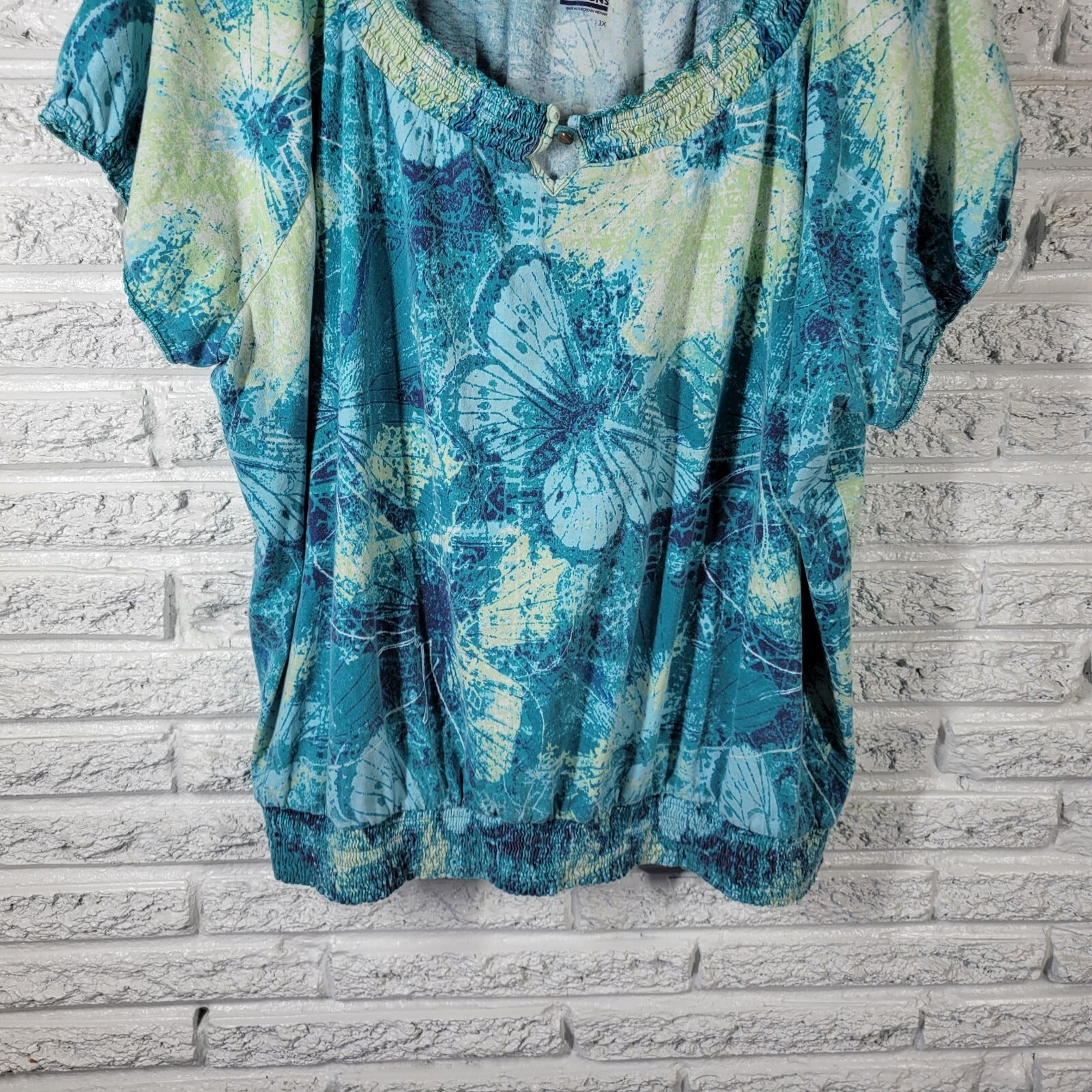 Basic Editions Women Top 3X Plus Peplum Blue Tie Dye Butterflies Keyhole Cotton