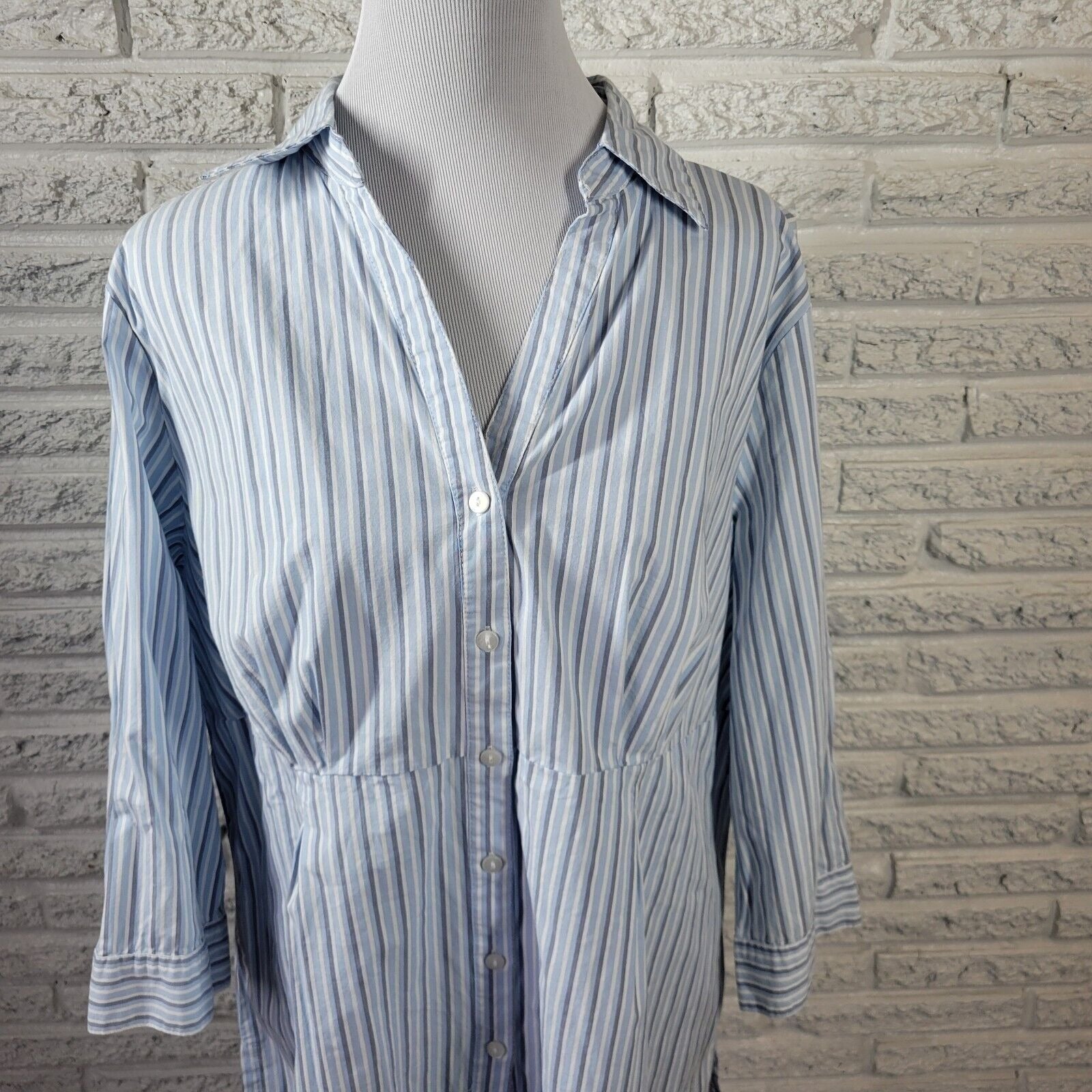 Basic Editions Womens Top 1X 3/4 Sleeve Collar Blue Stripe Button Up Lightweight
