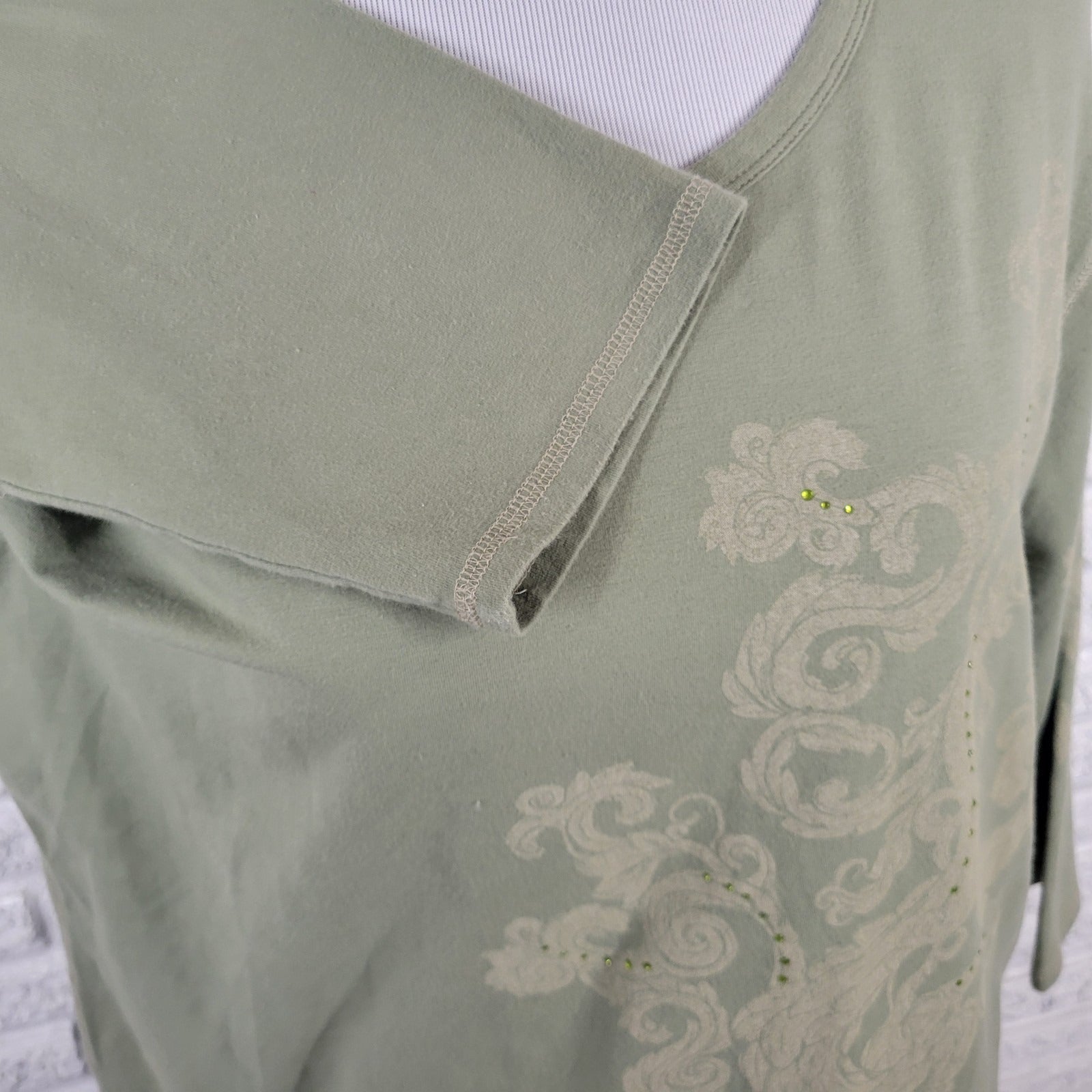 Bay Studio Khakis Womens Top 1X Plus 3/4 Sleeve Green Rhinestones Faded Look