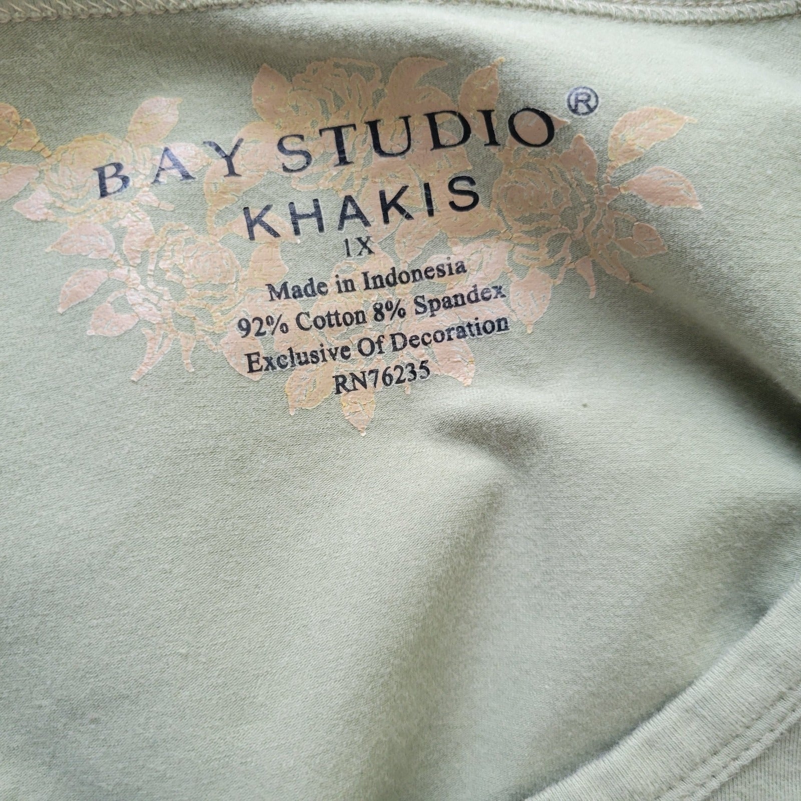 The Bay Studio Khakis Women's Top in size 1X Plus is a stylish and comfortable blouse with 3/4 sleeves and a crew neck neckline. Made from a cotton blend material, this green top features rhinestones for a touch of sparkle and a faded look for a trendy aesthetic. Perfect for travel or casual occasions, this pullover top is easy to care for with machine washable instructions. With a regular fit and stretchy fabric, this versatile blouse is suitable for all seasons and occasions, making it a staple piece in any woman's wardrobe.