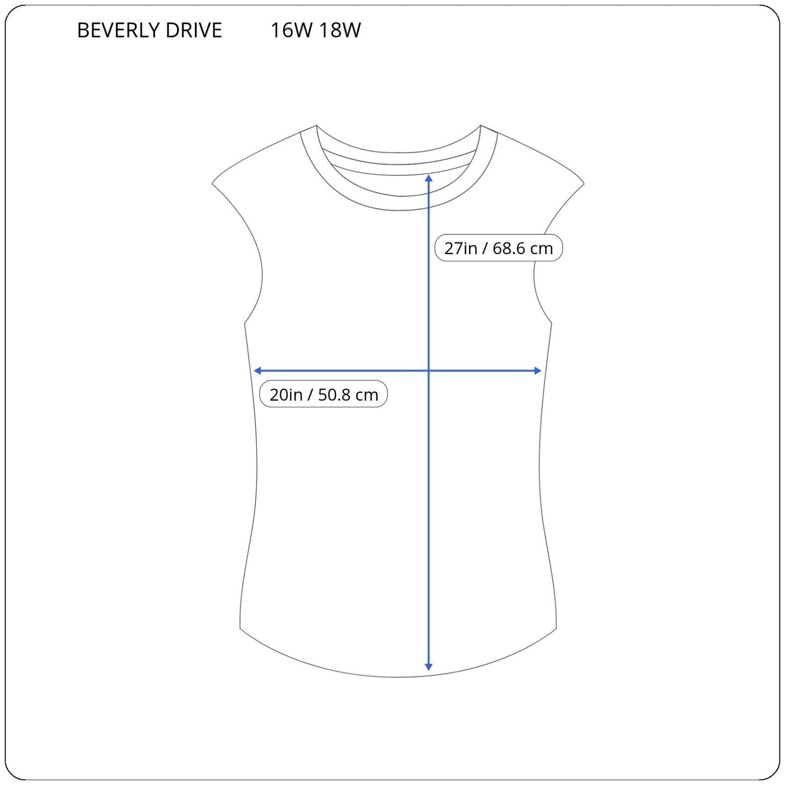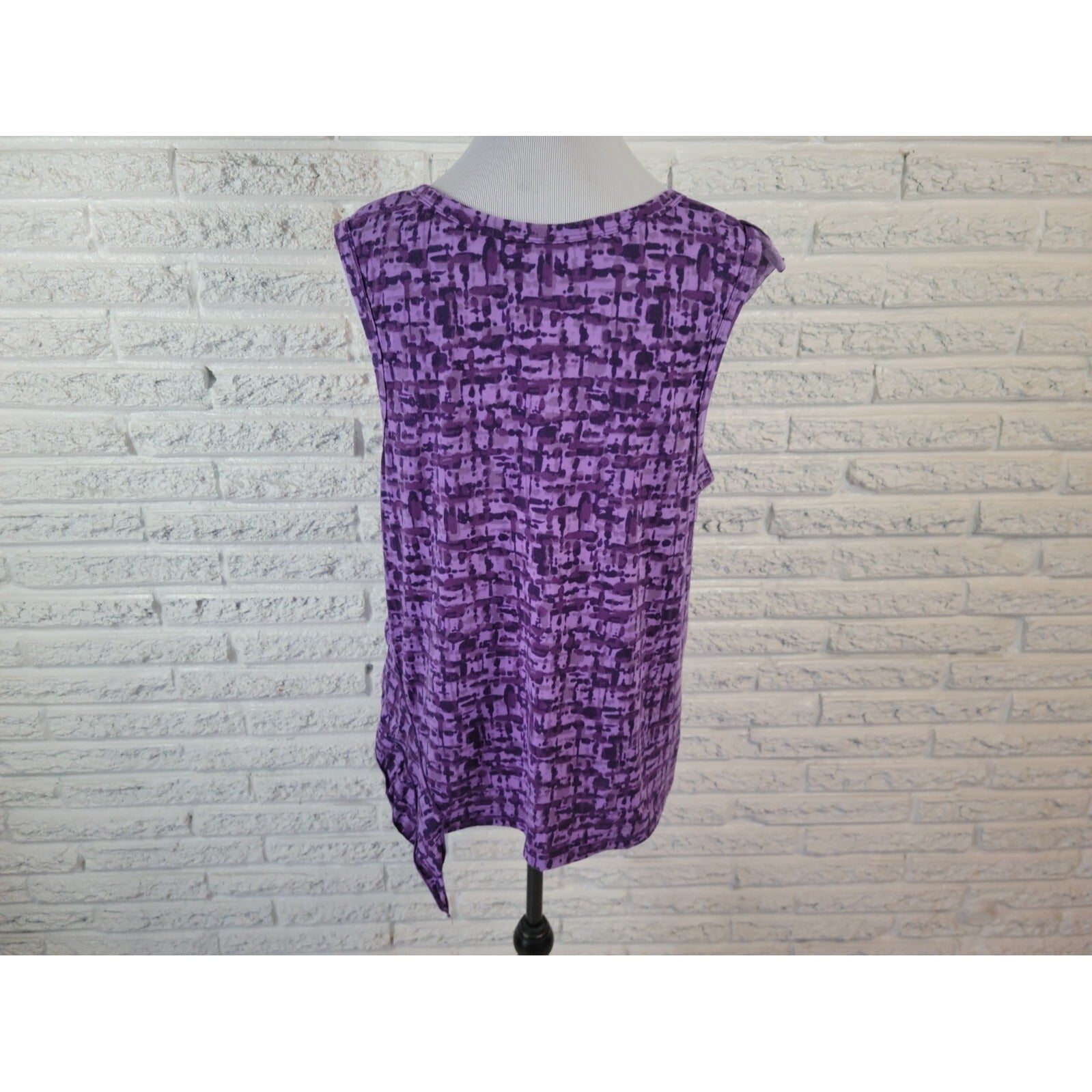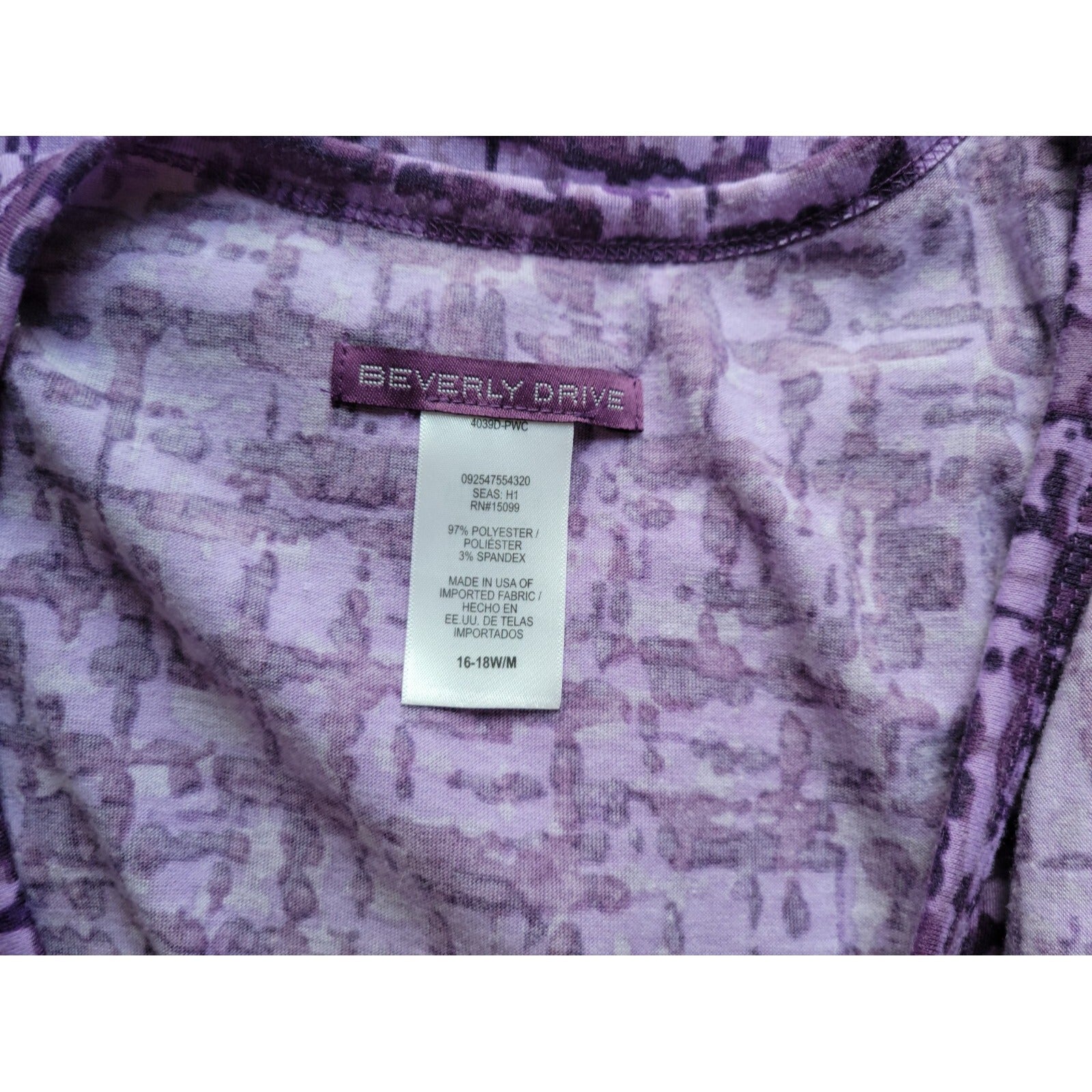 This Beverly Drive top is perfect for a casual day out. The sleeveless blouse features a round neckline and a pullover closure. The top is made of a purple polyester blend material with a watercolor effect and ruffle accents. It is a regular fit size 16W plus, perfect for all seasons, and machine washable for easy care. The garment is stretchy and comfortable, making it a great addition to any wardrobe. This blouse is ideal for a day out with friends or a casual dinner date.