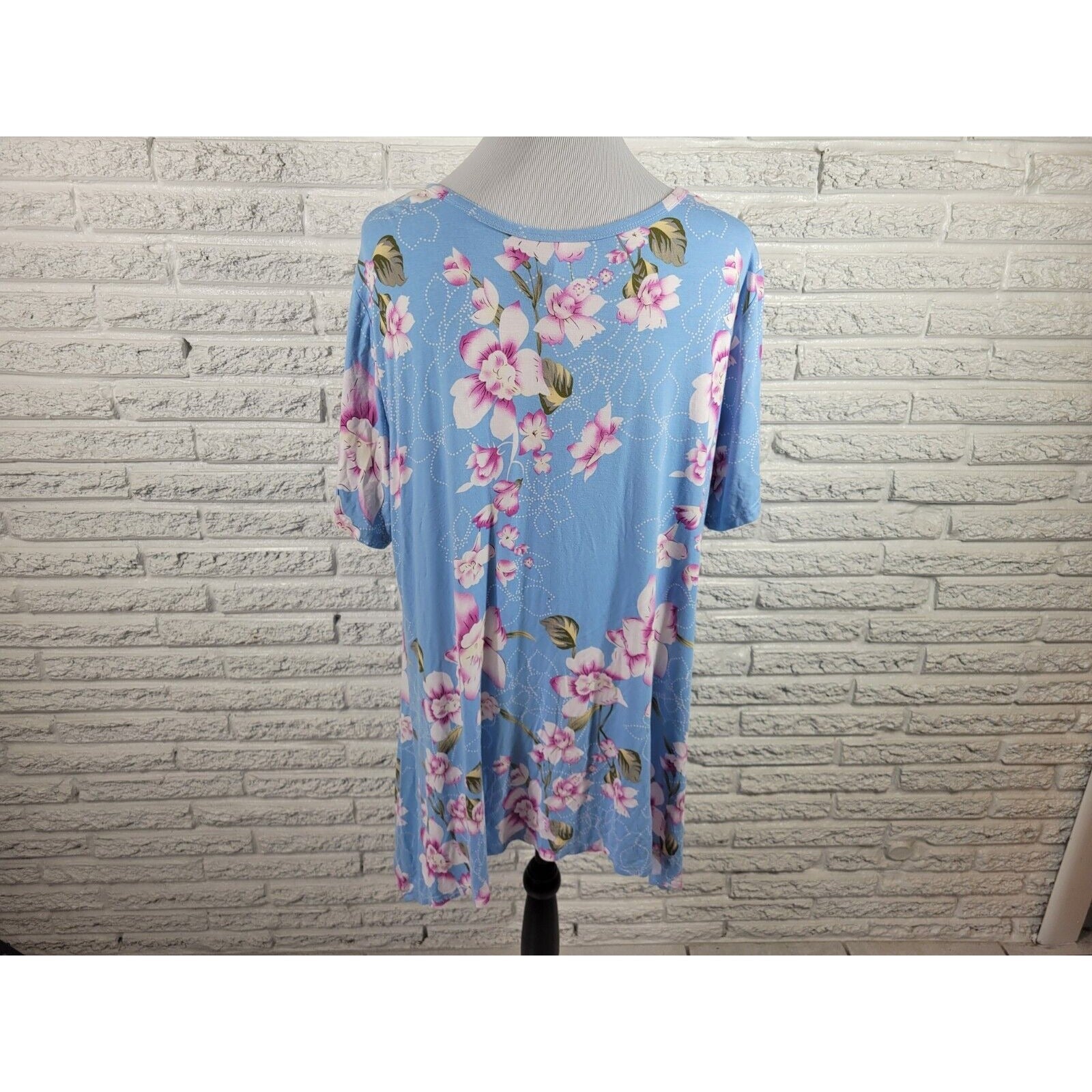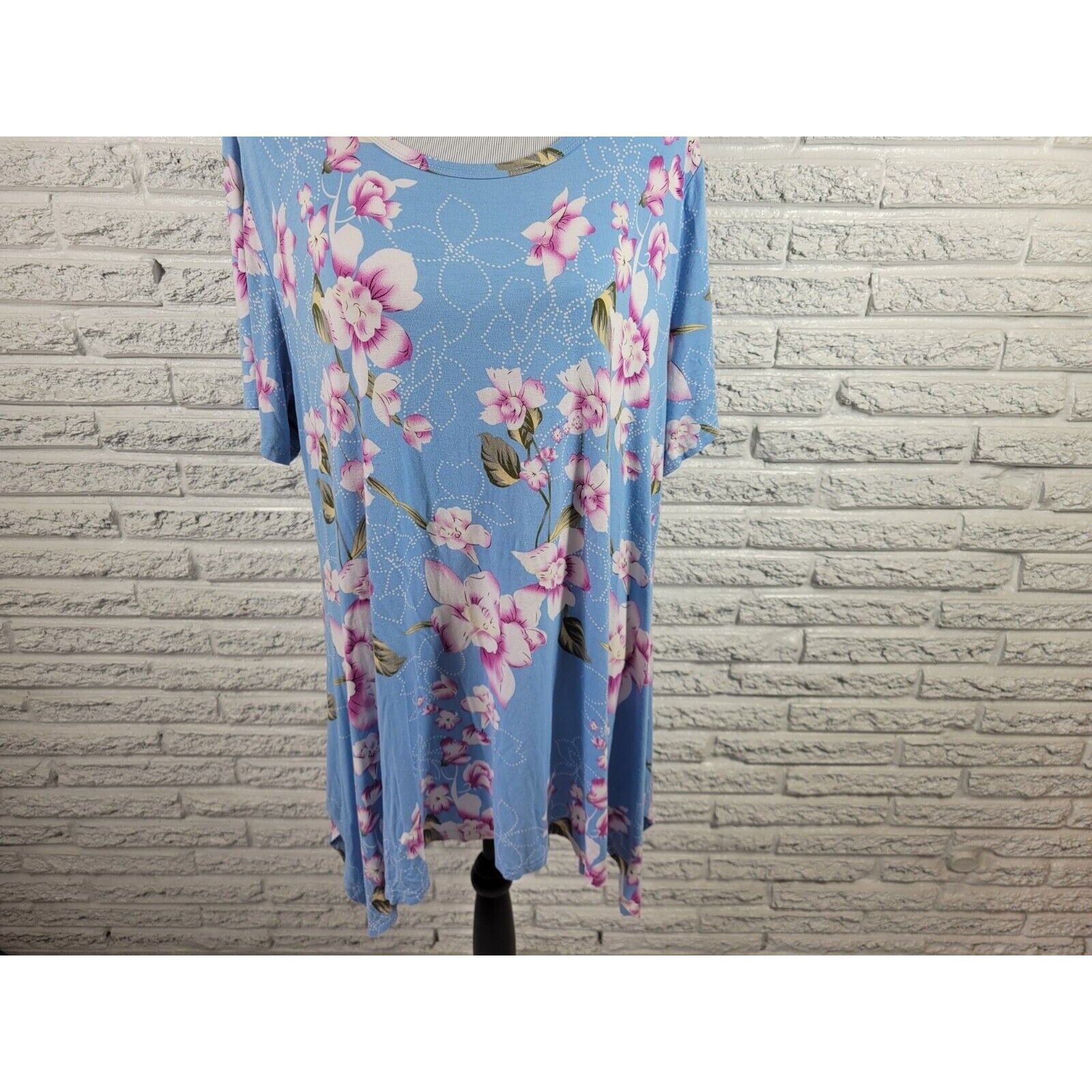 Bishuige Women Top 3XL Plus Tee Tunic Short Sleeve Blue Floral Shark Bite Casual