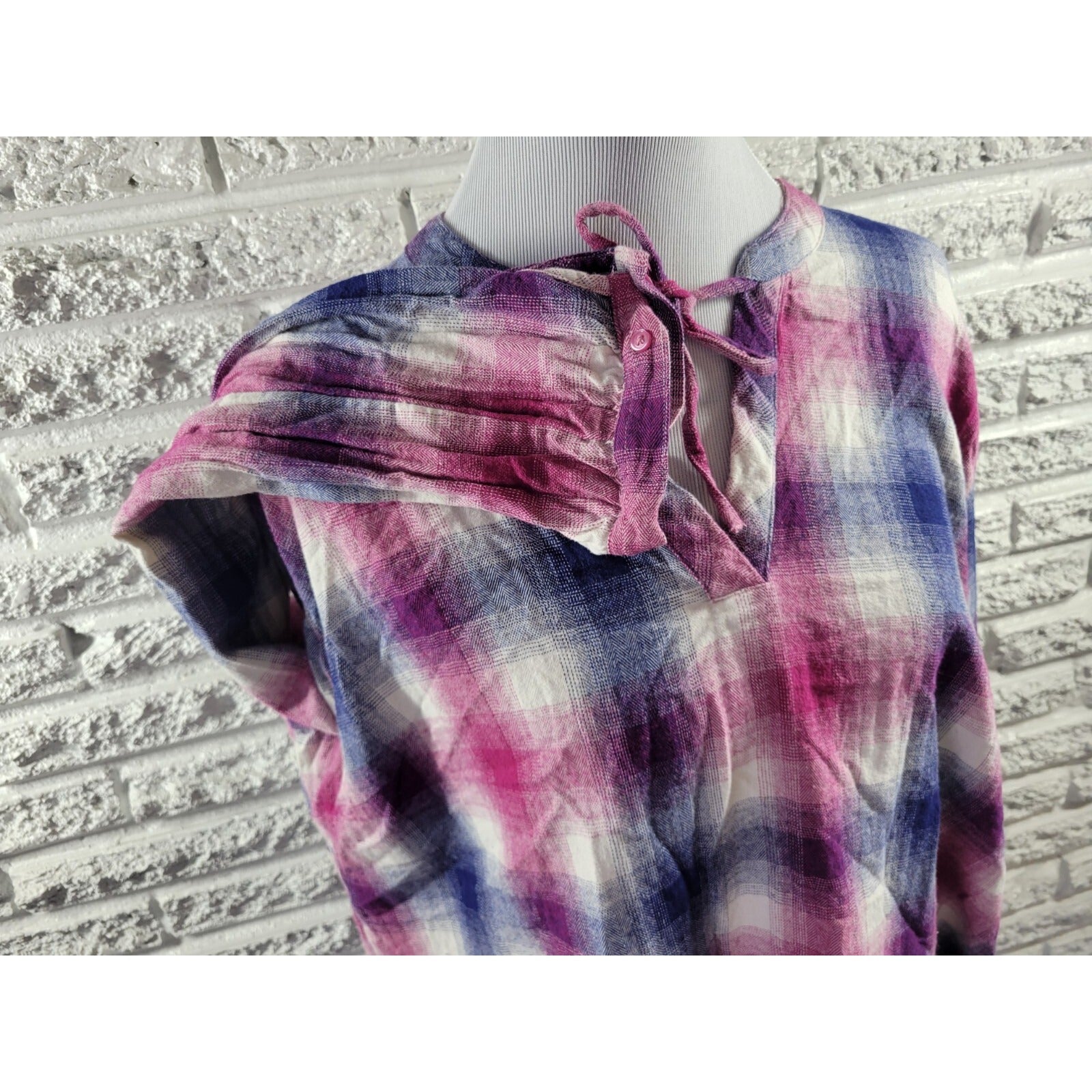 Bit Bridle Womens Top 2X Plus Tunic Long Sleeve Purple Blue Plaid Cotton Keyhole