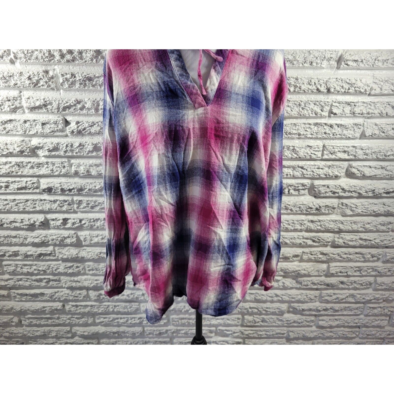 Bit Bridle Womens Top 2X Tunic Long Sleeve Purple Blue Plaid Cotton Keyhole