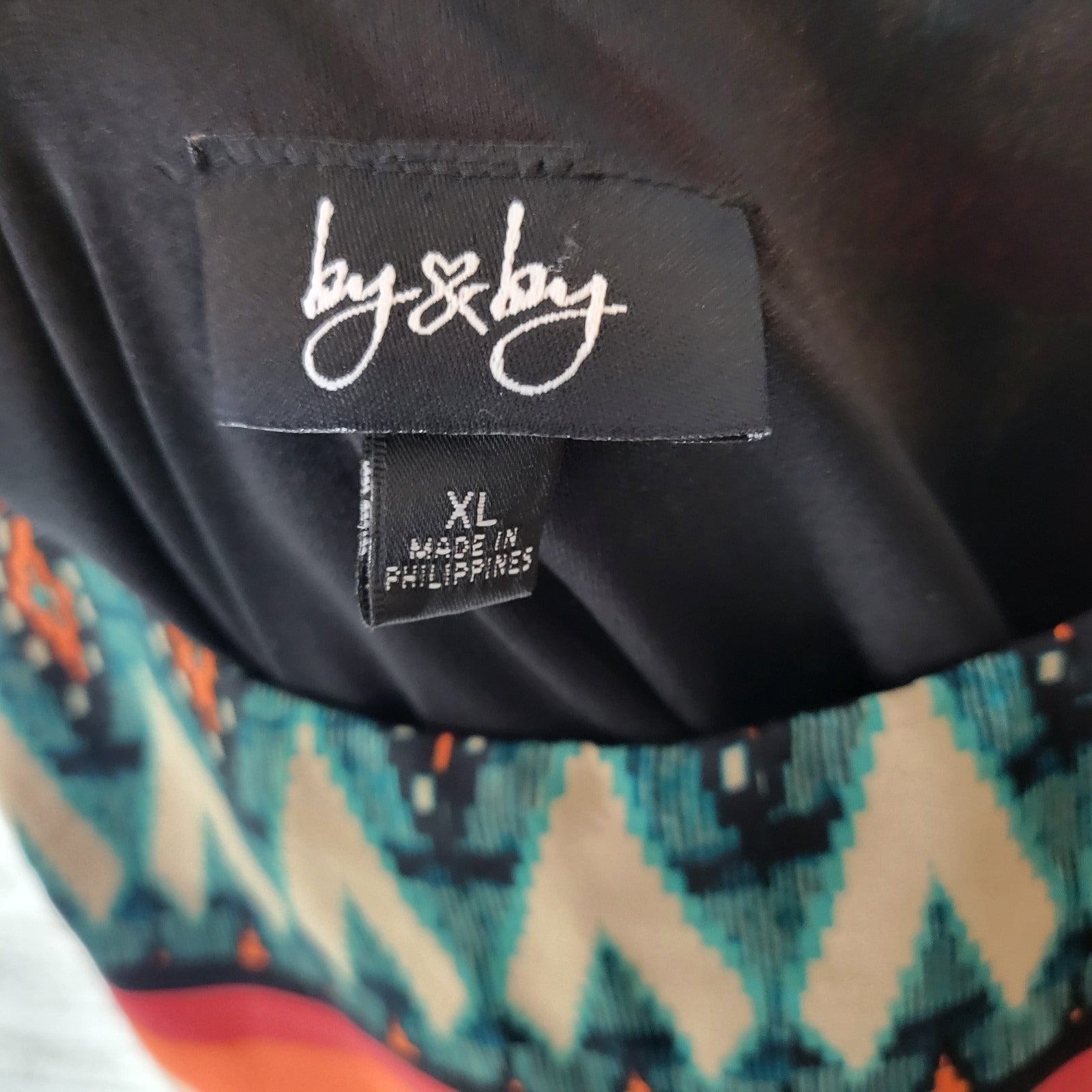 This By & By women's dress in extra-large size is a stylish slip sheath dress in blue with a geometric pattern. The dress features a sleeveless design with a round neck and spaghetti straps, making it perfect for travel or casual occasions. Made of lightweight polyester material, this long dress is machine washable and suitable for all seasons. With a pullover closure, this dress offers a comfortable and elegant look for any wardrobe.