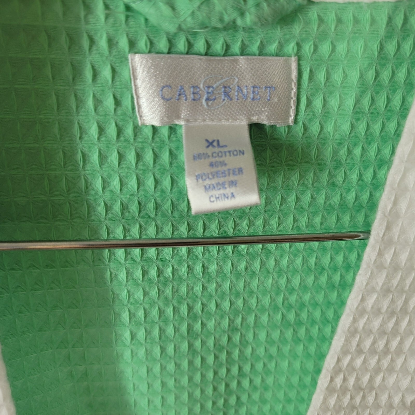 Elevate your loungewear game with this stunning green Cabernet women's robe in size XL. The 3/4 sleeve kaftan-style robe features a V-neckline and a tie closure, making it perfect for all seasons. The belted robe is made of a comfortable cotton blend material and can be easily machine washed.   This solid-patterned robe with a waffle design is perfect for women who want to stay cozy and stylish at the same time. It is ideal for winter, summer, fall, and spring and is suitable for any occasion. This robe is a must-have addition to any woman's wardrobe.