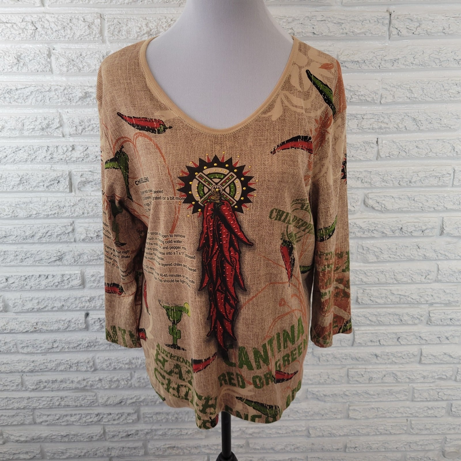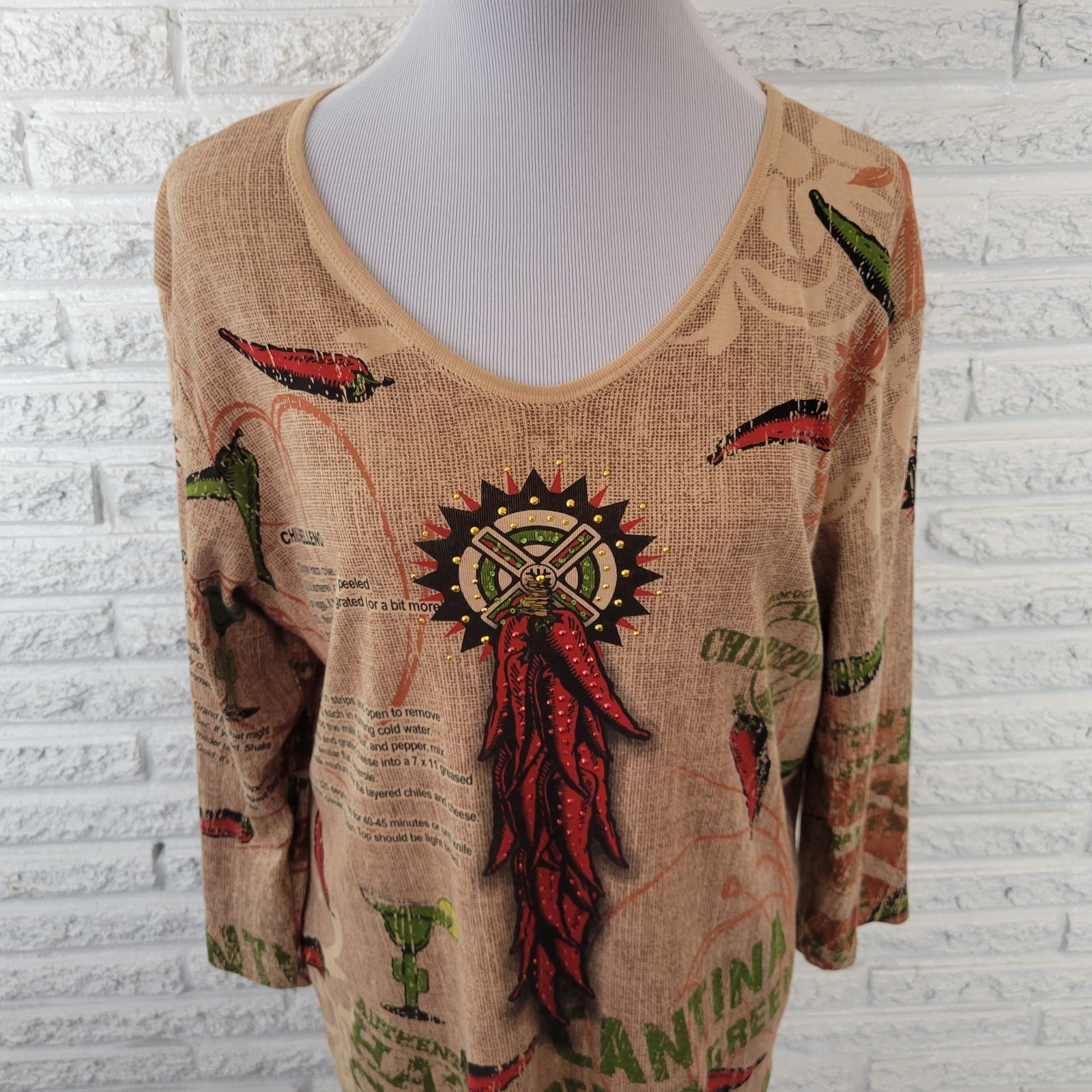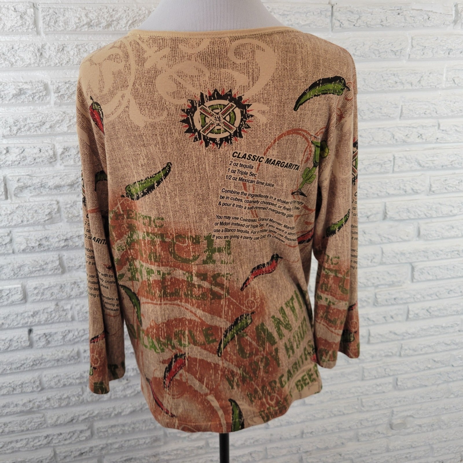 Cactus Bay Womens Top XL Tan Artsy Latin America Recipes Chile Relleno Margarita