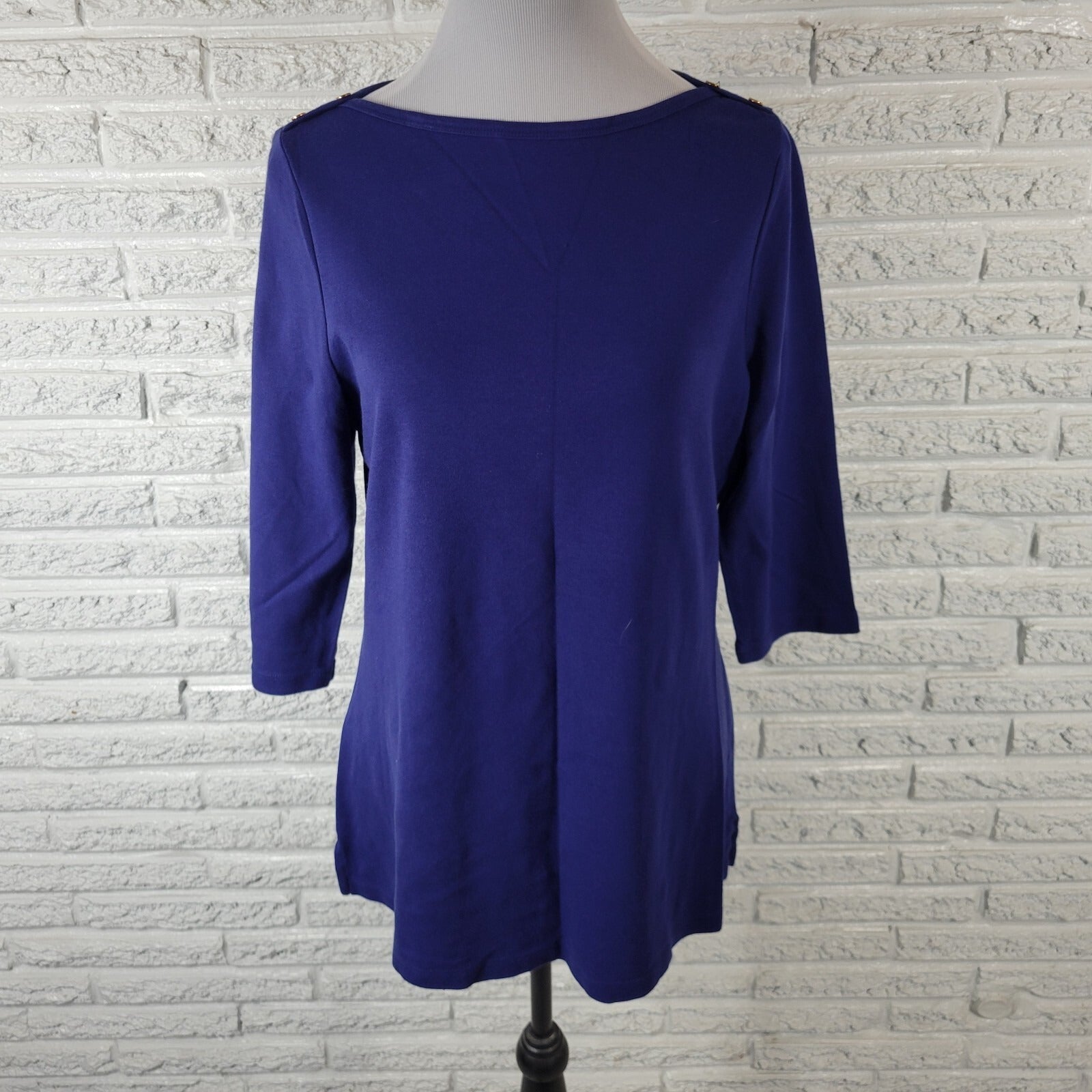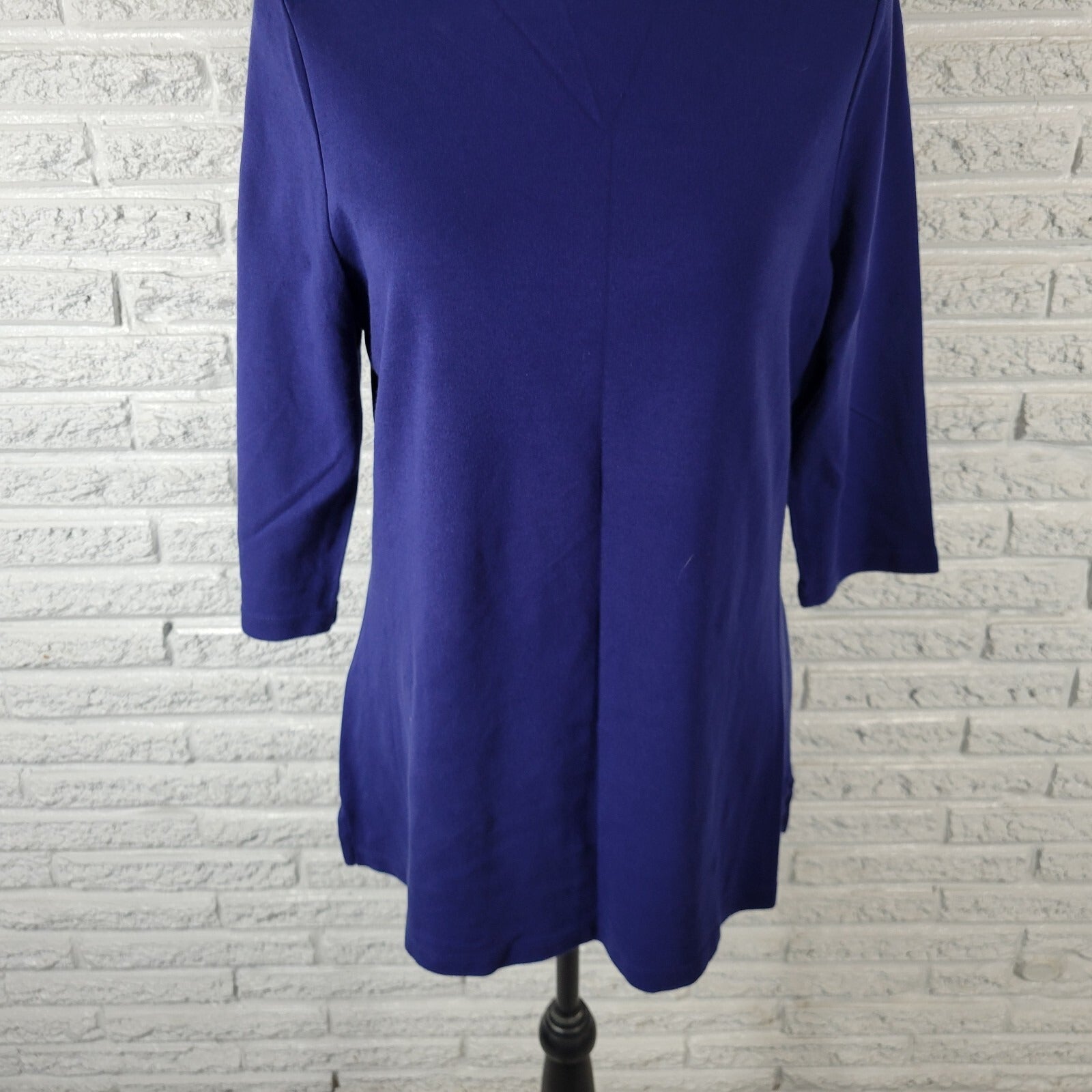 Elevate your wardrobe with the Carole Little Women's Top in a serene blue hue that complements any casual ensemble. Tailored for plus size with a comfortable 1X fit, this blouse features a flattering boat neckline and chic 3/4 sleeves, ideal for transitional weather and everyday wear. Constructed from soft, breathable 100% cotton, this top ensures all-day comfort with just the right amount of stretch. It's designed for ease with a pullover closure and adds a touch of sophistication with deco buttons. The solid color and subtle slit detail lend a modern edge to this machine-washable piece, perfect for travel or laid-back settings.