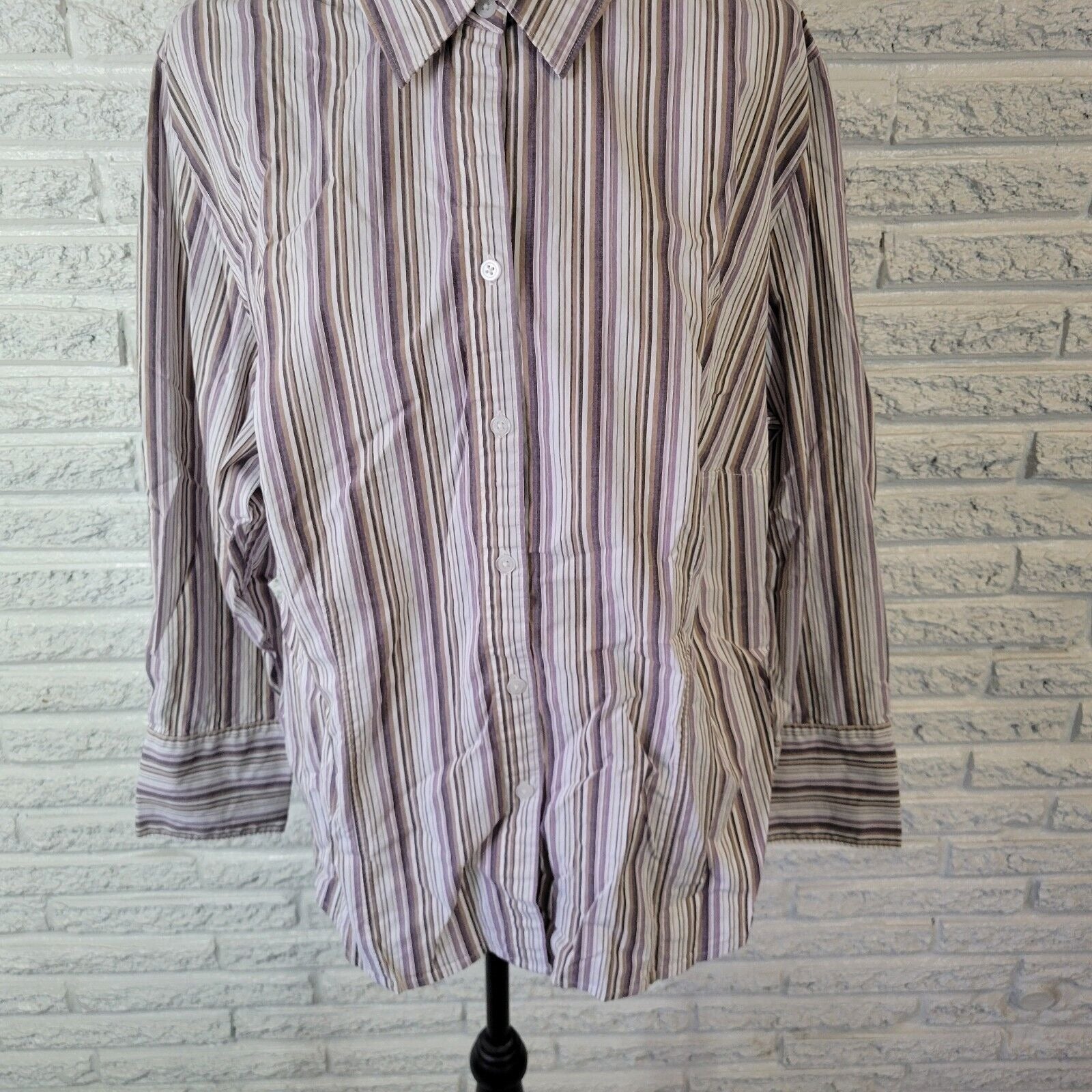 Elevate your everyday attire with the Casual Corner Annex Women's Top. This lavender/tan stripe collared button-up is a versatile addition to any wardrobe, effortlessly blending business, casual, and travel styles. The lightweight cotton blend ensures comfort and breathability, making it suitable for all seasons. The top features a classic fitted sleeve and comes in a plus size 2X, providing a regular fit that flatters without constricting. Machine washable for easy care, this piece is as practical as it is stylish, perfect for those who appreciate simplicity with a touch of elegance.