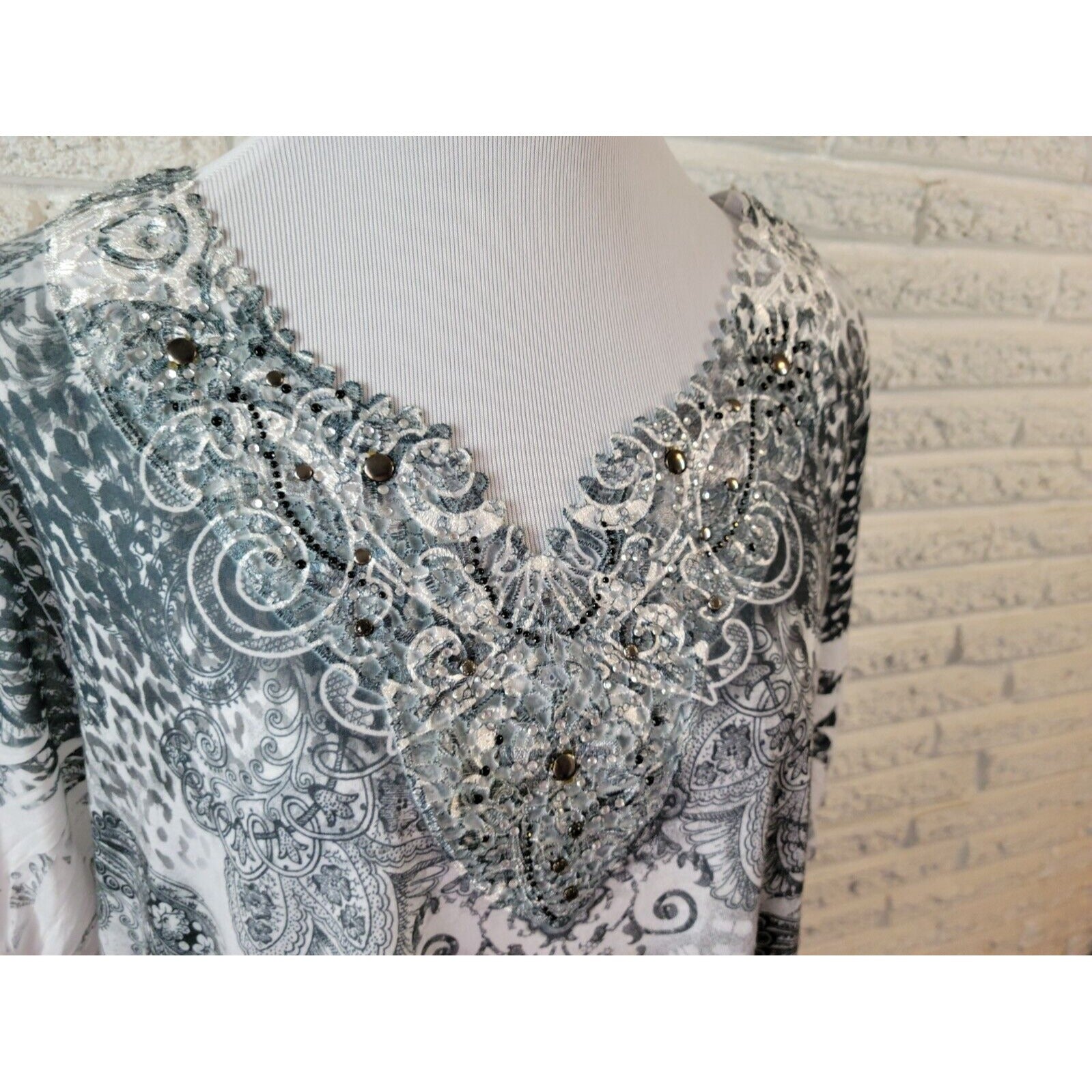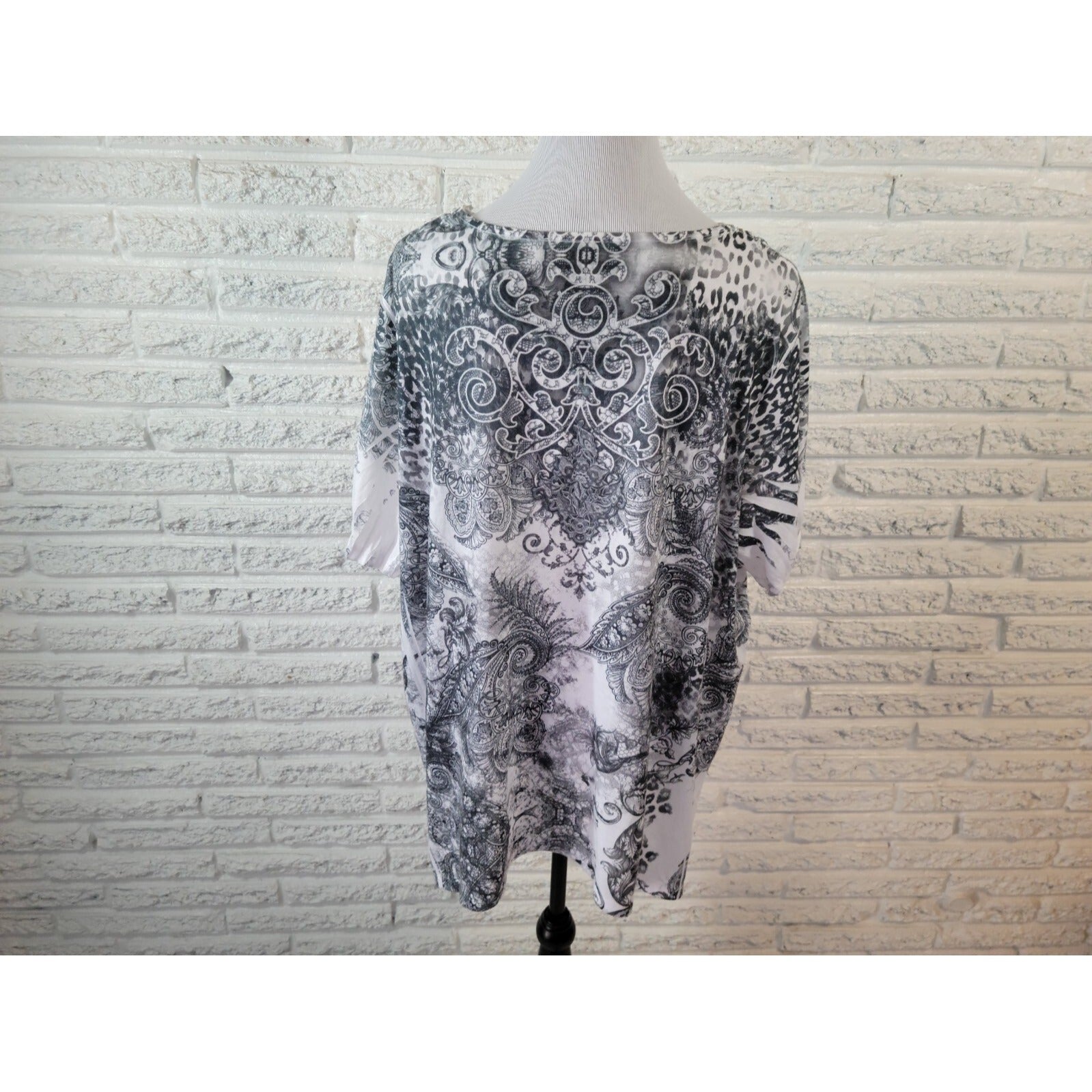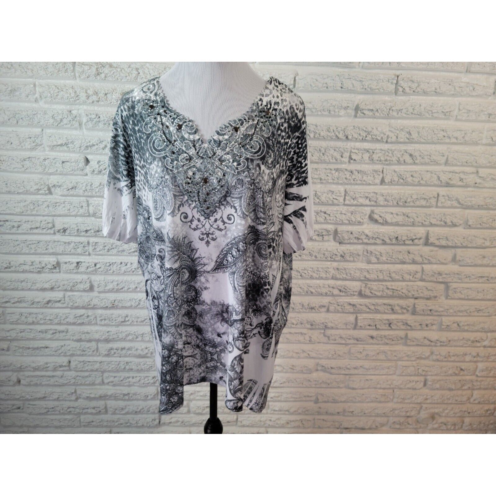 Catherines Liz & Me Womens Top 1X Short Sleeve Rhinestones Beaded Gray Paisley