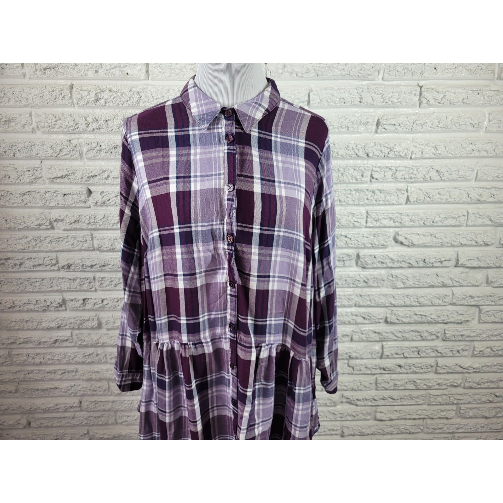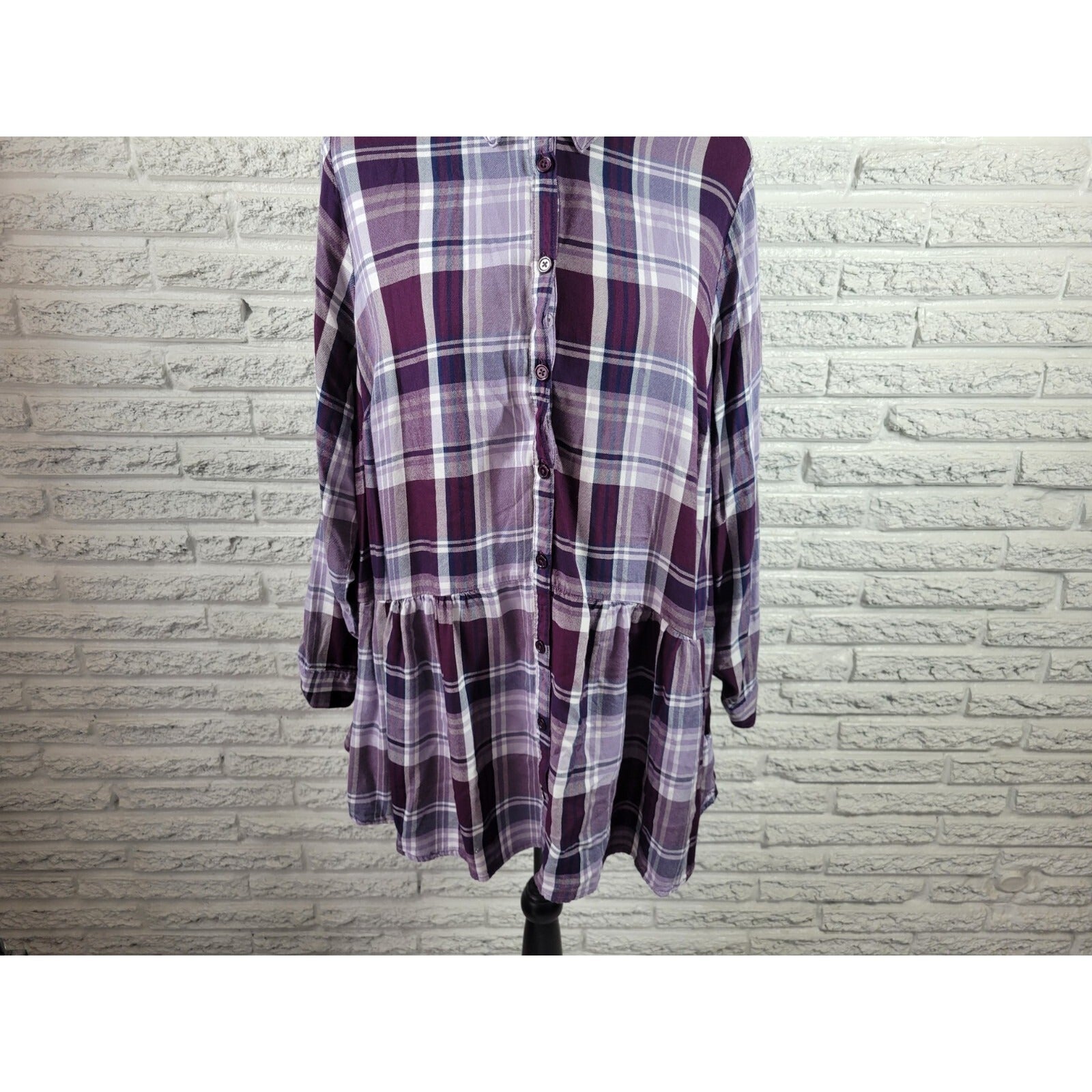 Catherines Womens Top 0X Plus Long Roll Tab Sleeve Purple Plaid Ruffle Rayon