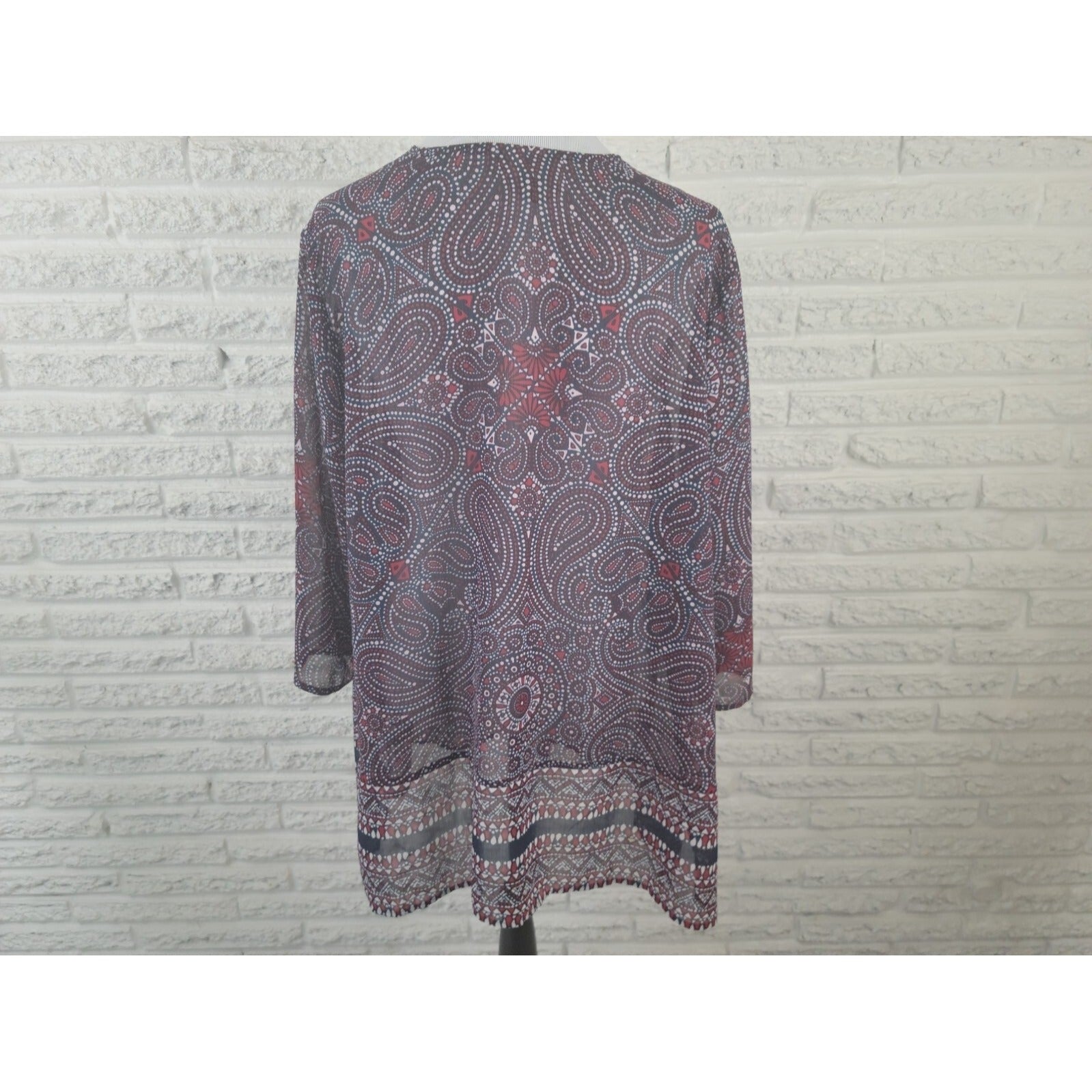 This is a Catherines women's top in size 1X with a blue and red paisley pattern. It has a classic/fitted sleeve type with 3/4 length sleeves and a pullover closure. The blouse is made of sheer polyester material and features an open duster style. It is suitable for both casual and business occasions and is machine washable.  It is a basic style with no additional features and can be worn in all seasons.