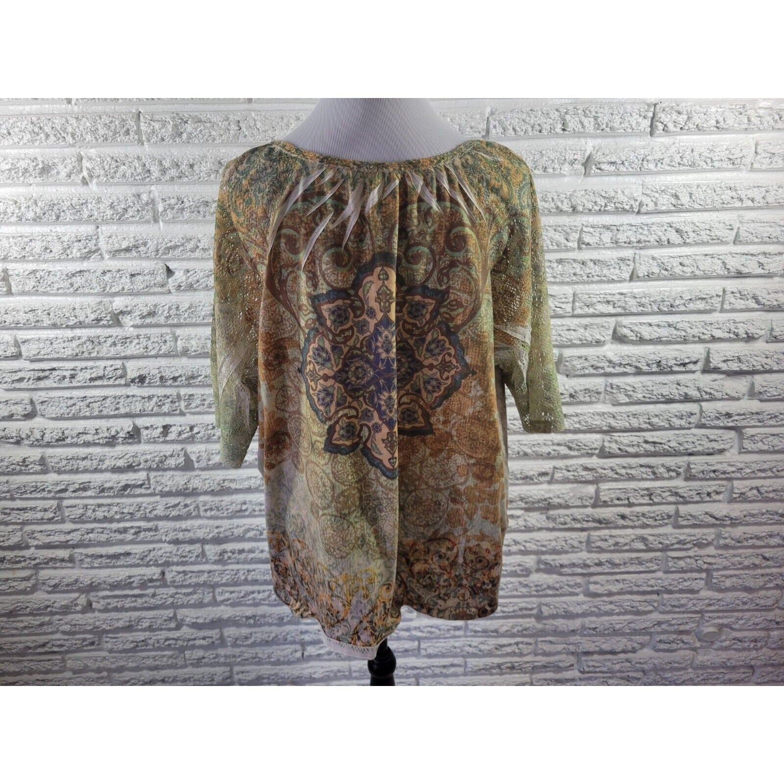 Catherines Womens Top 1X Short Sleeve Tan Mandala Mesh Rhinestone Keyhole Laser