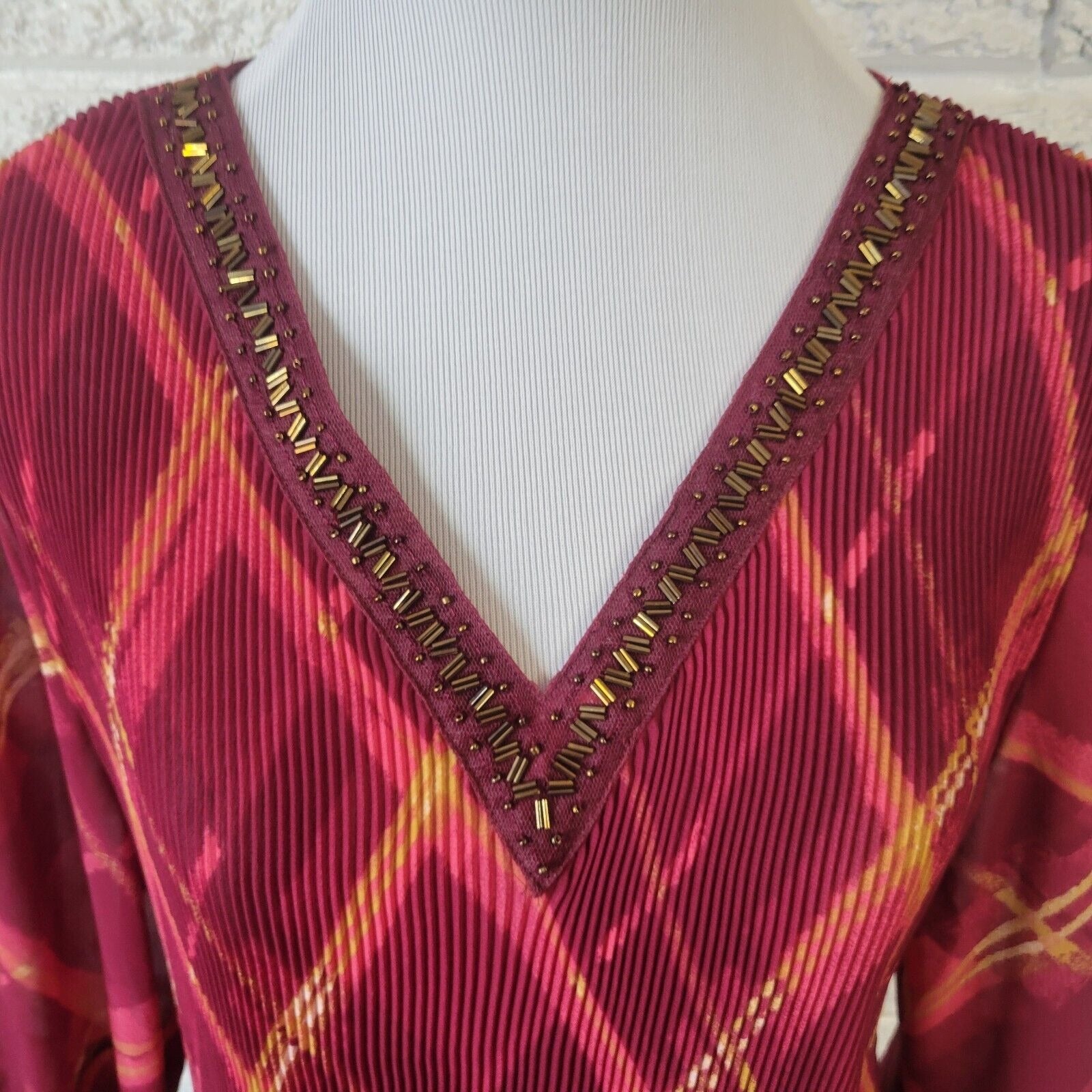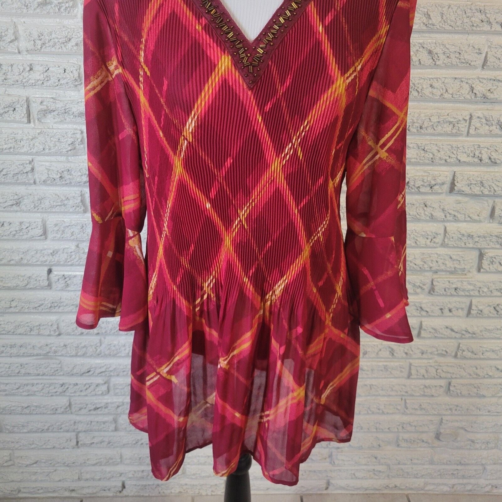 Catherines Womens Top 1X Tunic Bell Sleeve Red Pink Sheer Beaded Lightweight