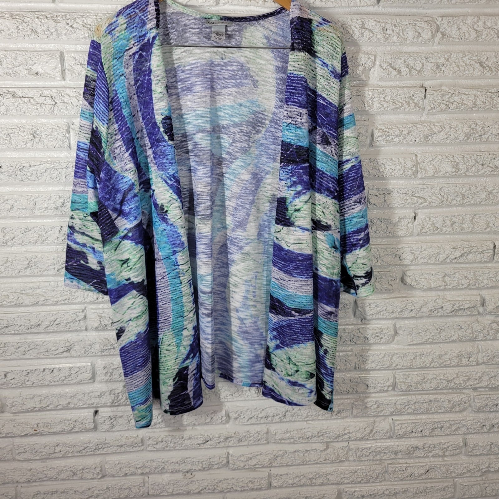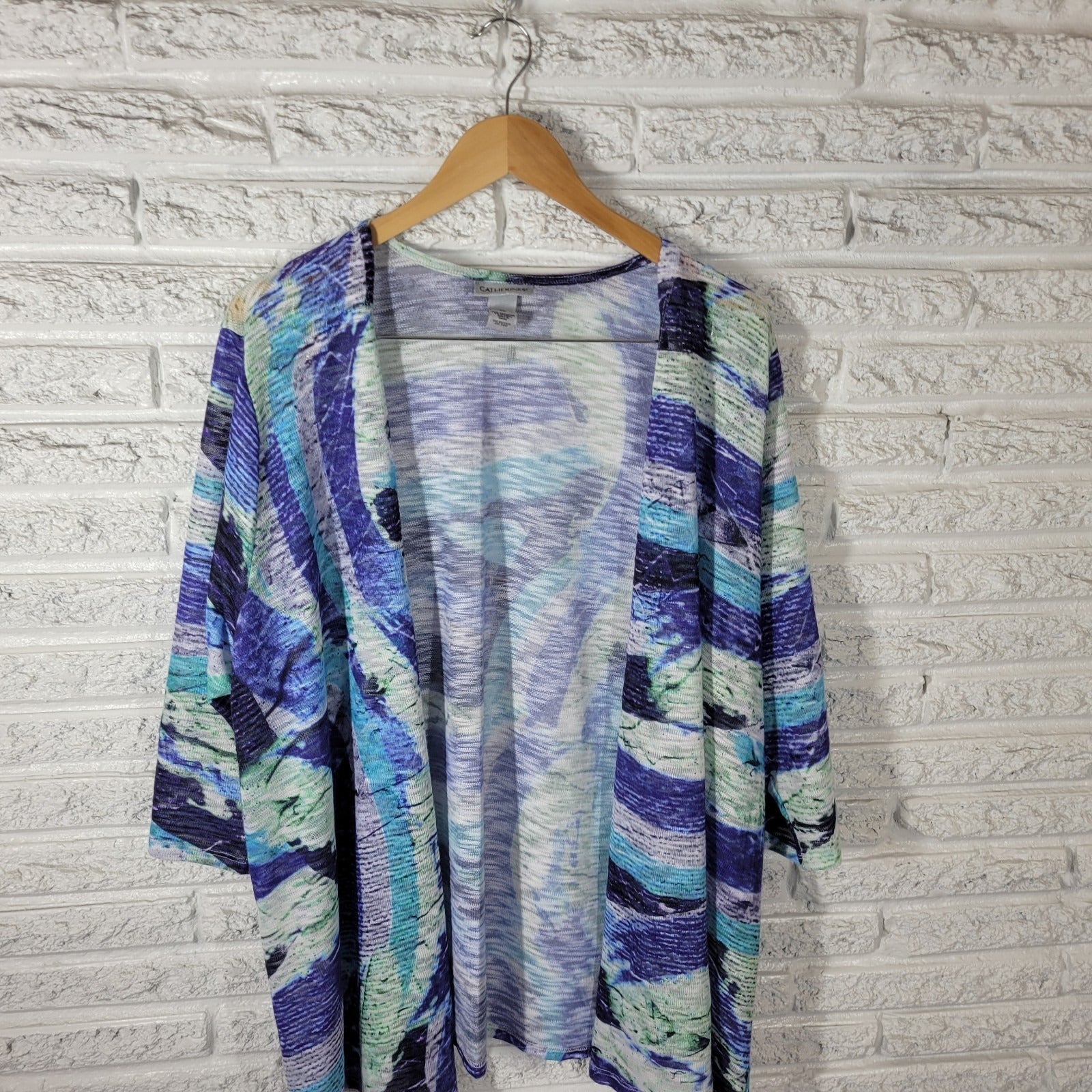 This Catherines women's top is a 3X plus size cardigan in a beautiful blue/green watercolor knit design. The lightweight, stretchy material makes it suitable for all seasons and occasions like travel, casual outings, or business meetings. With 3/4 casual sleeves and an open front, this blouse offers a regular fit for comfort and style. Made from a polyester blend, this machine washable top from CATHERINE'S is perfect for adding a pop of color to any woman's wardrobe.
