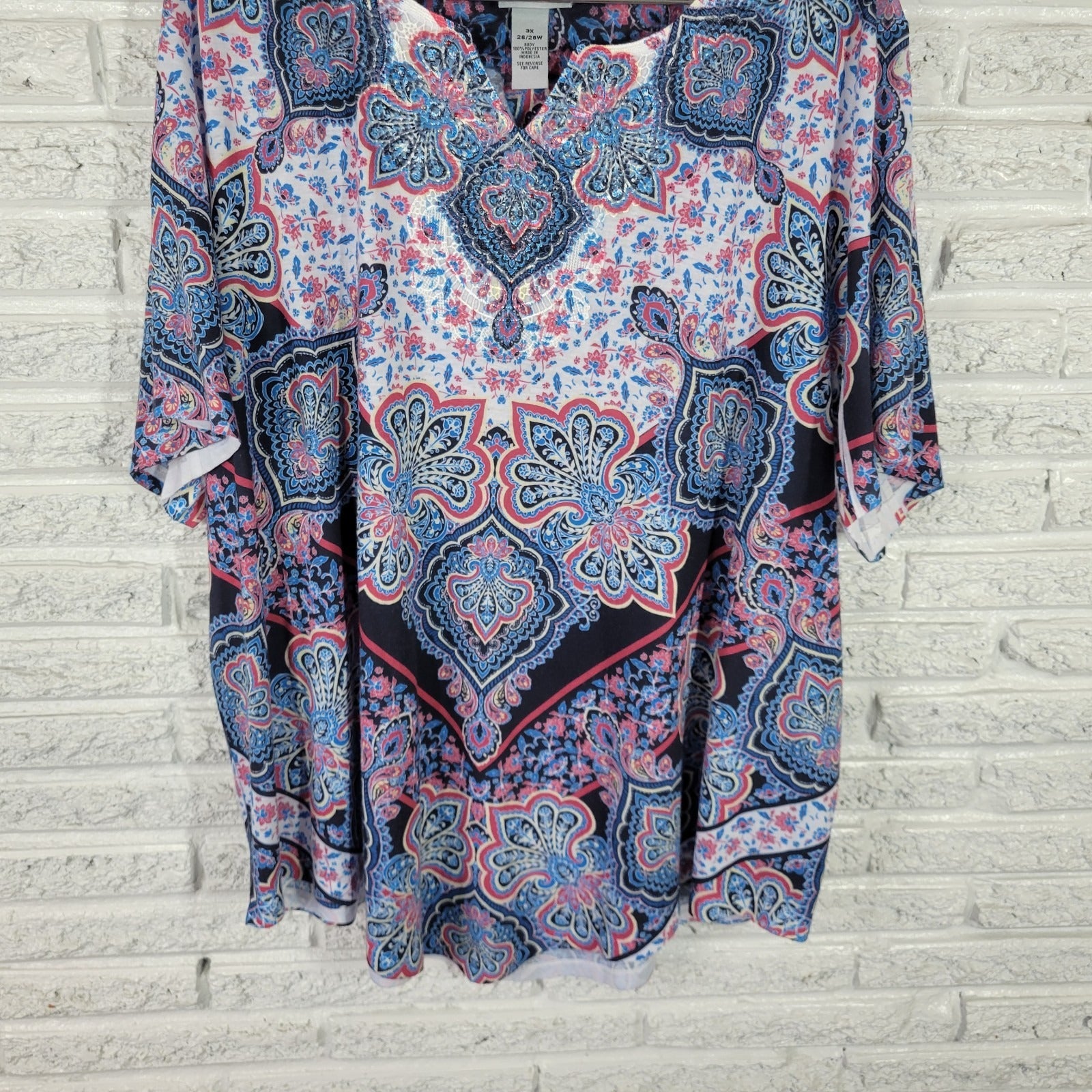 This Catherines Women's Top in size 3X Plus features a blue/pink geometric pattern with a V-neck and short sleeves, making it perfect for casual or travel occasions. Made from polyester and accented with rhinestones, this pullover tunic offers a comfortable and stretchy fit for all seasons. Easy to care for with machine washable instructions, this top from Catherines is a stylish and versatile addition to any woman's wardrobe.