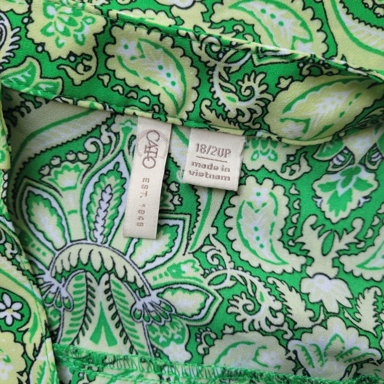 The Cato Est 1946 Women's Top in size 18P/20P is a green floral blouse with a V-neckline and 3/4 roll tab sleeves, perfect for travel or casual occasions. Made of lightweight polyester material, this semi-sheer top features a pullover closure and a regular fit. Ideal for all seasons, this blouse is machine washable and offers a basic style for everyday wear.