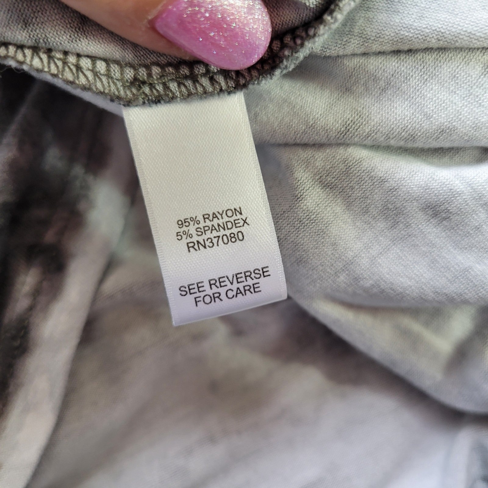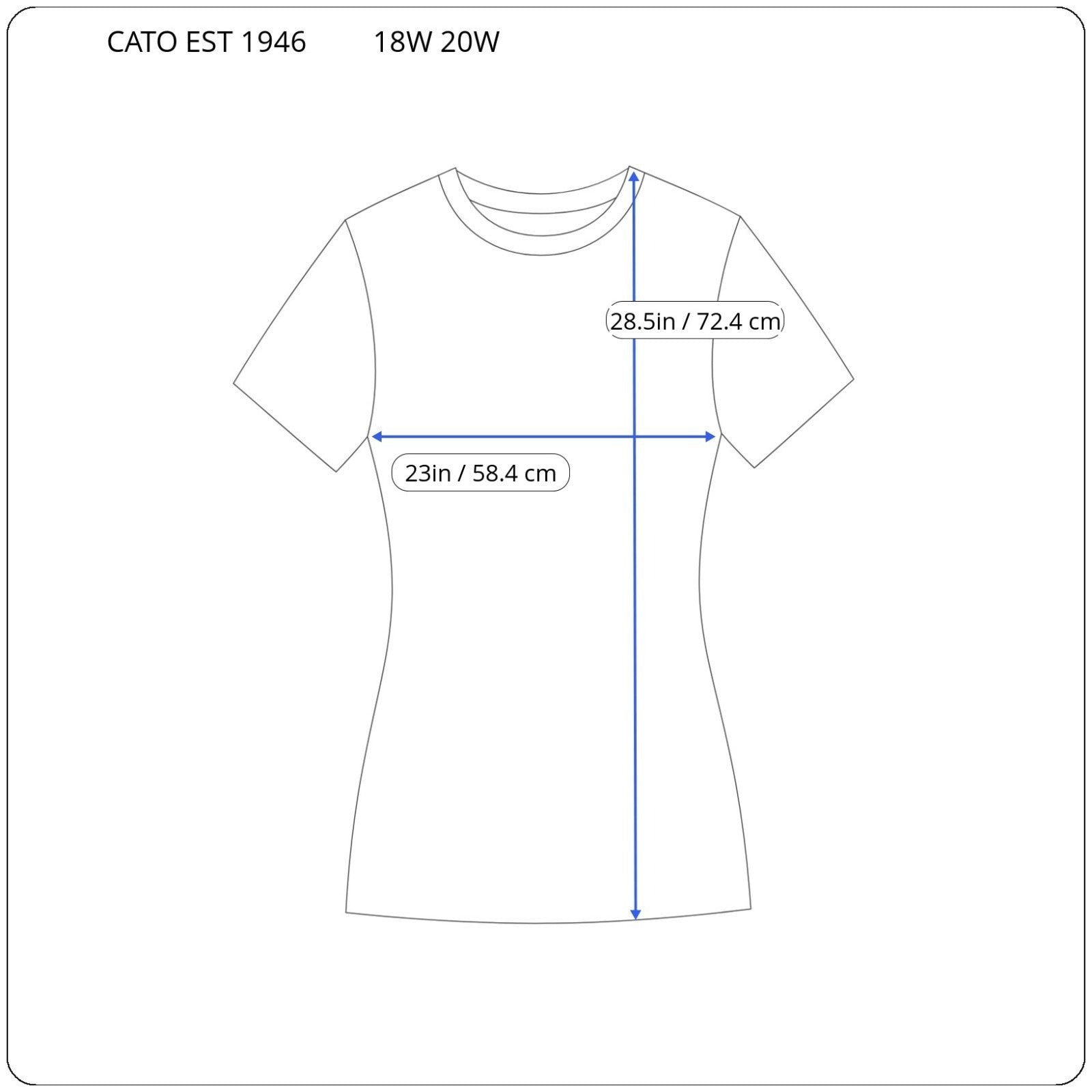 The Cato Est 1946 Women's Top in size 18W /20W is a stylish and comfortable short sleeve tee with a gray/white tie dye lattice neck design. Made from a blend of spandex and rayon jersey fabric, this pullover shirt is perfect for travel and casual occasions. With a regular fit and stretch features, it is suitable for all seasons and can be machine washed for easy care. This basic yet versatile top by Cato is a great addition to any woman's wardrobe.