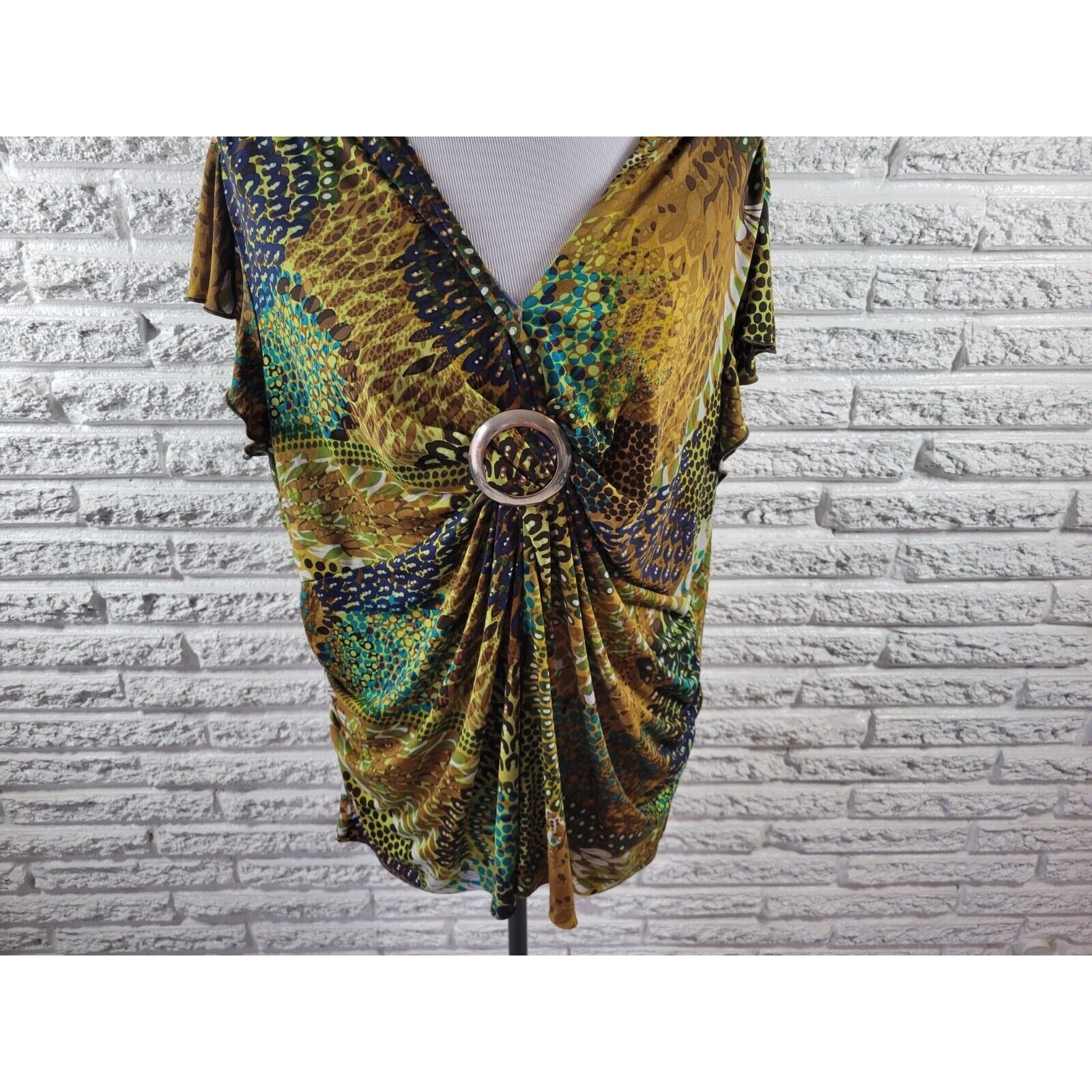 This beautiful Cato top is perfect for any casual occasion. The flutter sleeves and v-neckline add a touch of feminine charm, while the buckle detail adds a touch of sophistication. The top is made of a comfortable and stretchy polyester blend material, making it perfect for all seasons. It's easy to care for with hand wash only instructions. The brown watercolor design is a lovely addition to any wardrobe. Available in plus size 18W, this blouse is sure to become a favorite.