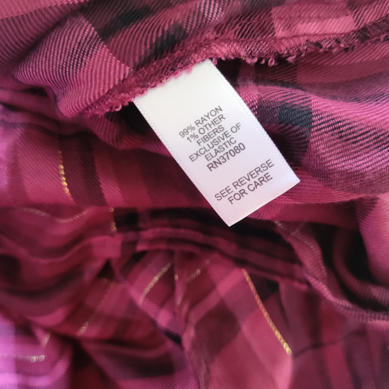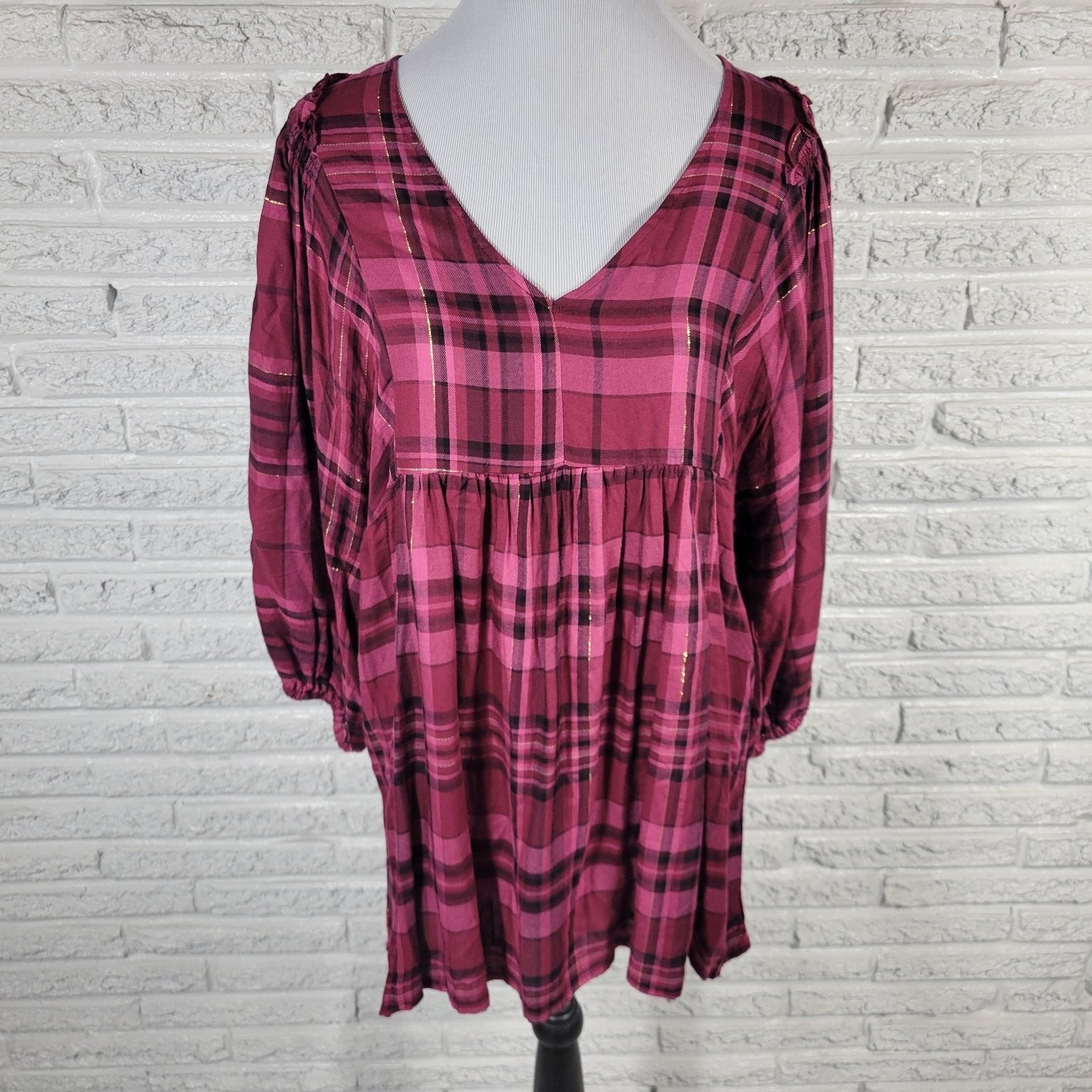Elevate your wardrobe with this stylish Cato women's top, featuring a rich burgundy plaid pattern accented with subtle gold threads for a touch of sparkle. Crafted from a soft and breathable rayon blend (99% rayon, 1% other fibers), this top offers exceptional comfort and a flattering drape that moves beautifully with you. The deep V-neckline adds a feminine touch, while the gathered empire waist creates a flowy silhouette perfect for casual or dressier occasions.Designed with long sleeves that have elasticized cuffs and delicate button details on the shoulders, this top combines classic plaid charm with modern detailing. The lightweight fabric and relaxed fit make it ideal for layering in cooler seasons or wearing alone in milder weather. Whether paired with jeans or a skirt, this versatile piece is a must-have for your seasonal collection.