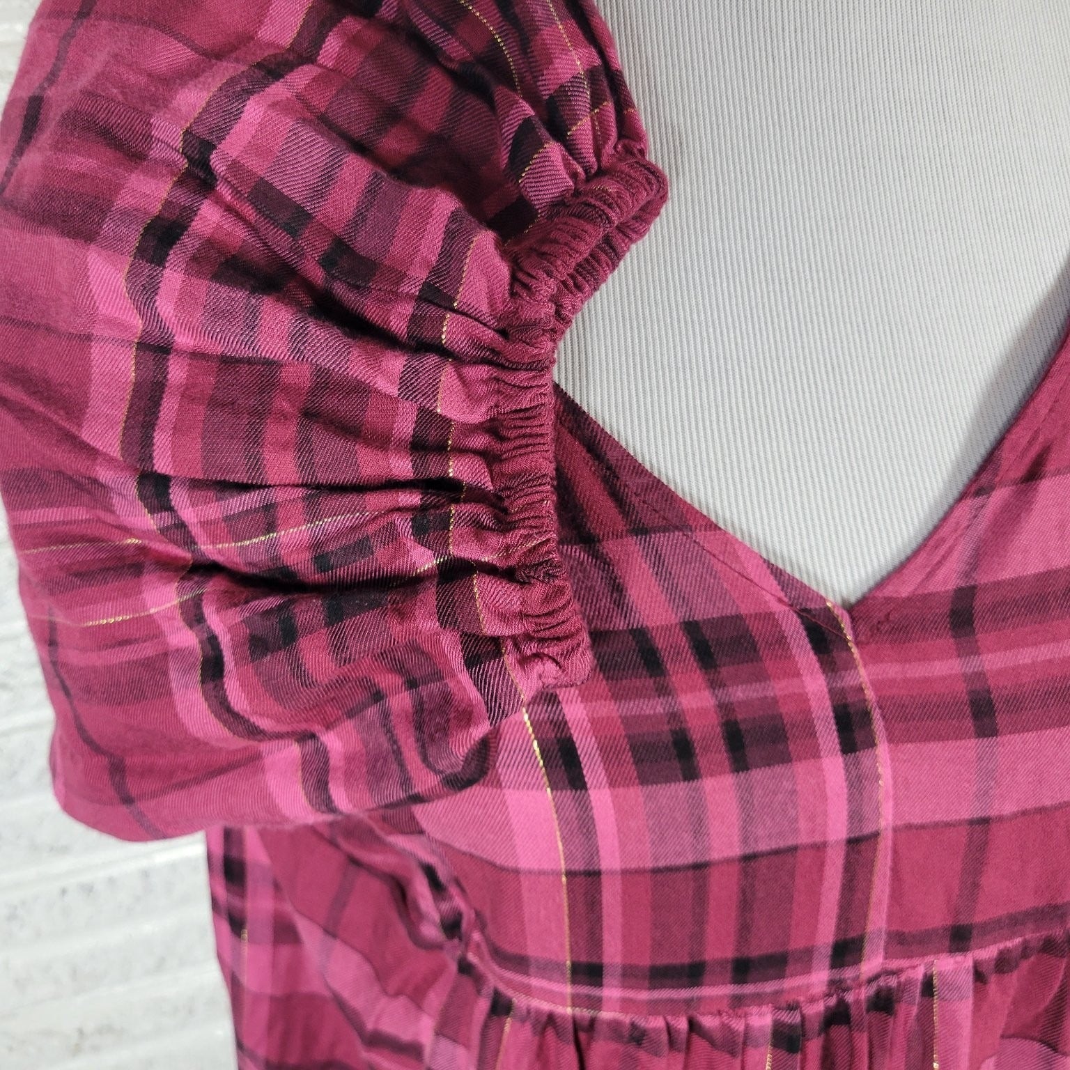 Cato Womens Top XL Peasant Baby Doll Rayon Smocked Button Detail Burgundy Plaid