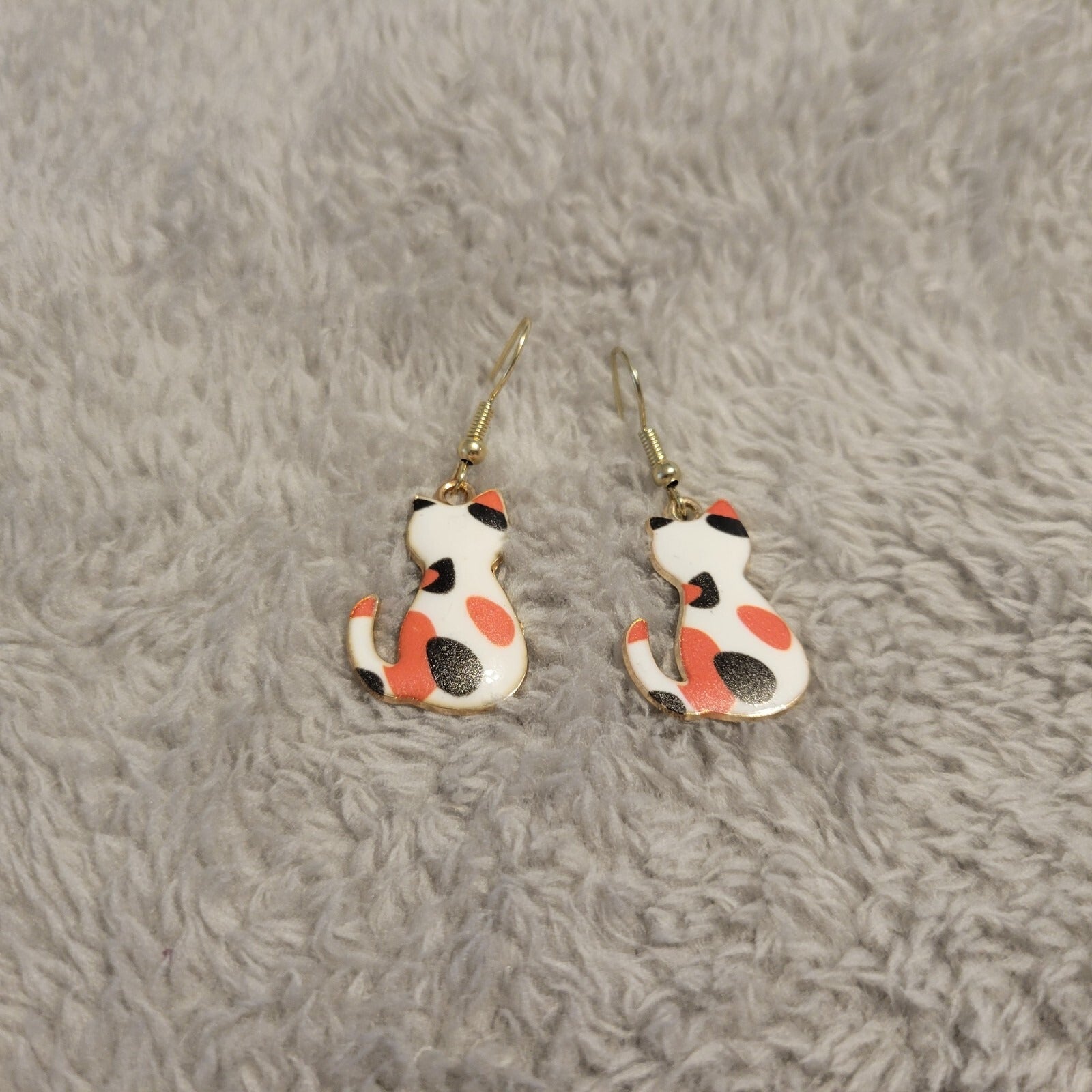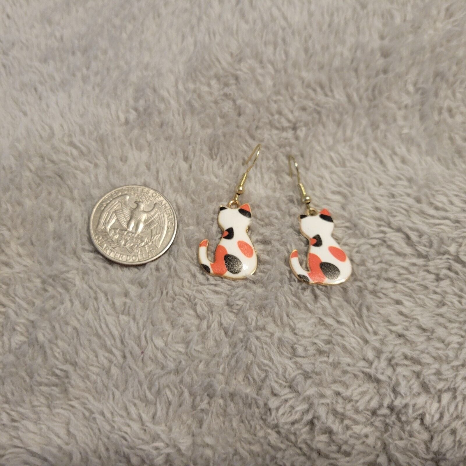 Cats Kittens Calico Earrings One Pair Gold Tone Fish Hook Dangle Hanging Novelty