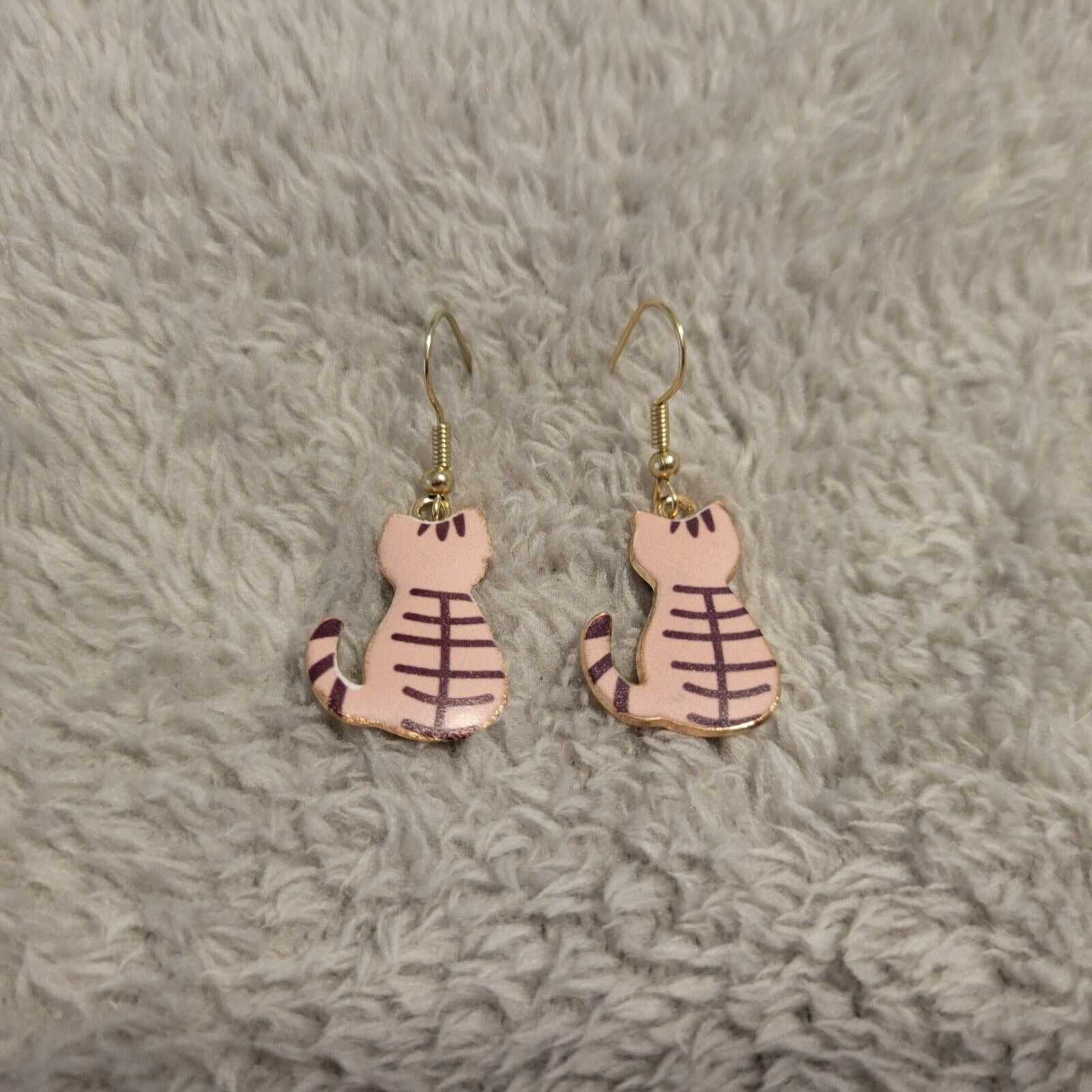 Cats Kittens Tabby Earrings Beige One Pair Gold Tone Fish Hook Dangle Hanging